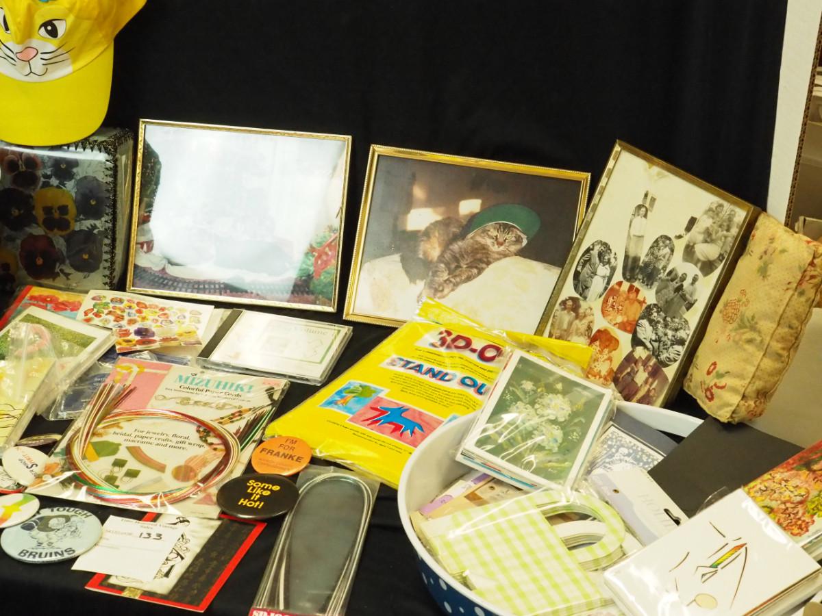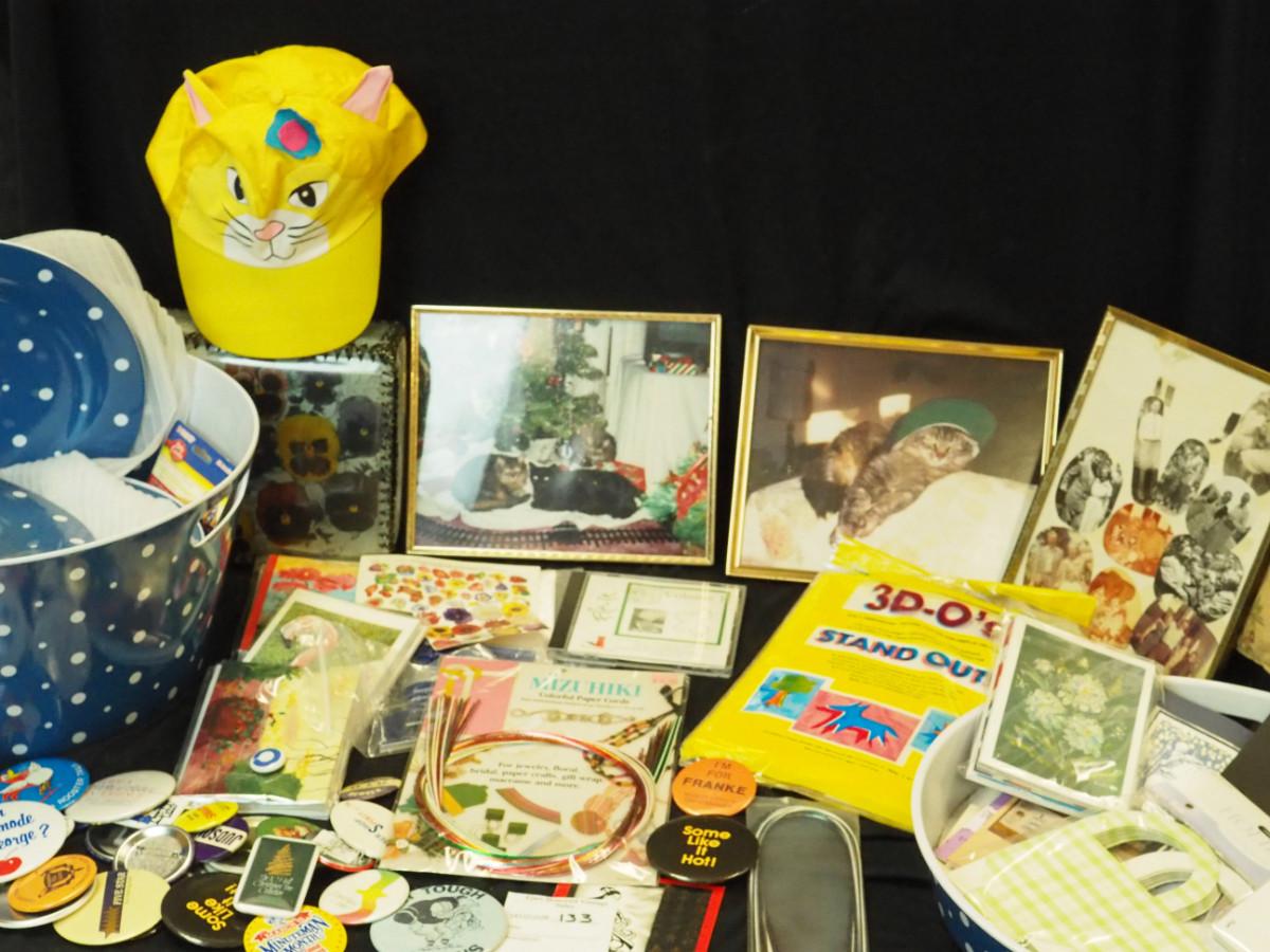 Lot 133: Picnic stack blue and white polka dot. Pansy card box, Cat pictures. Cat hat, Bag of label pins/buttons, new vintage greeting card packs, fancy Asian craft cords. Stickers.