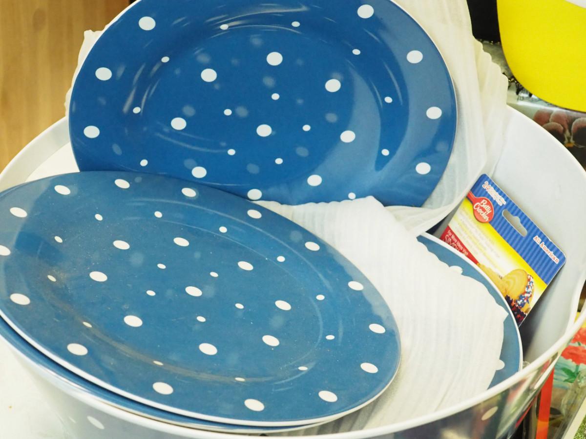 Lot 133 Picnic stack blue and white polka dot. Pansy card box, Cat pictures