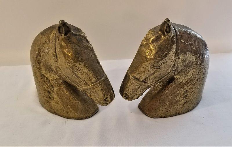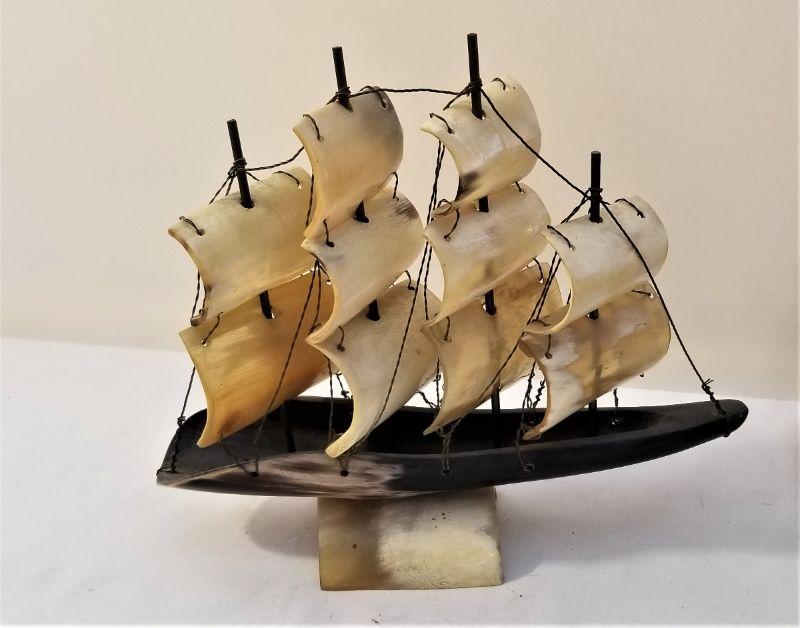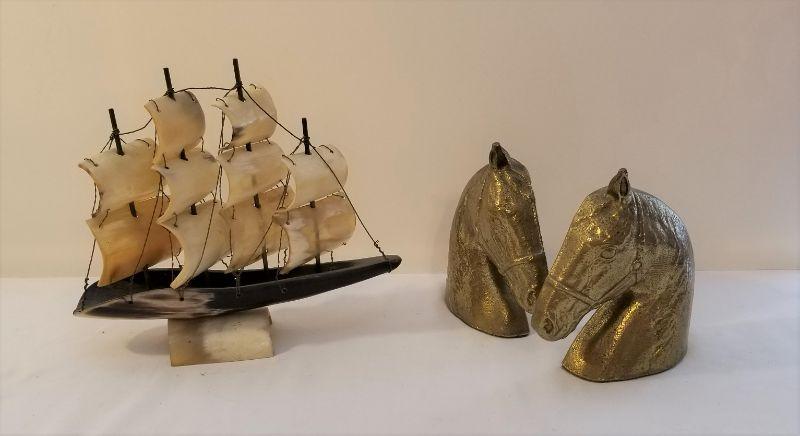 Vintage model of a sailing ship made of HORN - heavy pair of brass bookends in the form of horse heads. Ship is 7" tall, 9" long. Bookends have no mark - solid brass, very heavy. 4" across at base, 5.5" tall at tallest point.