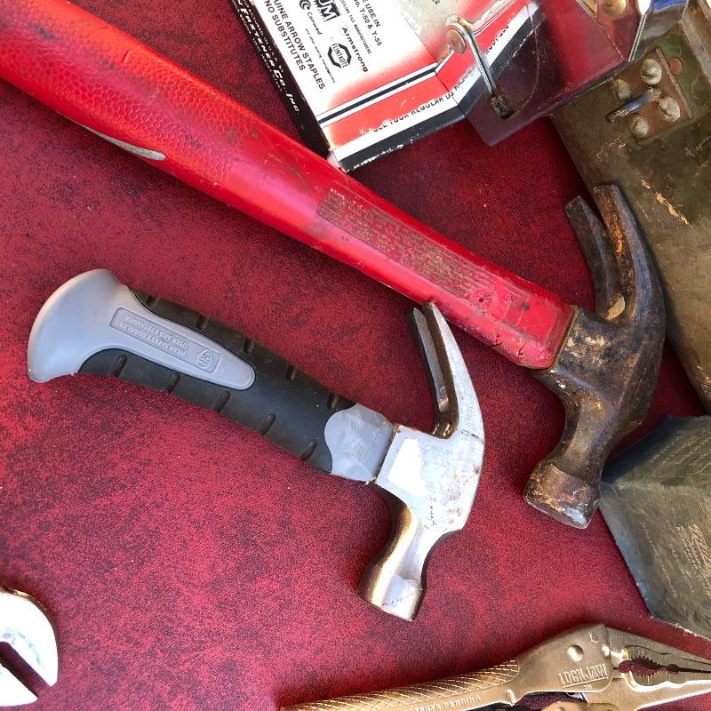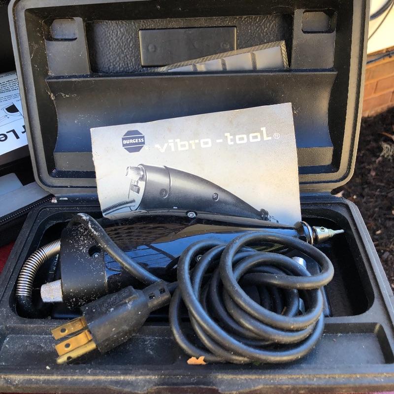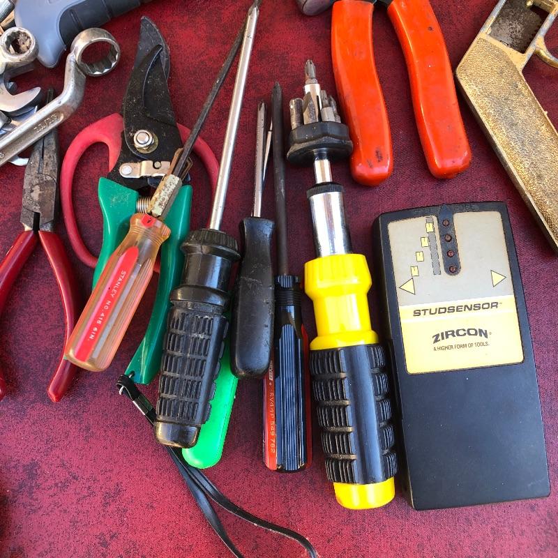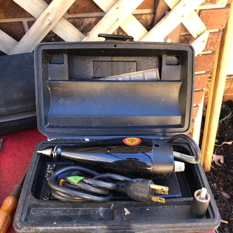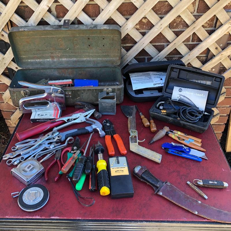This lot has so much to offer! The staple items are an Archer Vibro-Tool (plugged in and tested), which can be used for many purposes such as etching into leather and glass, as well as a Mini Laser Level. It also comes with a large metal toolbox (19” x 7.5” x 6”) that contains nearly every tool under the sun, from wrenches to screwdrivers to a staple gun. Along with the toolbox, this lot contains three small pocket knives, as well as a larger curved knife that comes with a sheath. Local pickup only.
