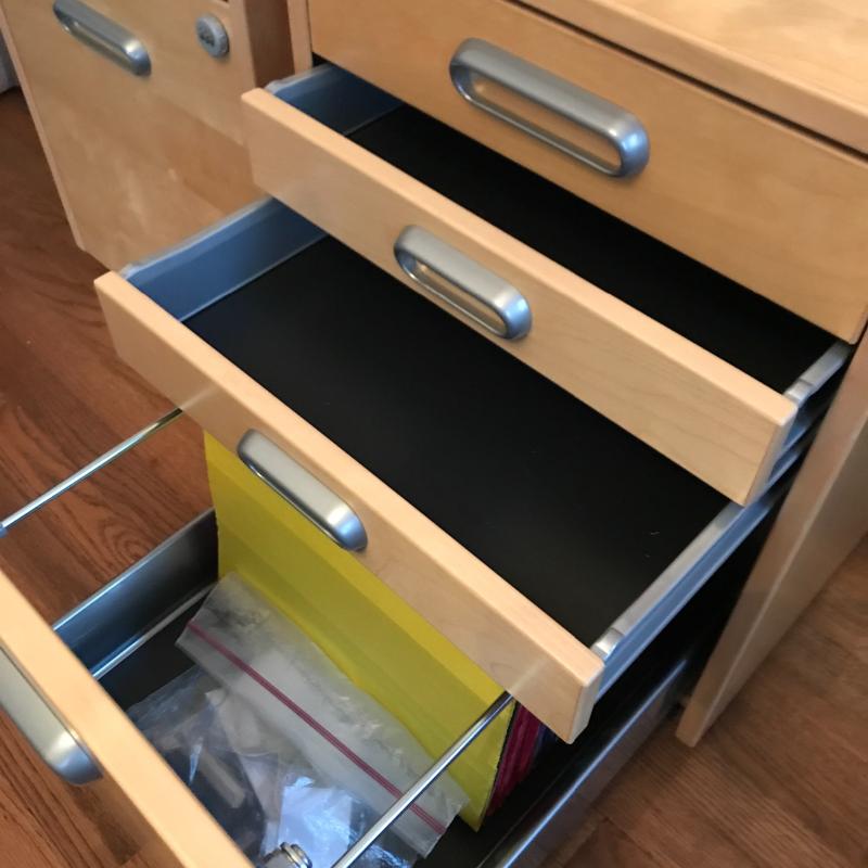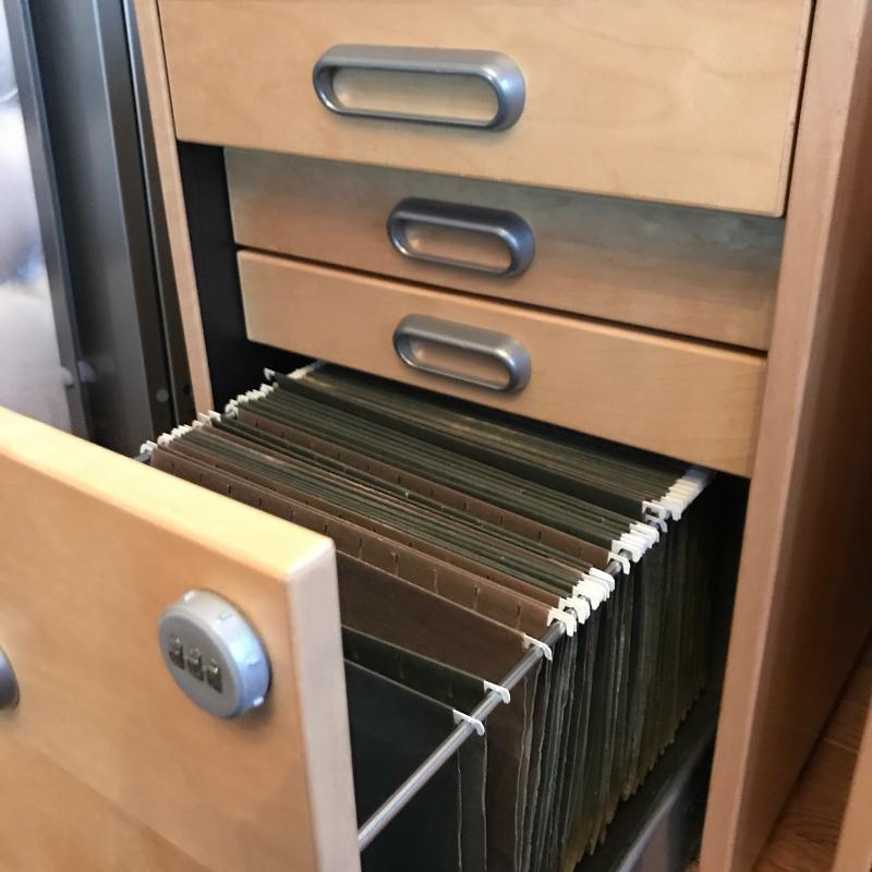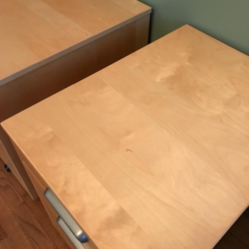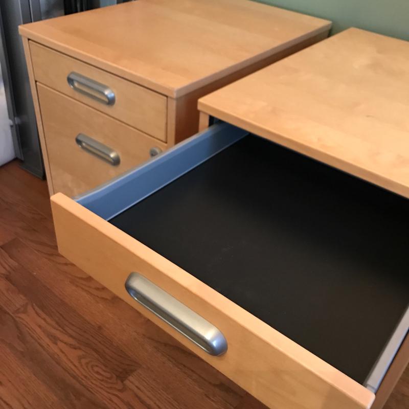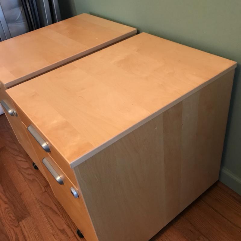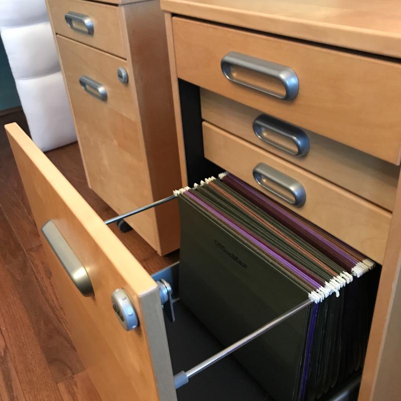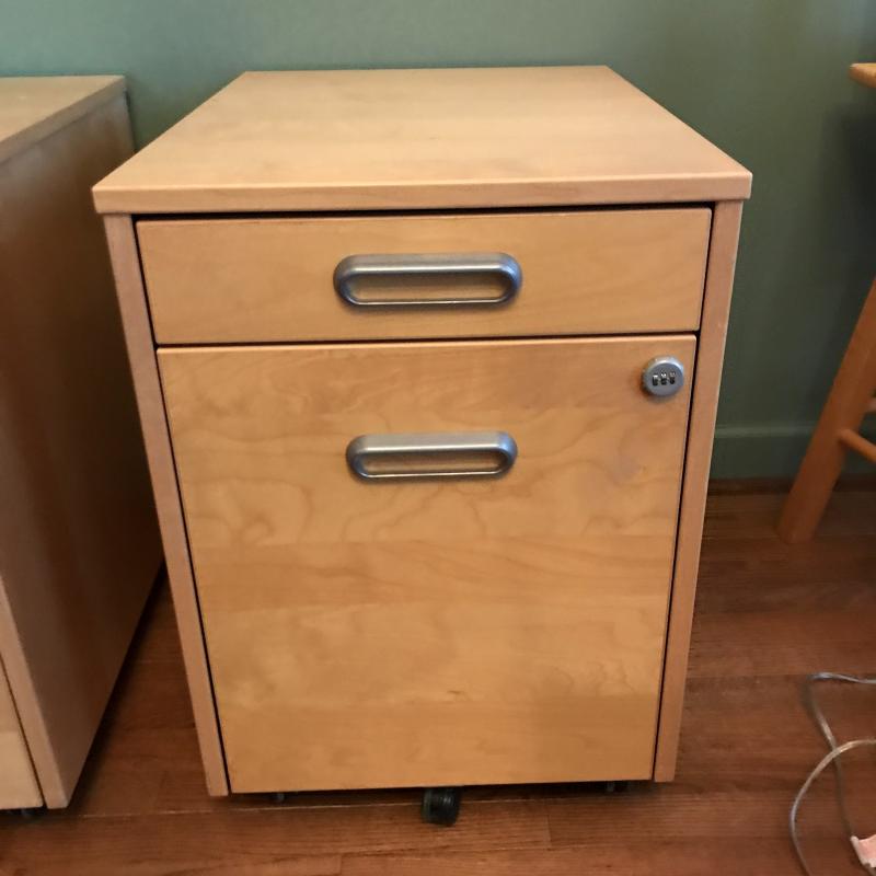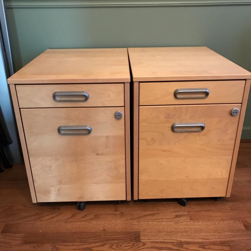 Two gorgeous matching light wood rolling filing cabinets. Each cabinet has hanging file drawer as well as one exterior drawers and two interior drawers for extra storage. Locks by code. Excellent condition. Comes with assorted hanging files and tabs. Each measures 24.25”l x 18”w x 25”h. Color matches tall file cabinet in Lot 140. No shipping. Local pick up only in a Flat Rock, NC.