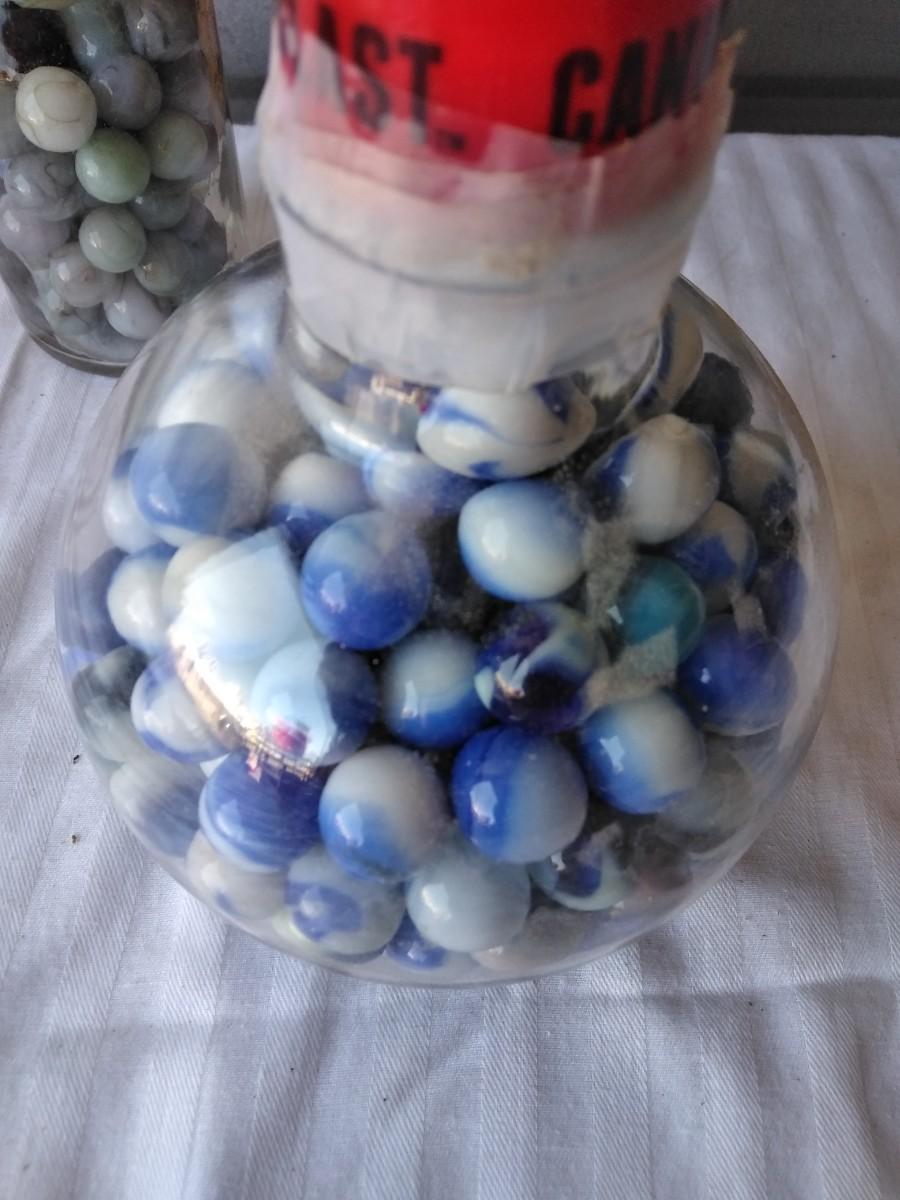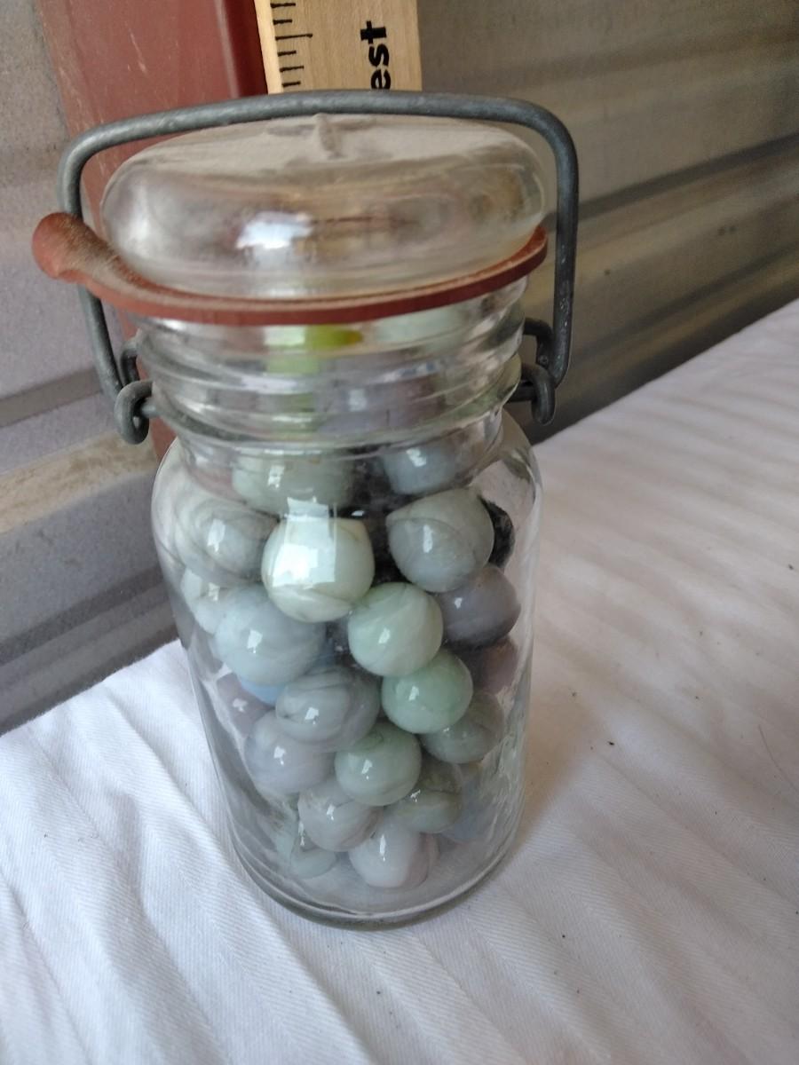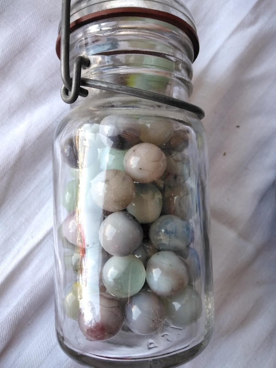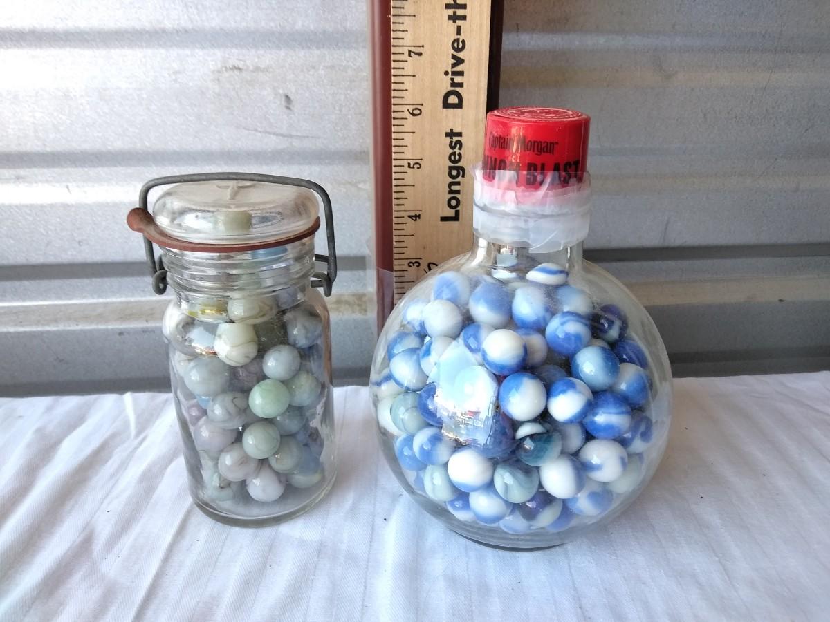 TALK ABOUT A COLLECTION OF MARBLES! TWO GLASS JARS WITH MARBLES!