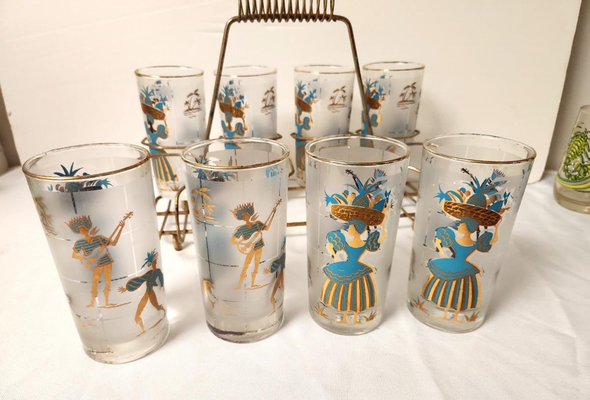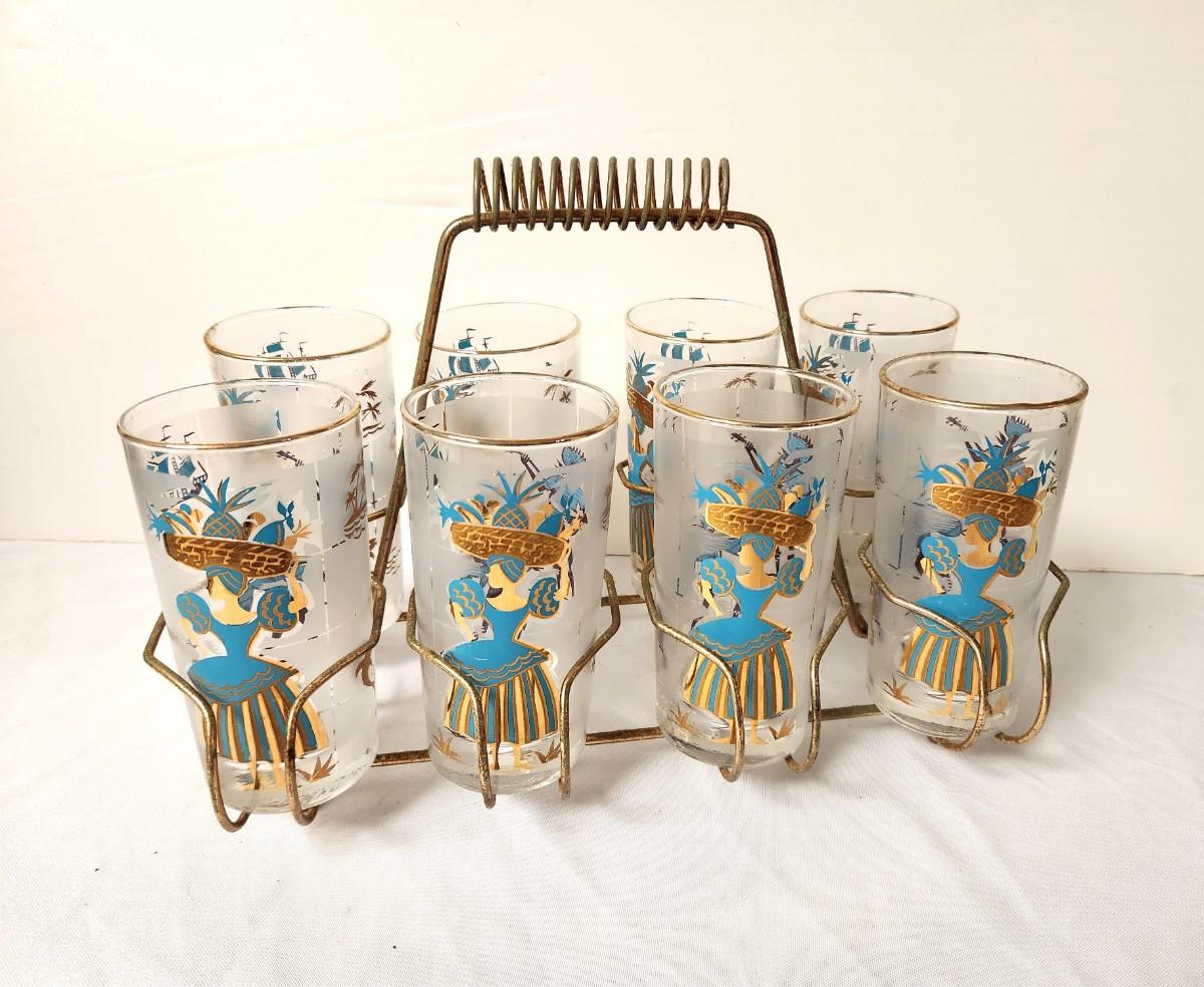 These glasses are MINTY and quite rare! Libbey Calypso "Carribean Cruise" pattern set of 8 in the original carrier. Signed. Each is 5.5" tall.