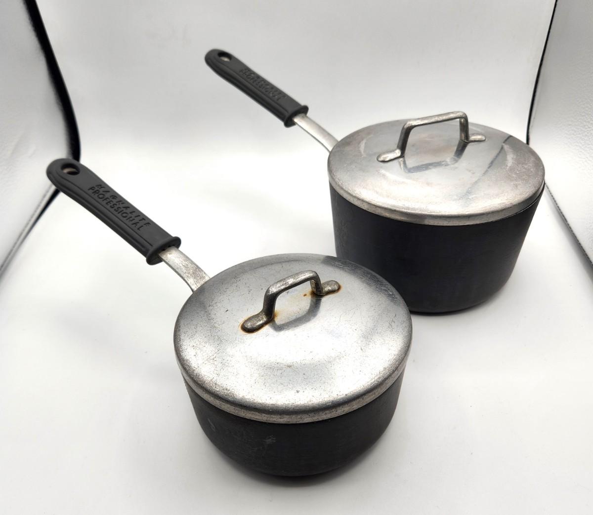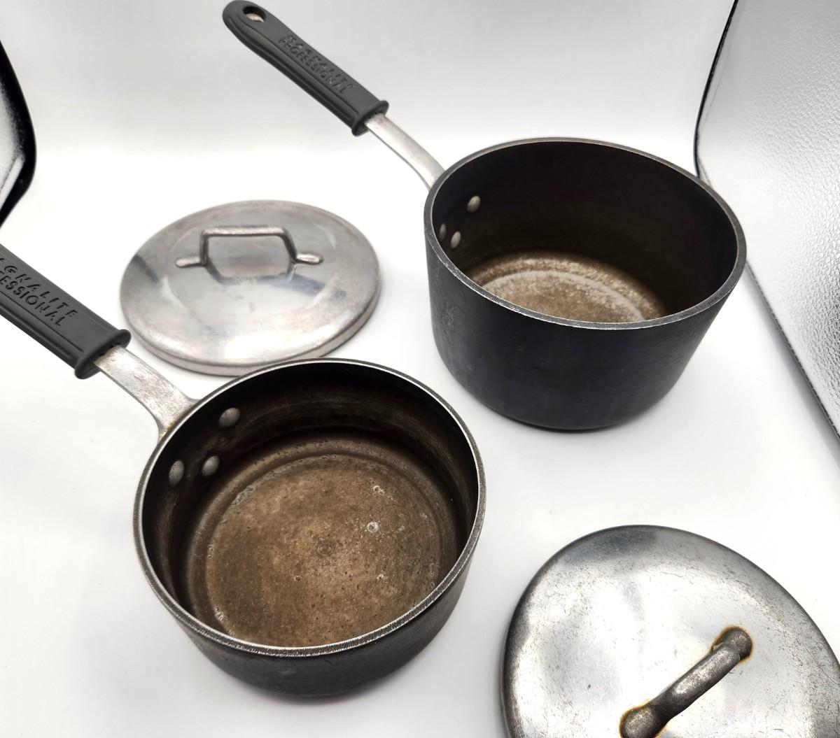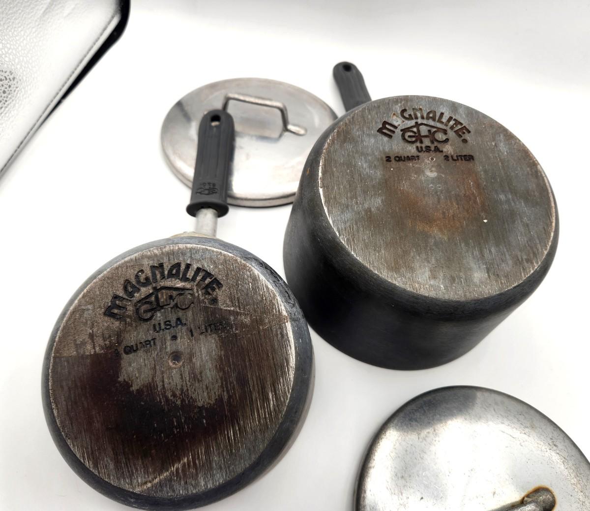 Pre-owned Magnalite Saucepans with lids and handle guards. 2 quart/1 quart. These have been used but still have a lot of life left in them.
