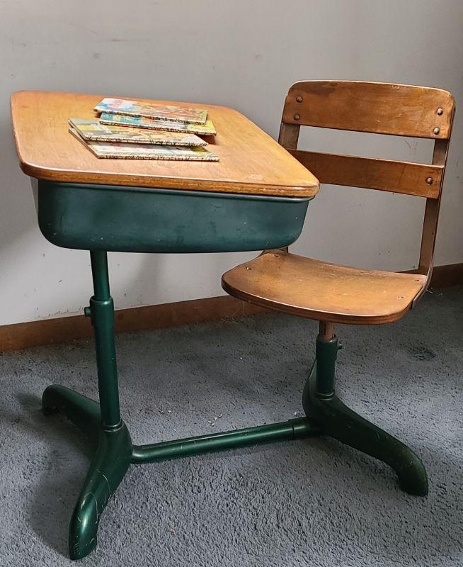 This vintage piece is still solid and functional, but does need cleaned. The desktop is 24 inches across and the chair is 29 inches tall. Children's books included. Please see all pictures for content of the lot, condition of the lot, and measurements if taken. Pictures are the best representation of the items listed and items are untested unless indicated in description. Thank you for looking and have fun bidding!