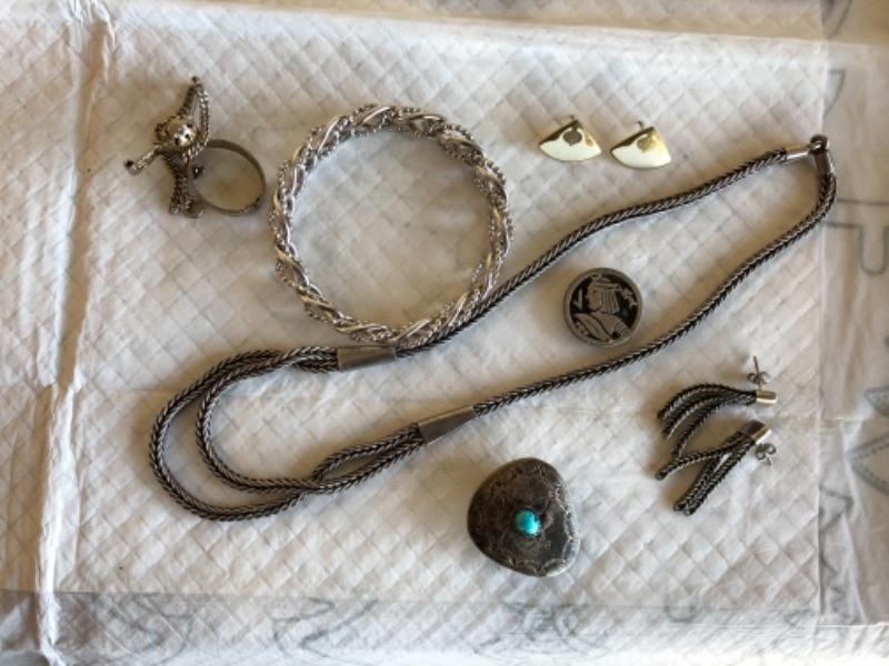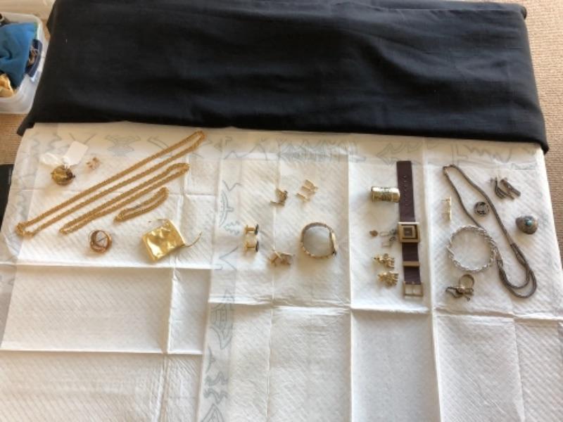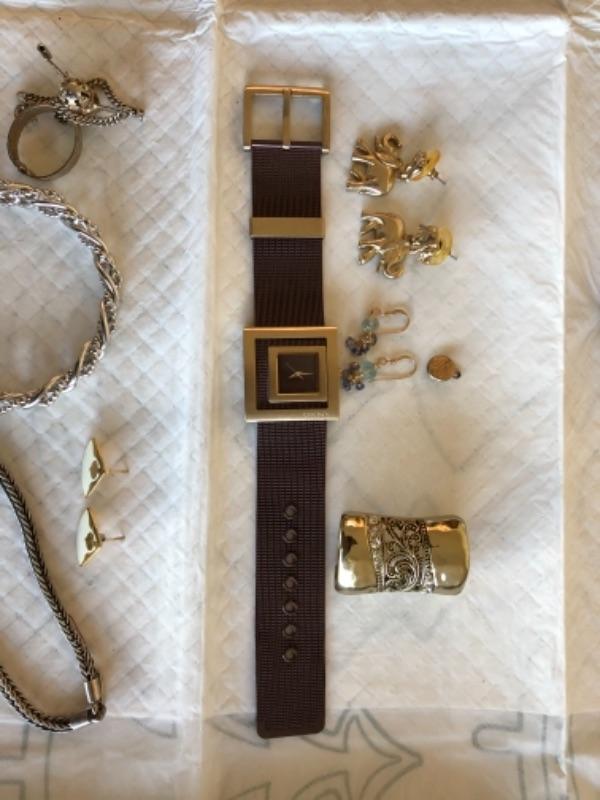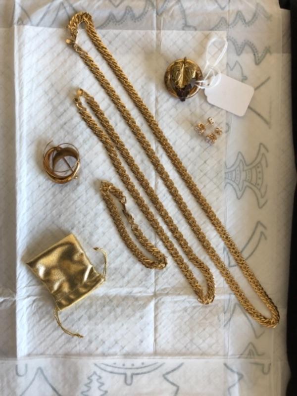 Lot 133U. Gold-filled chains, earrings, watches, cufflinks, brooch, DKNY watch, silver chains bracelets, bolo tie slide, glove clip and earrings“”$45