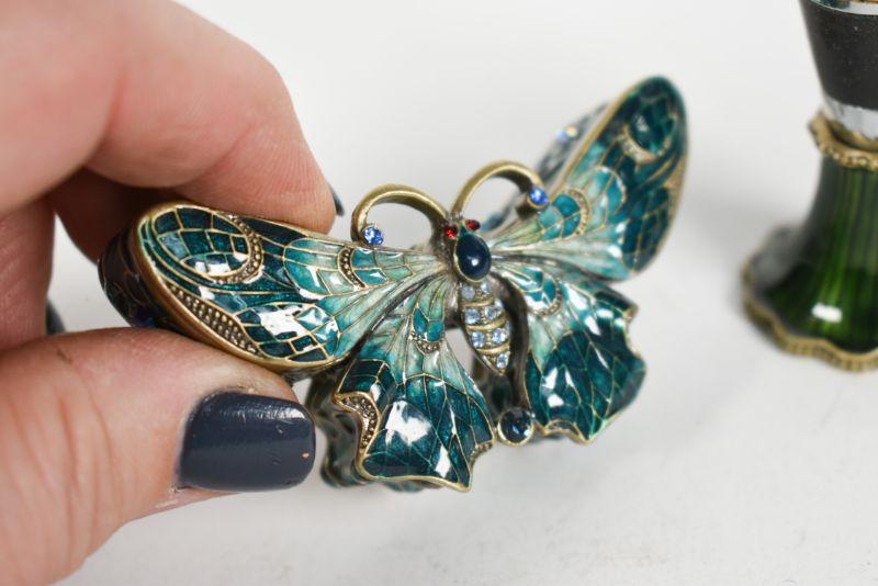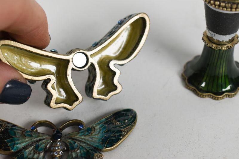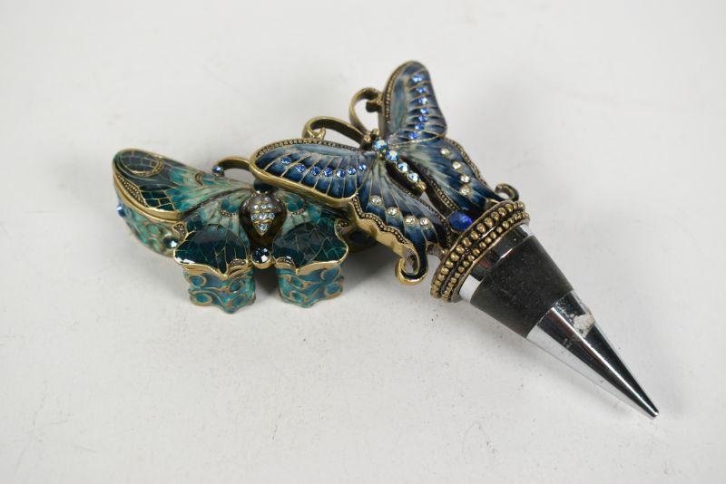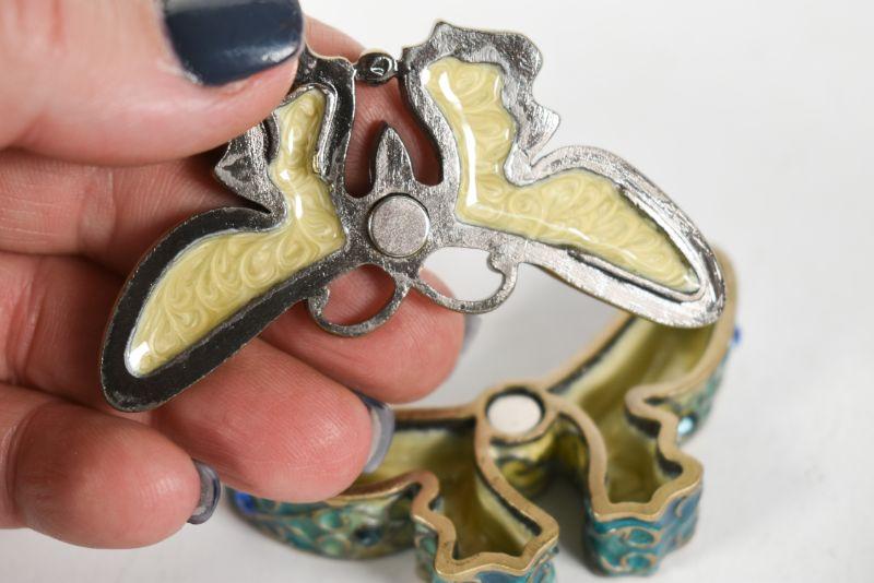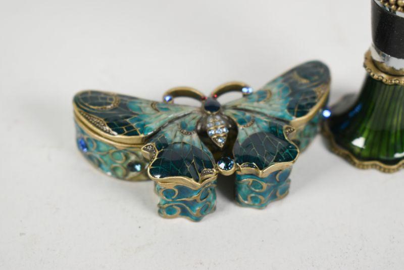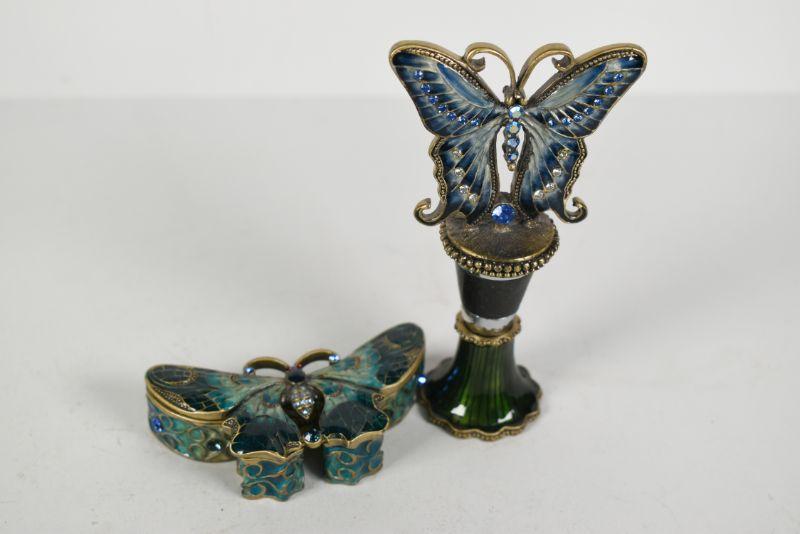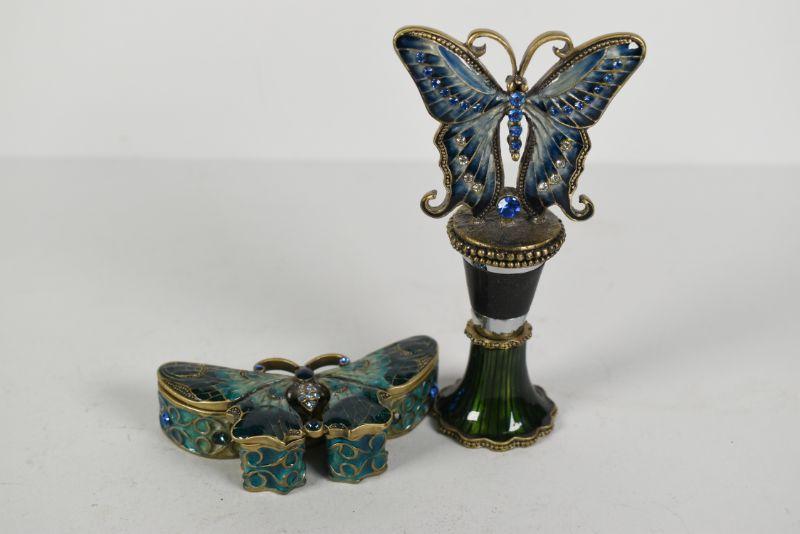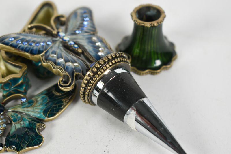 Enameled brass wine stopper and trinket box. Both have rhinestones. **Please read Terms and Conditions before placing a bid. Pick up is Sunday, December 22 from 11am to 3pm or Monday, December 23 from 4pm-7pm in Mantua, NJ. All sales are final. All sales are as is, where is. Please review all photos. Props are not included. Measurements are approximate.