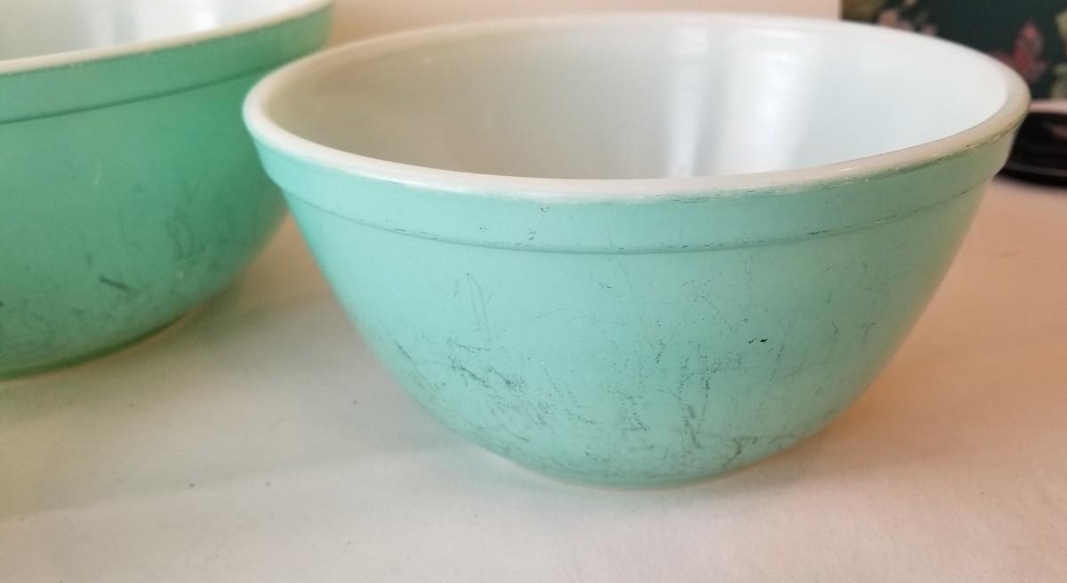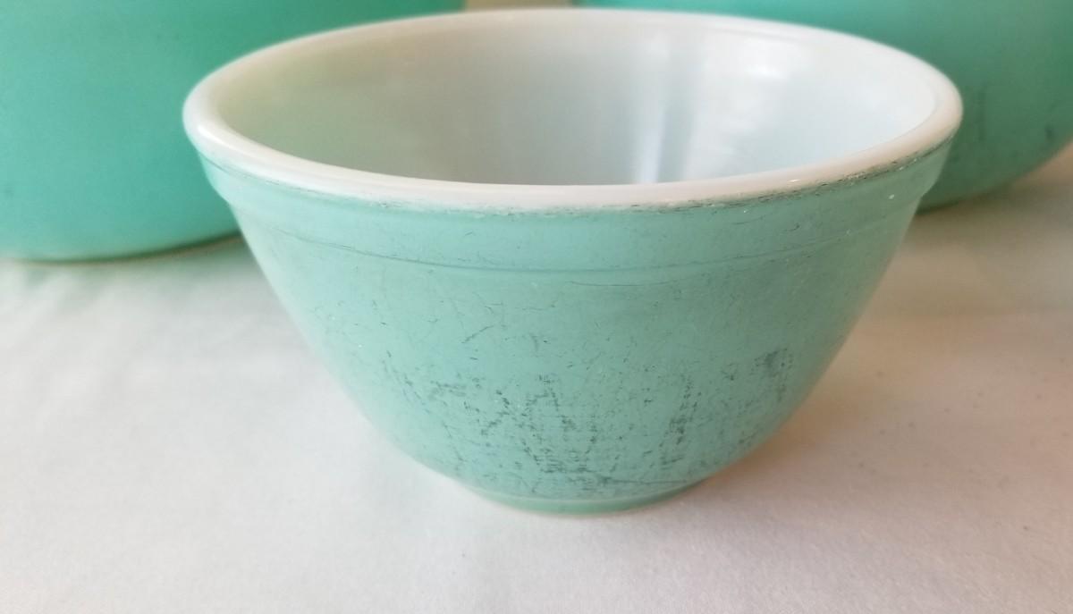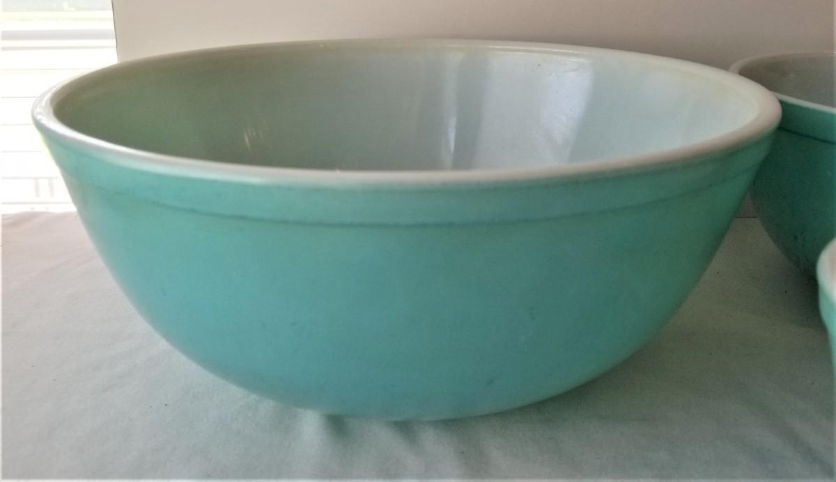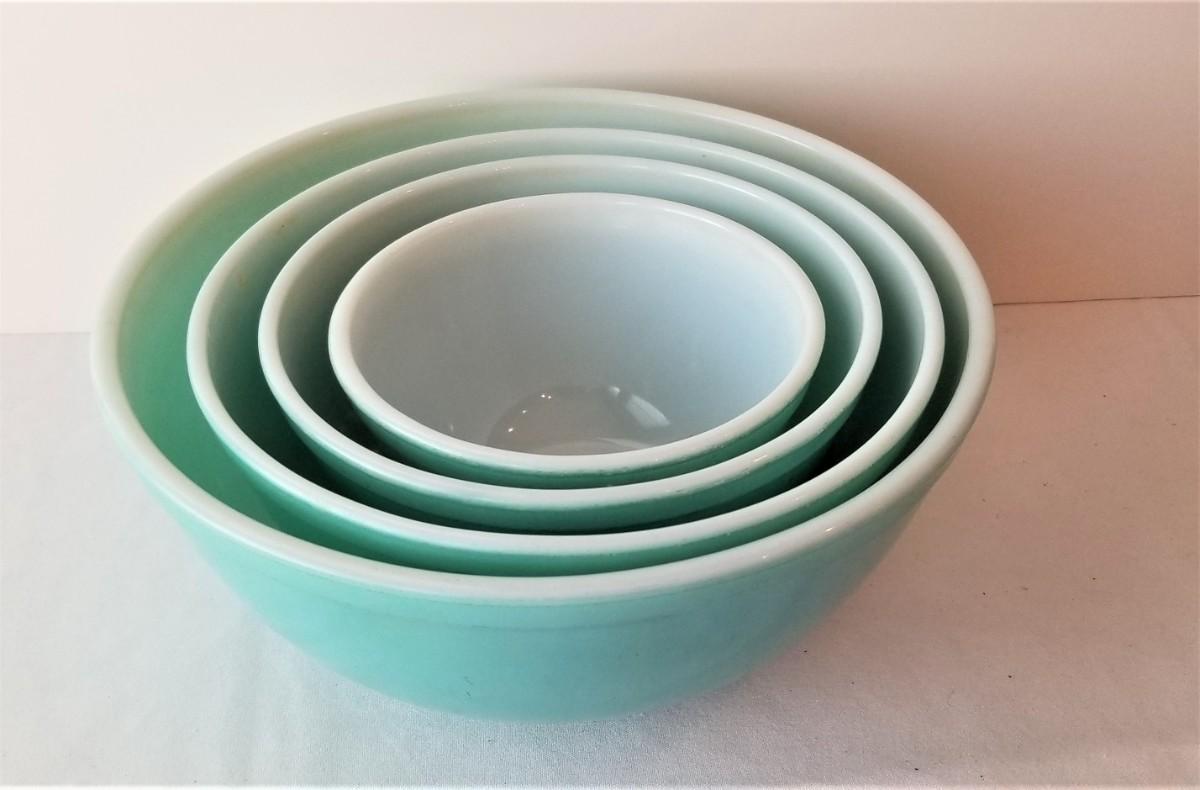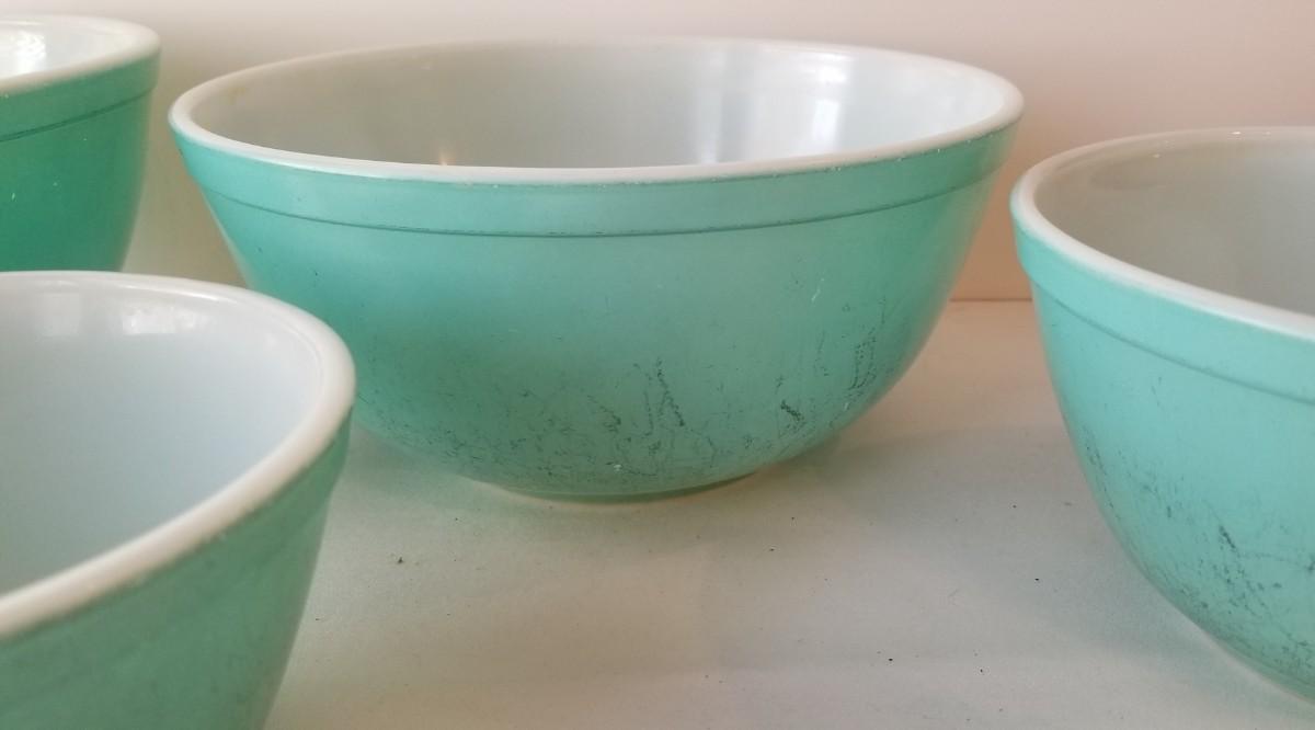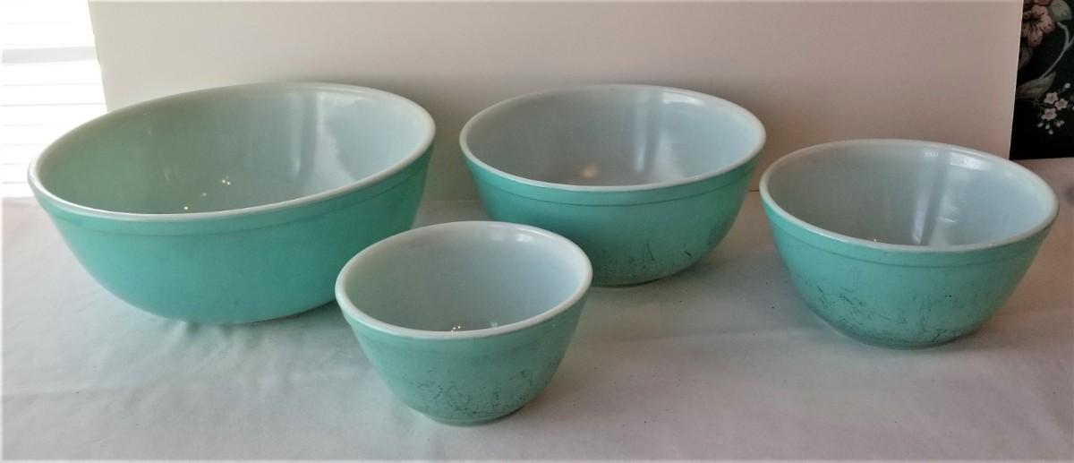 4 piece set of vintage Aqua/Teal Pyrex mixing bowls. No chips. 401-404 size. These have been used and need some love, as shown. Largest is 4.5" tall and 10.5" across.