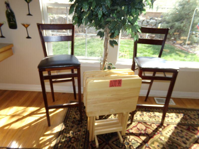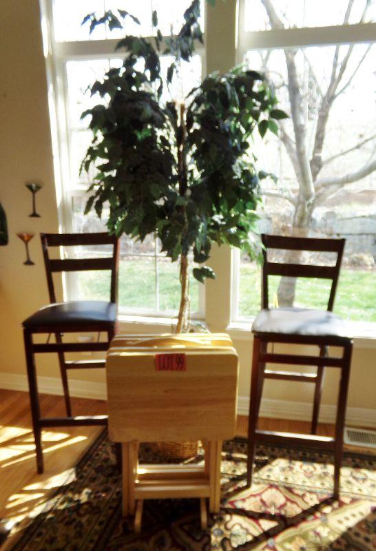 FAUX TREE AND 2 FOLDING BAR STOOLS