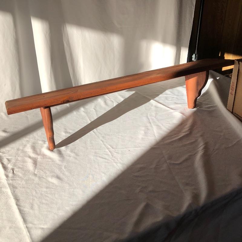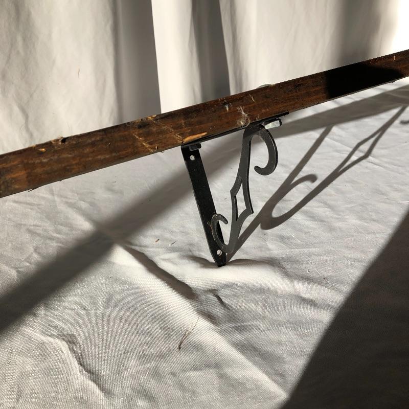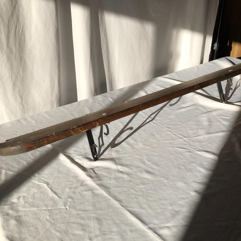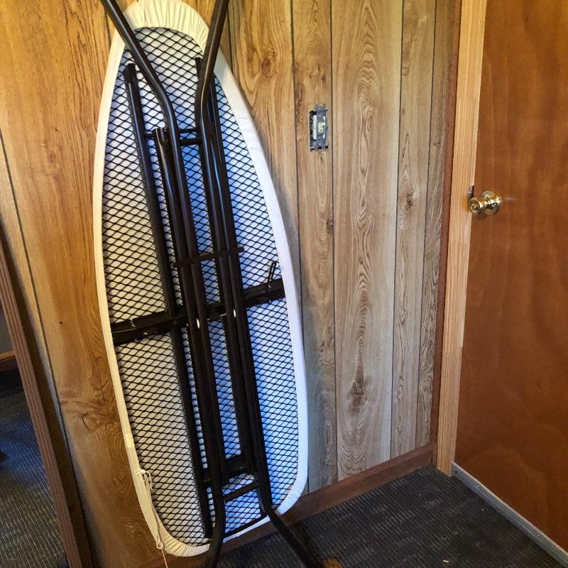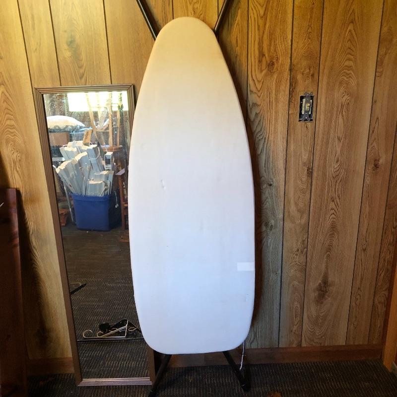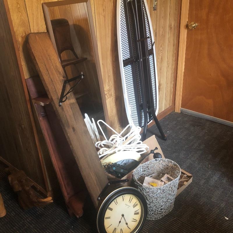 This lot includes helpful items to complete your household. It includes three battery operated wall clocks, two wall shelves, one waste basket, an ironing board, wall mirror, hangars, brackets, light bulbs and more. The garage shelf with the metal brackets measures 48” x 7.5”. The all wooden household shelf measures 36”