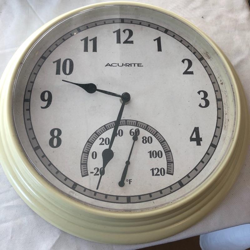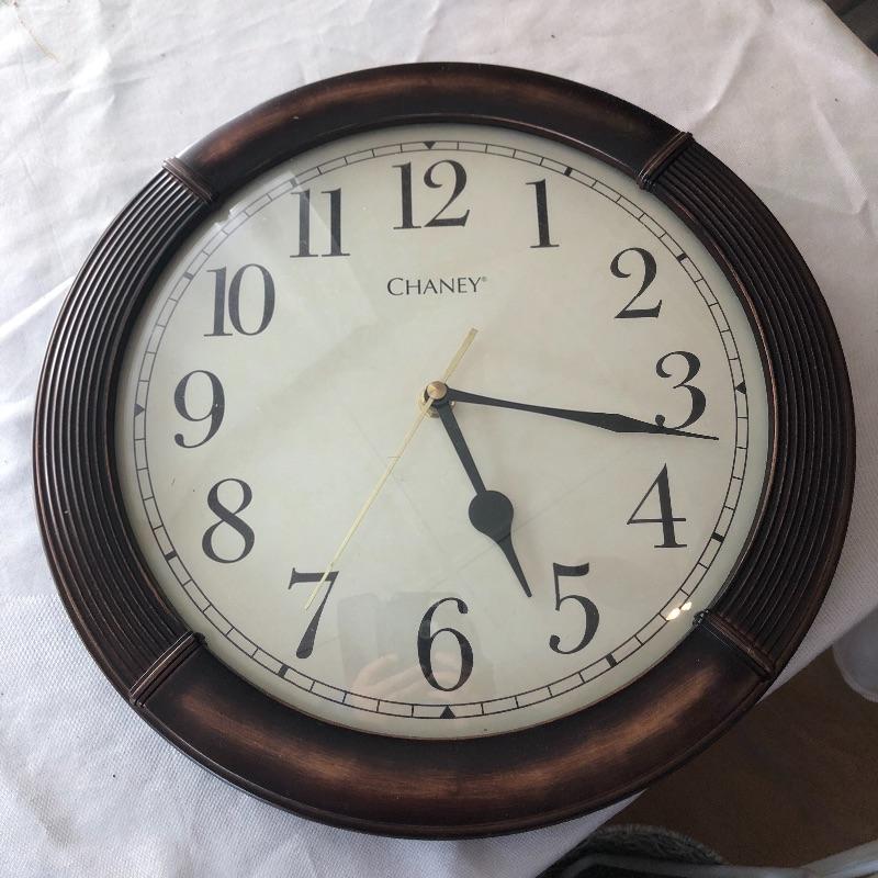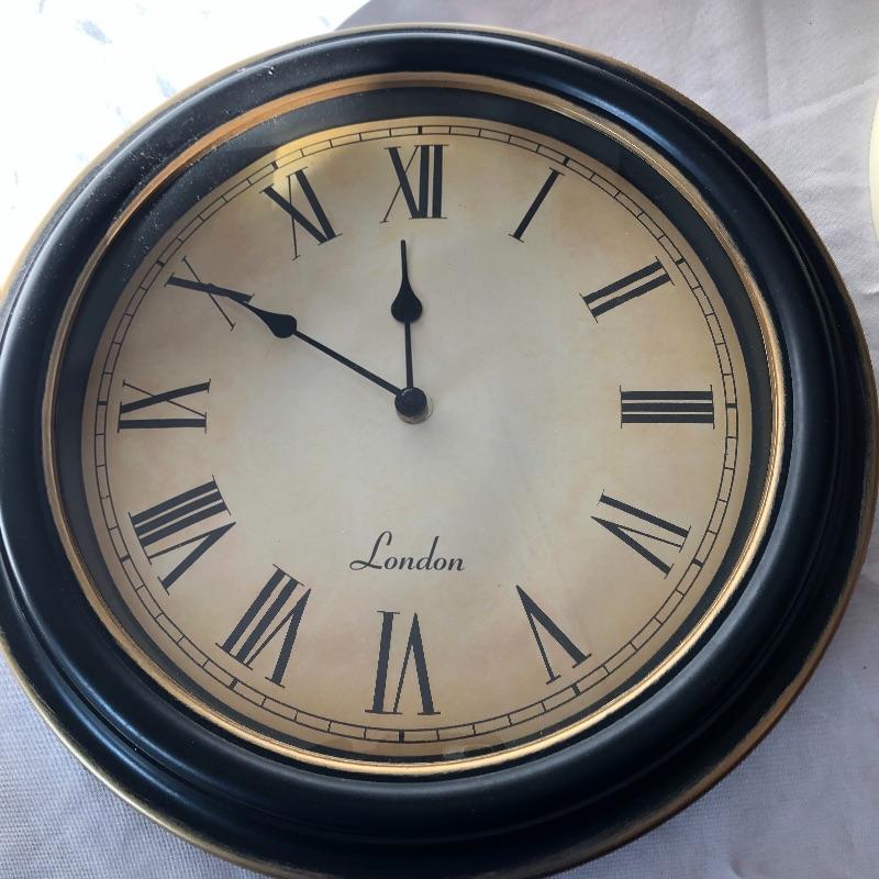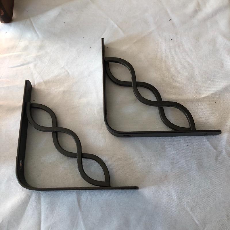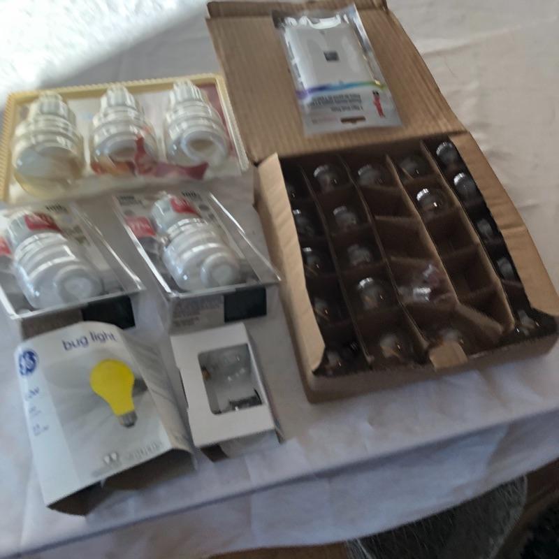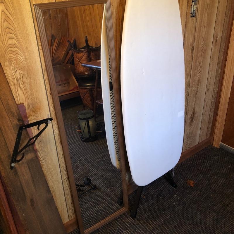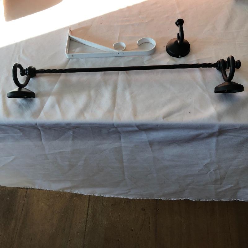 This lot includes helpful items to complete your household. It includes three battery operated wall clocks, two wall shelves, one waste basket, an ironing board, wall mirror, hangars, brackets, light bulbs and more. The garage shelf with the metal brackets measures 48” x 7.5”. The all wooden household shelf measures 36”