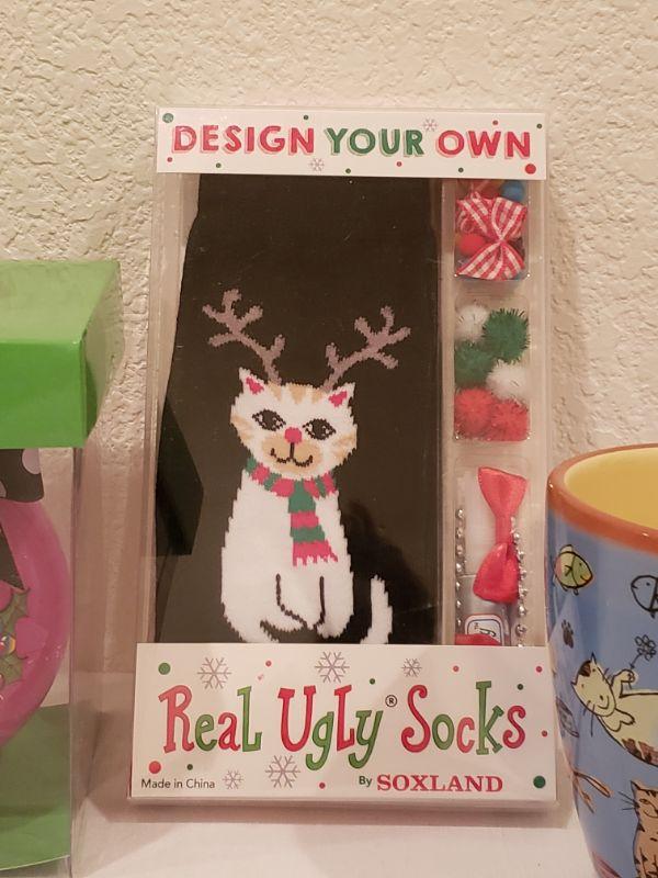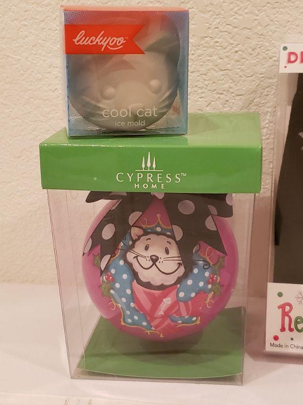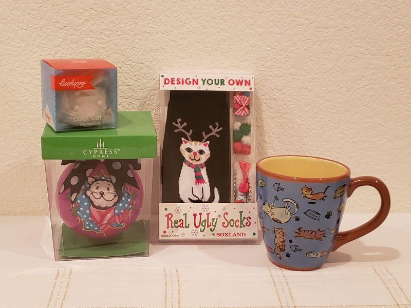 Lot 134: Cat Lovers Gift Lot - Socks, Ornament, Mug, and Cool Cat Ice Mold