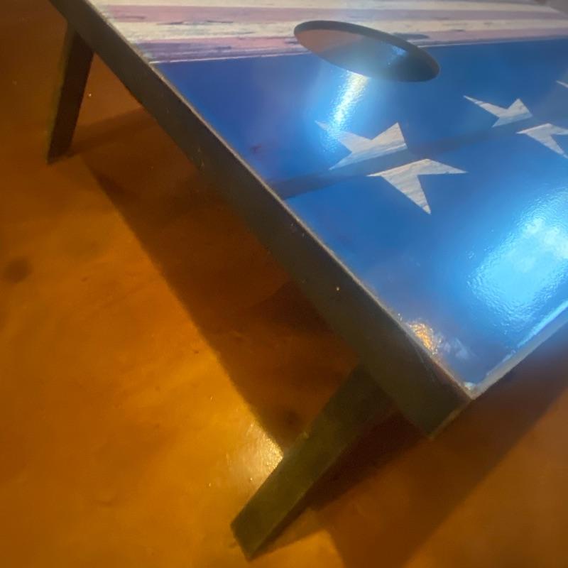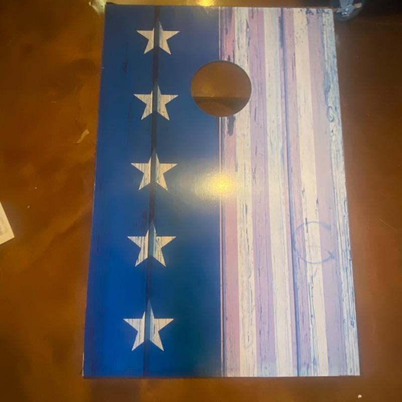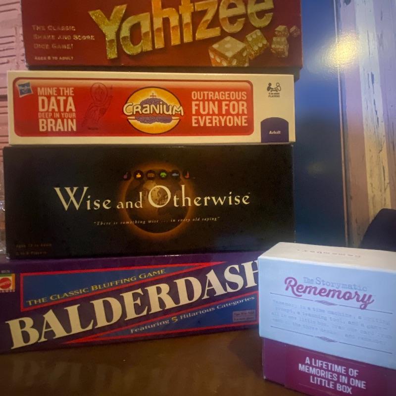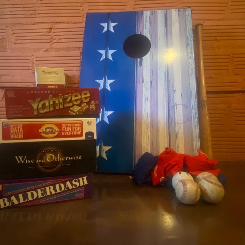 Lot includes full set corn hole game. With eight bean bags, American flag inspired. A Louisville slugger baseball bat and four balls three real baseballs and one whistle. Board games such as Yahtzee, Balderdash, Wise and Otherwise, Cranium, and Rememory. See photos. Local pick up only