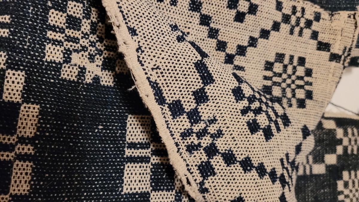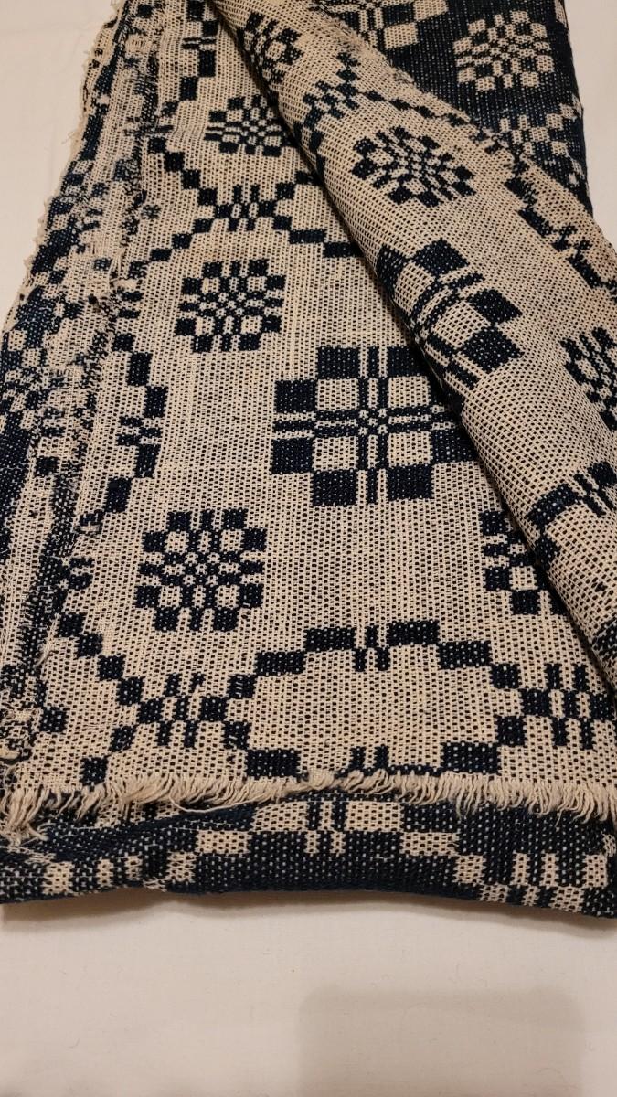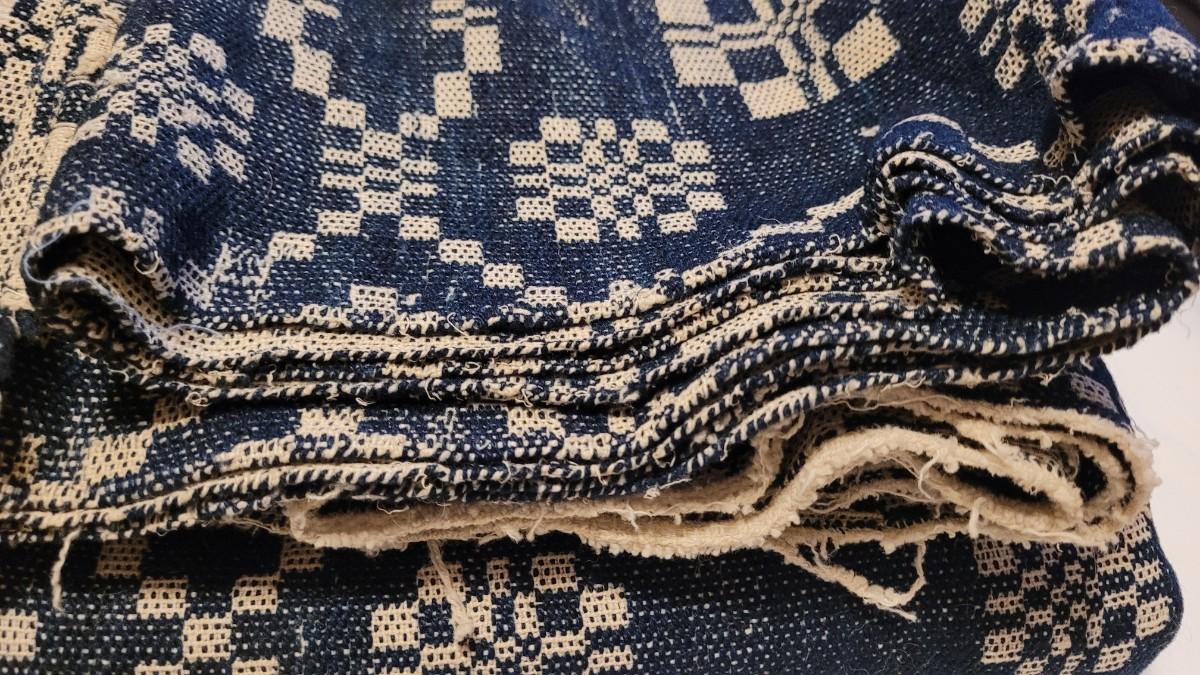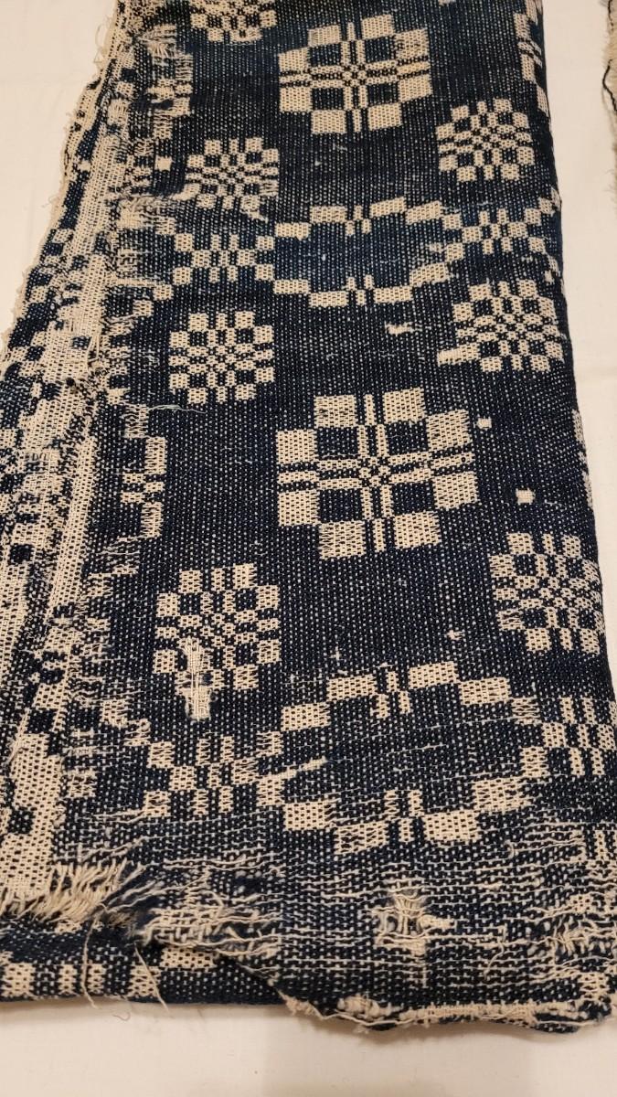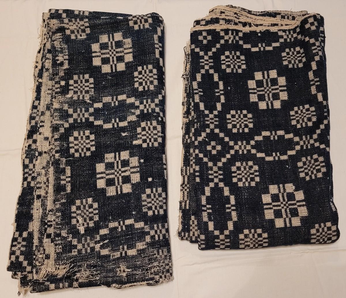 Lot 134: (2) Antique 19th Century Dark Blue & Aged White Jacquard Coverlet  92" × 42"