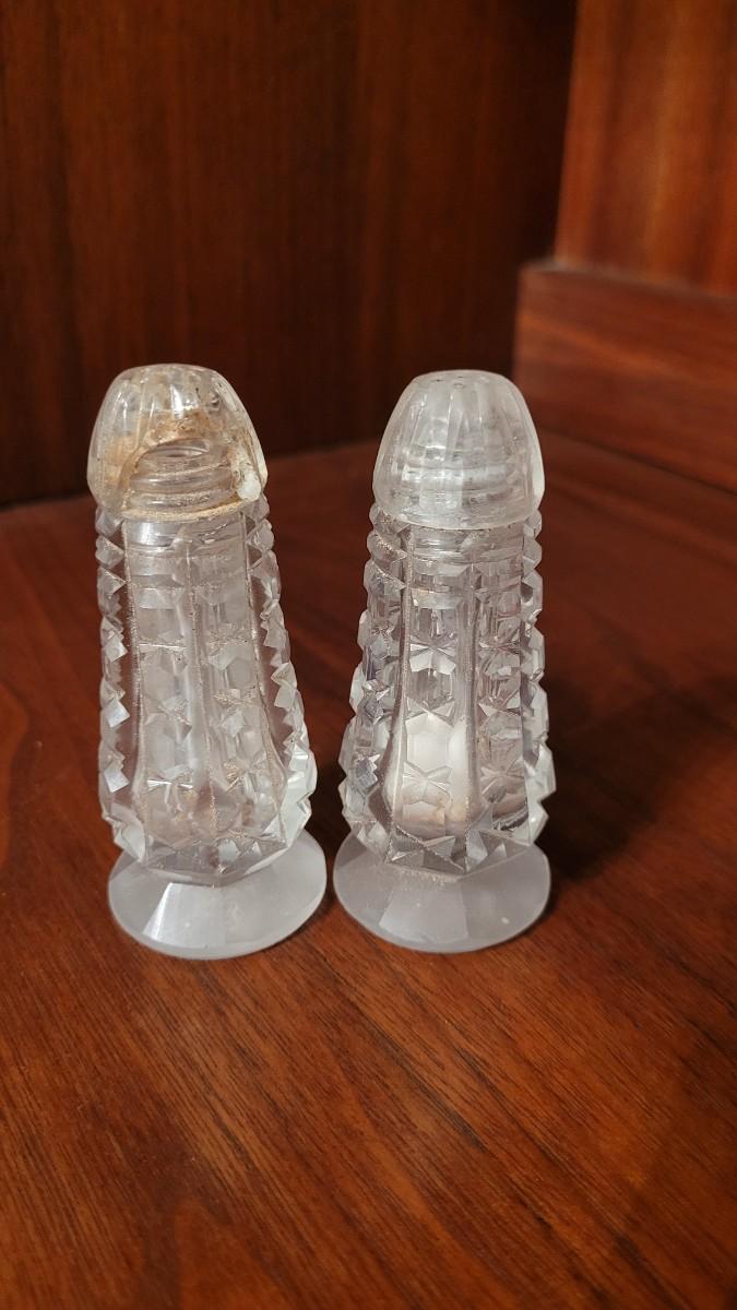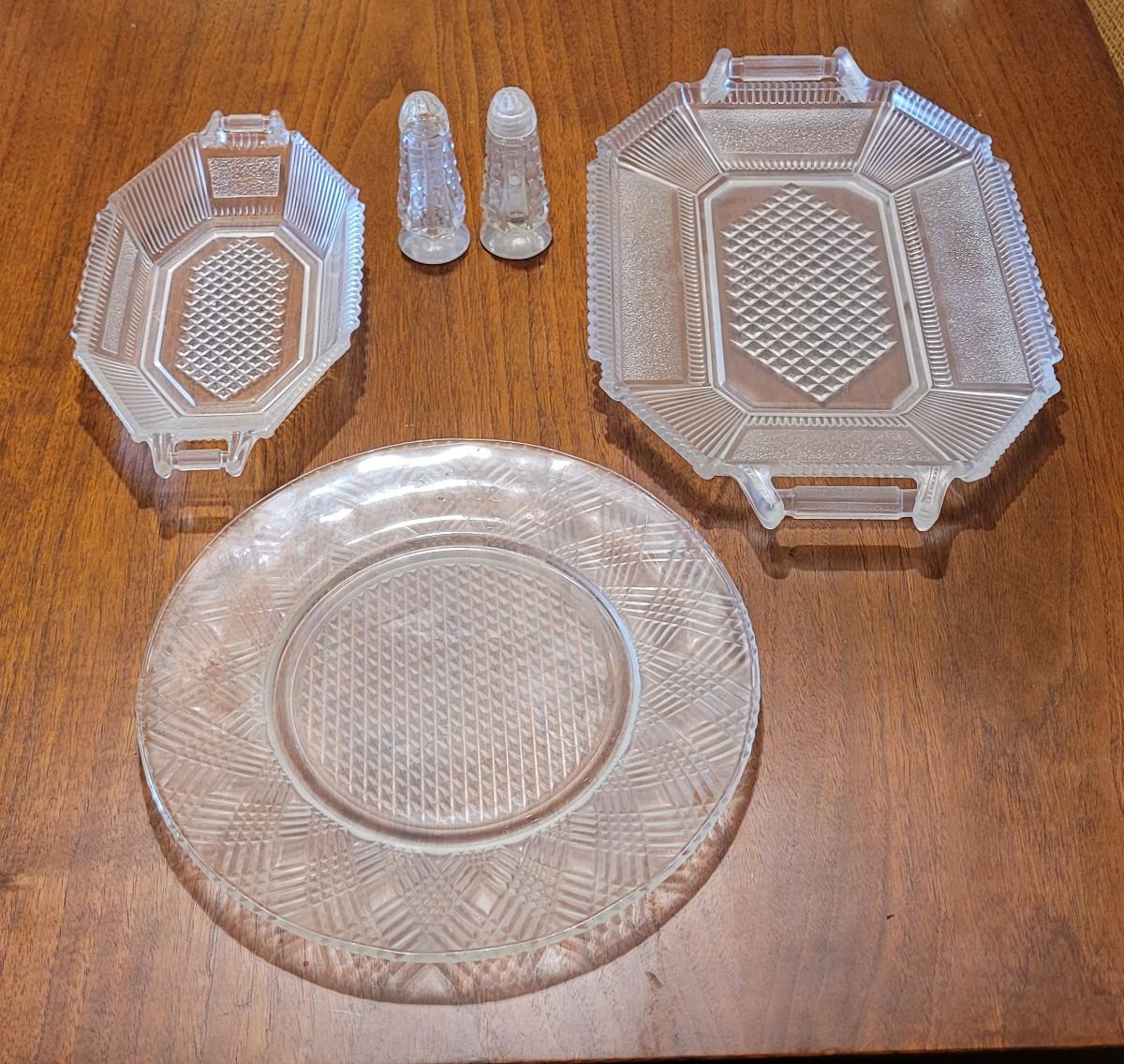 Lot 129: Antique Cut Glass Salt & Pepper Shakers, Serving Platter & Bowl