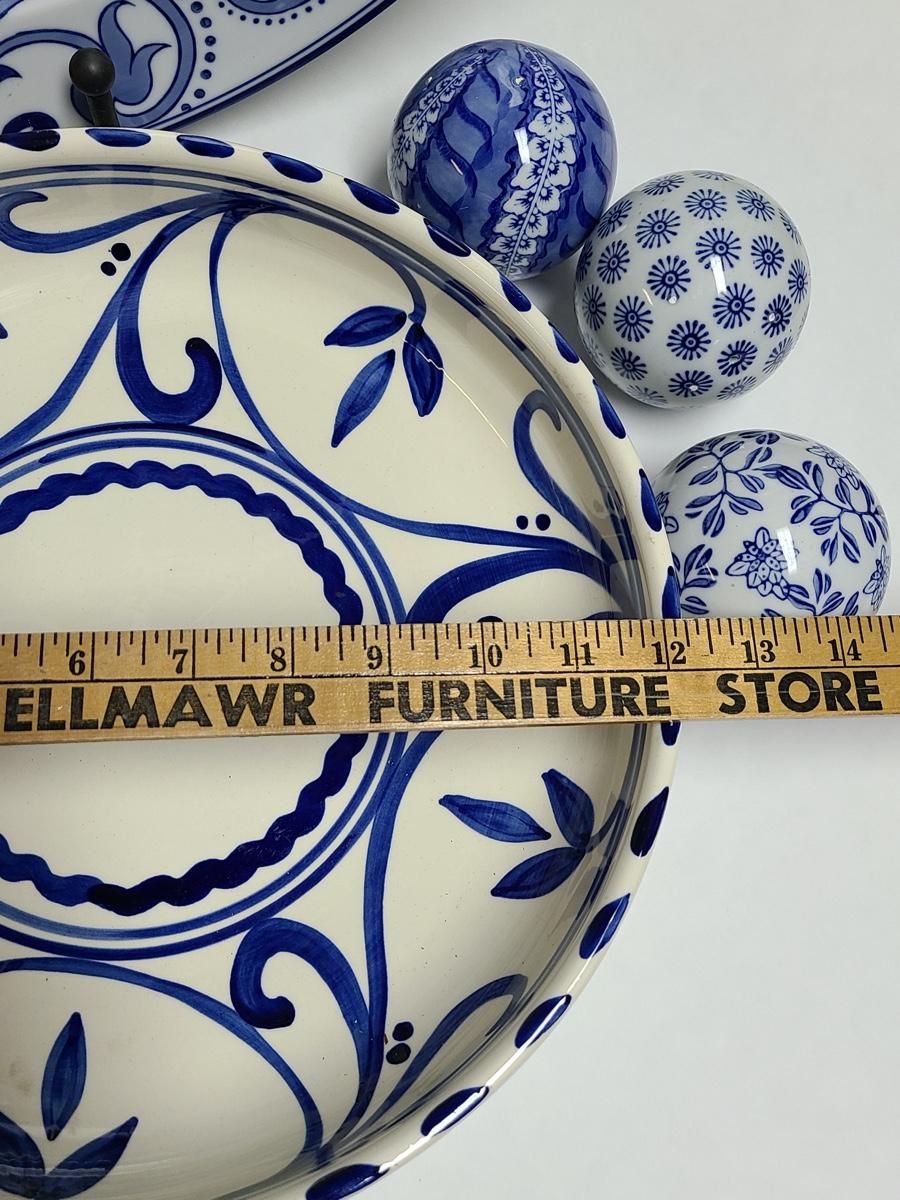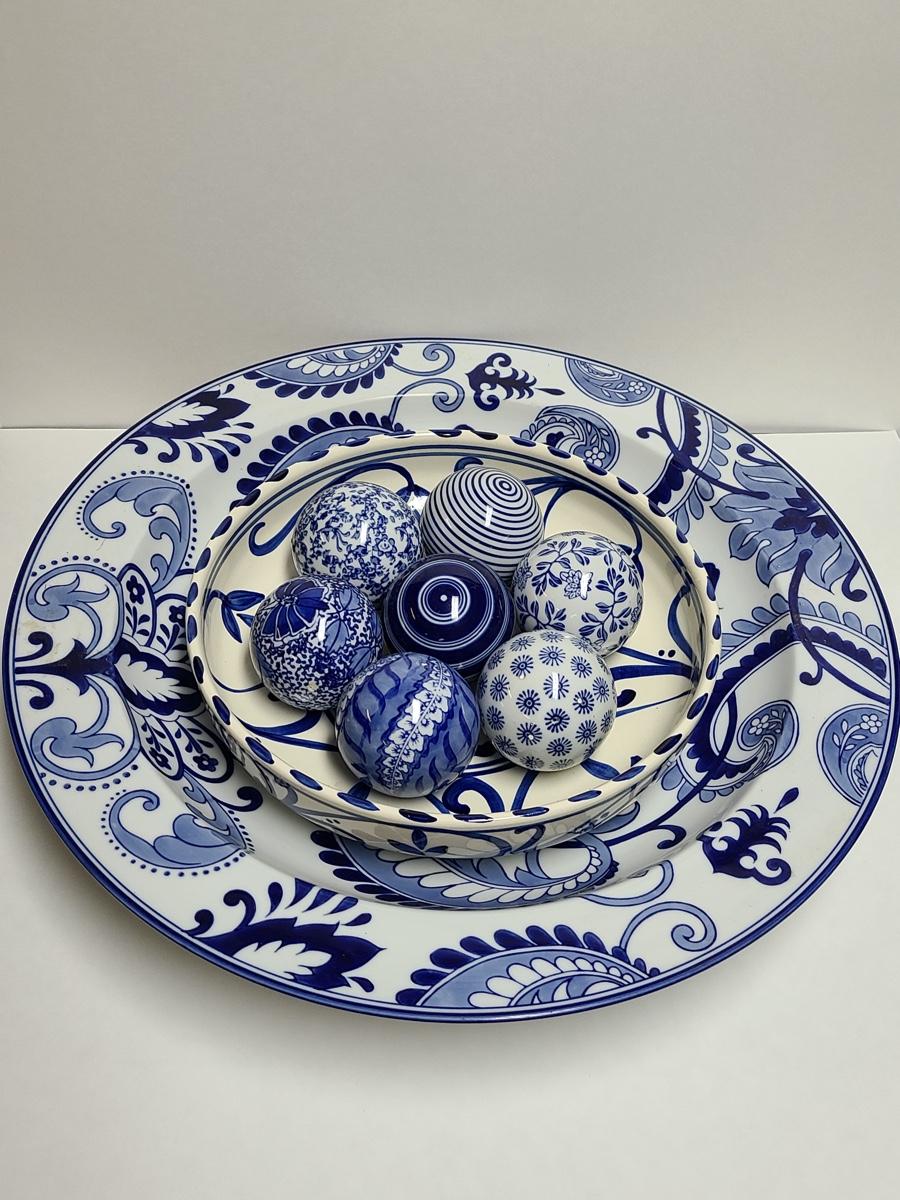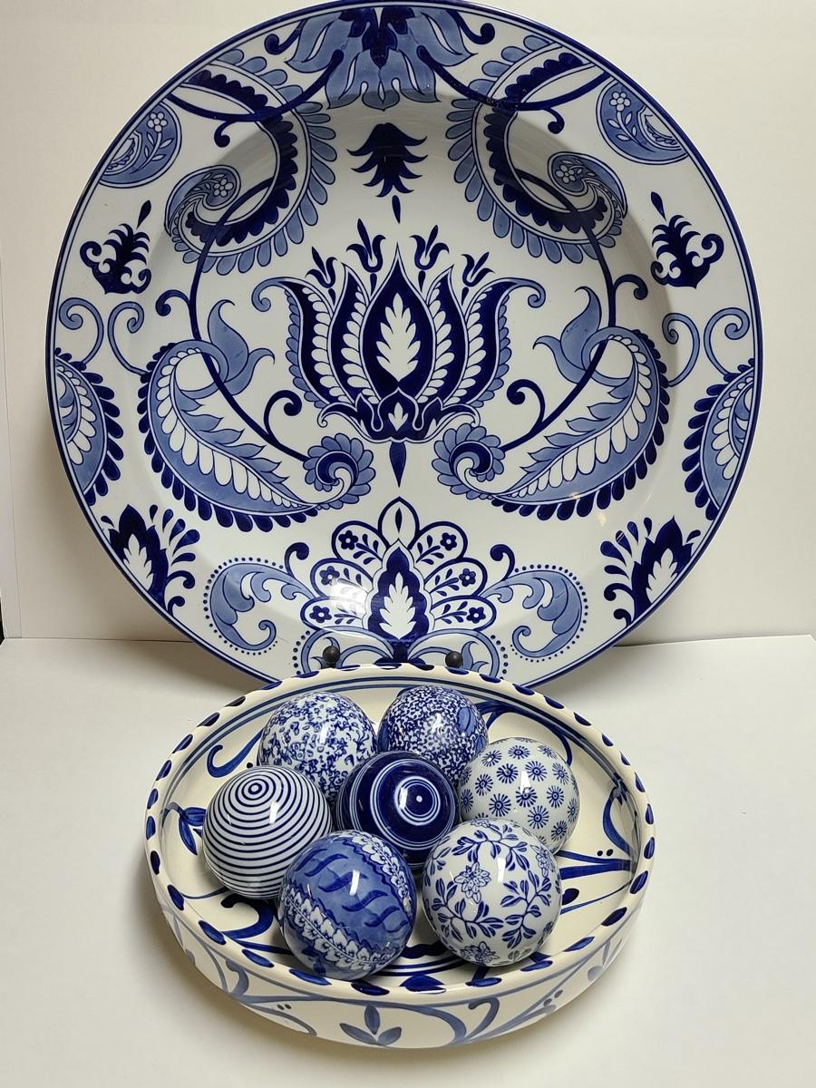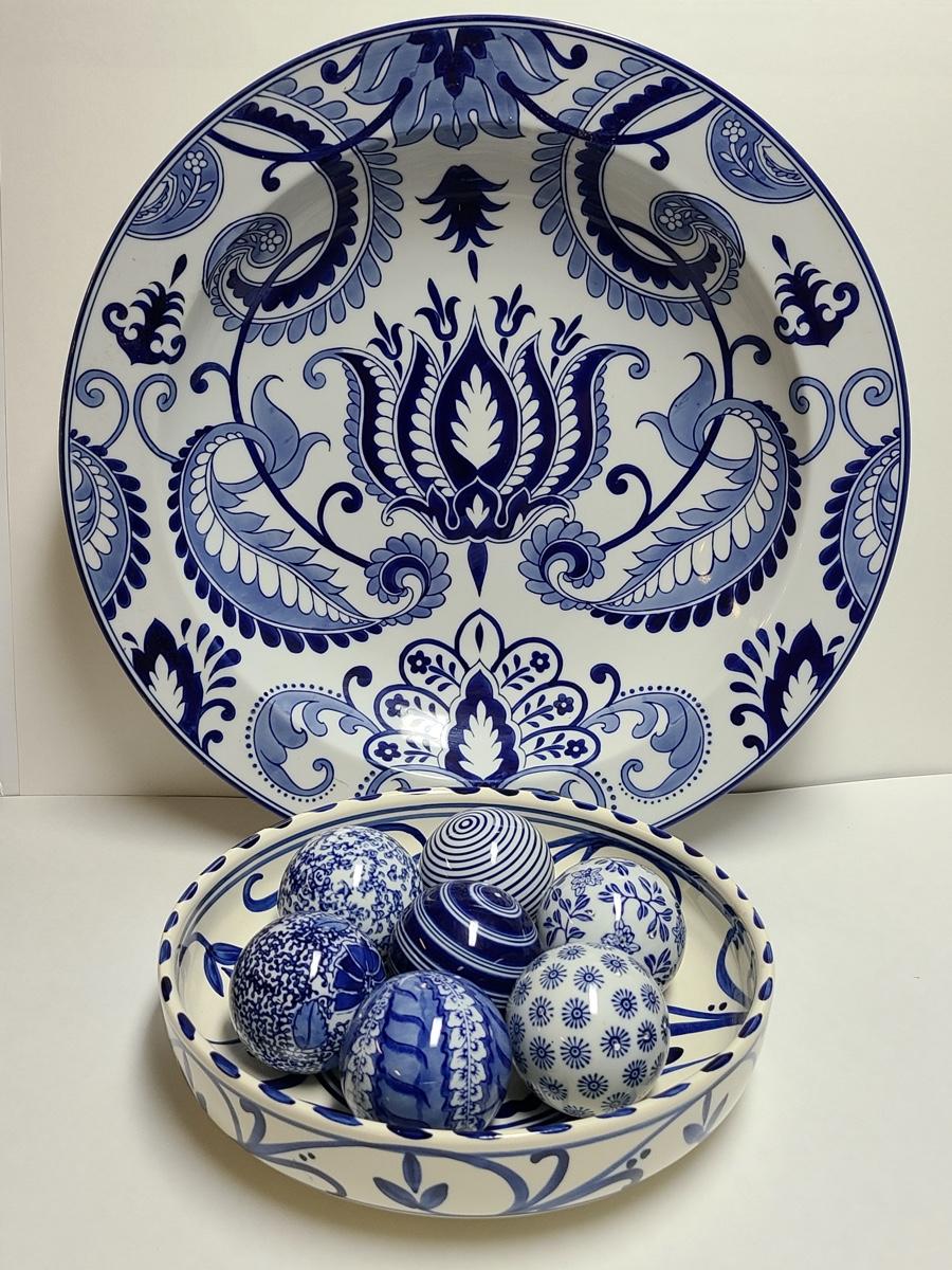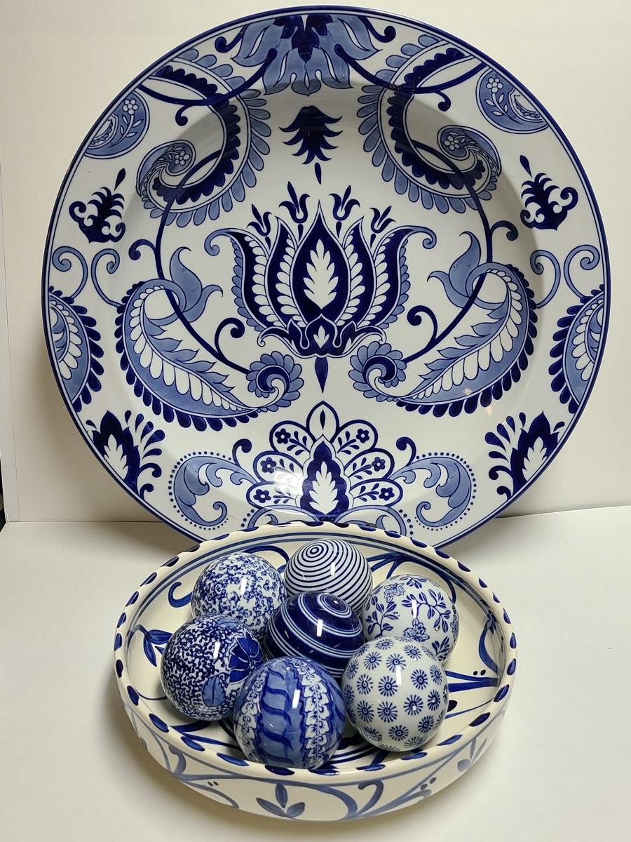 Lot 134: Pier One Bowl with Blue/White Balls and Hanging Wall Art Oversized Plate
