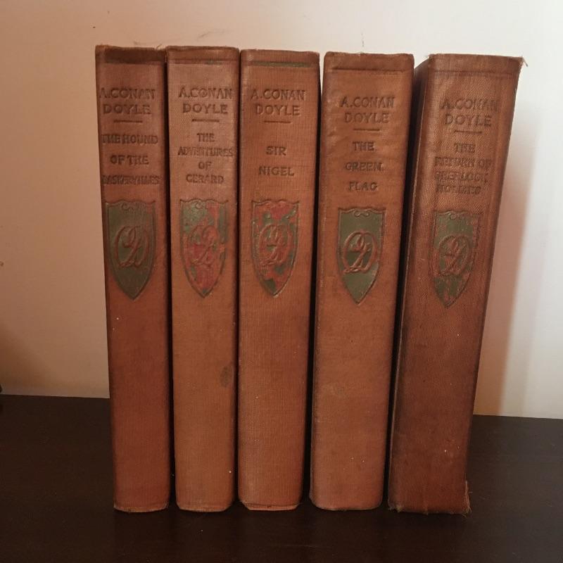 An awesome collection of antique books that includes five books by A. Conan Doyle circa 1900-1906, Charles Darwin, Daphne de Maurier, Graves, Ethel Vance, Josephine Lawrence and more. Also includes wooden side table with shelf., Unit has split on one foot that looks like a easy fix, see pictures. Measuring 10.5” x 28.5” x 24.5”.
