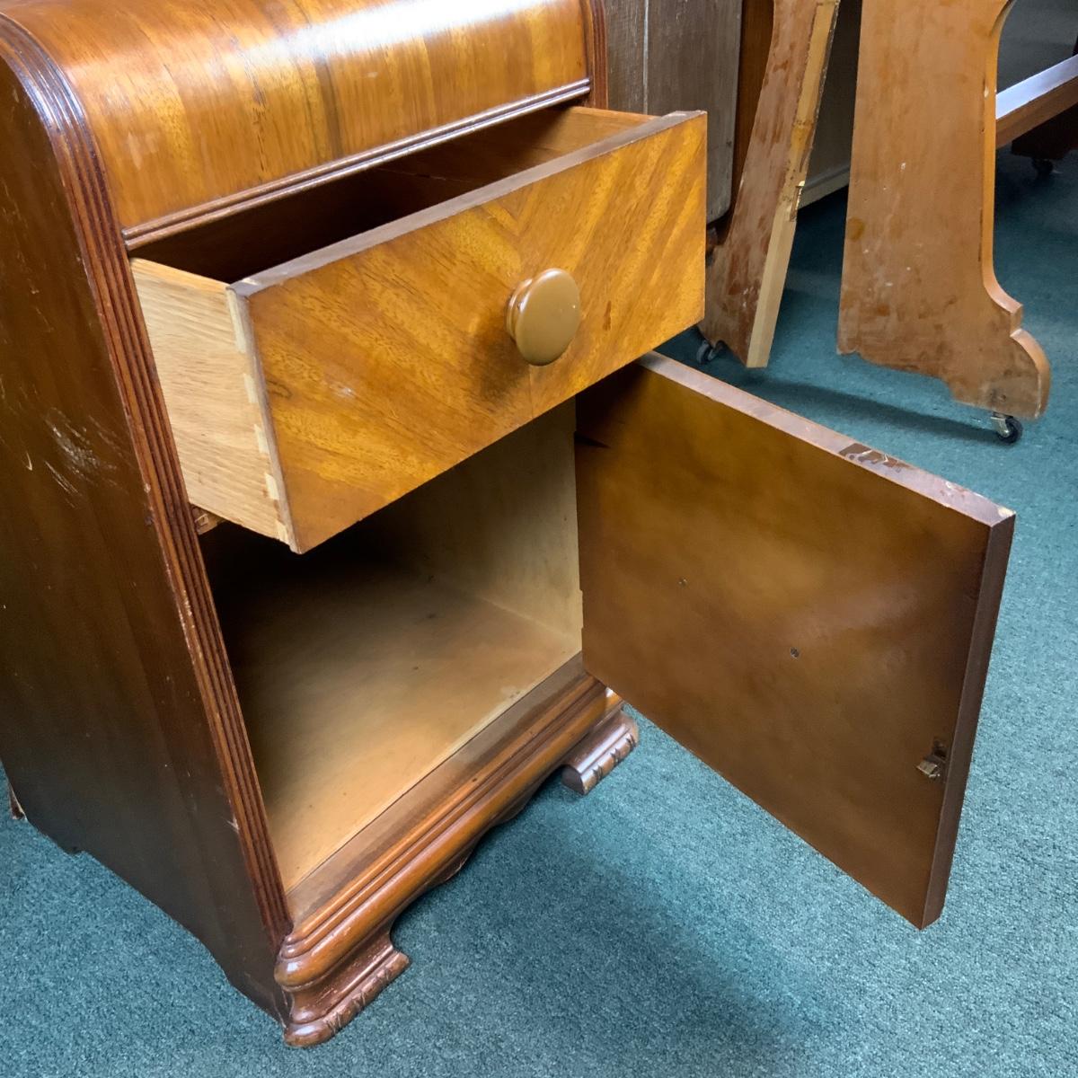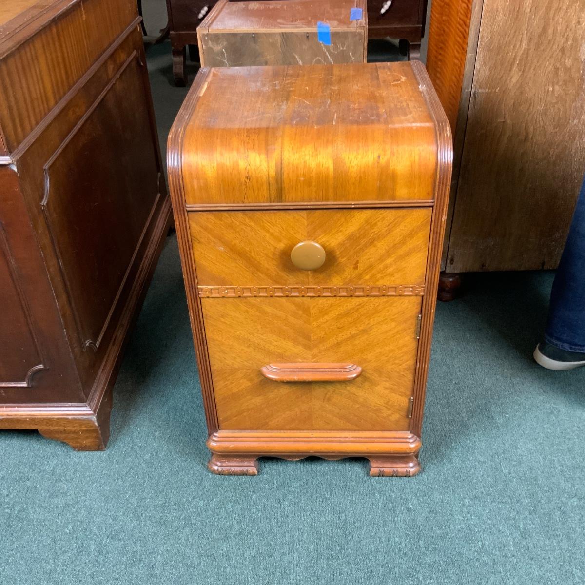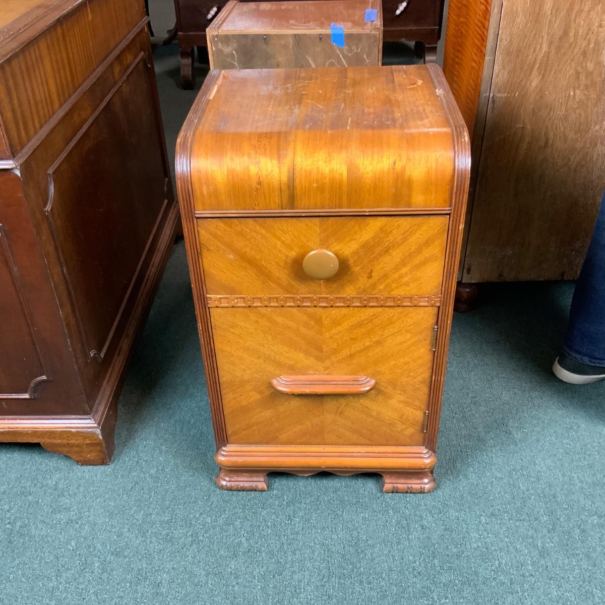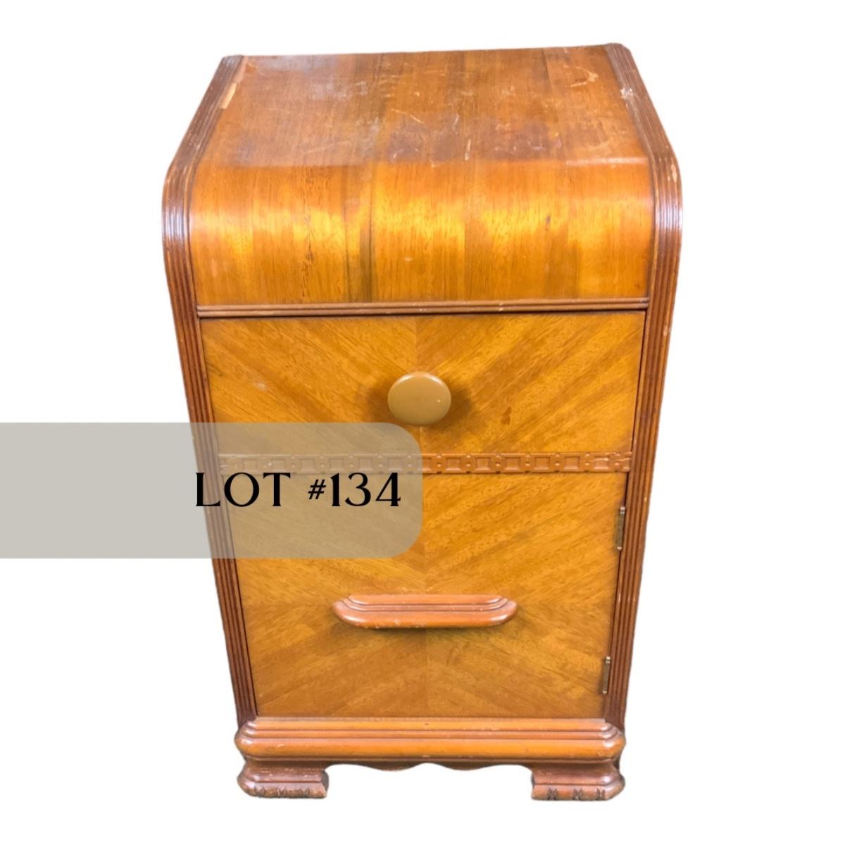 Art Deco Waterfall Nightstand Nice details and original hardware. //::\\ Please see photos for details and condition. No attempt has been made to hide any imperfections. All items listed in this auction are warehouse items, and need to be cleaned. A majority of the items need restoration as well. All items are sold AS IS and WITHOUT GUARANTEE. If you are uncertain about an item, DO NOT BID. Due to the nature of this online auction in-person inspection is HIGHLY recommended. All Sales are FINAL. Pick Up Times are FIRM. Please confirm with your own schedule that you can pick up in the scheduled times listed in the Terms and Conditions. Any questions please message the auctioneer. DO NOT Contact The Harp Gallery.