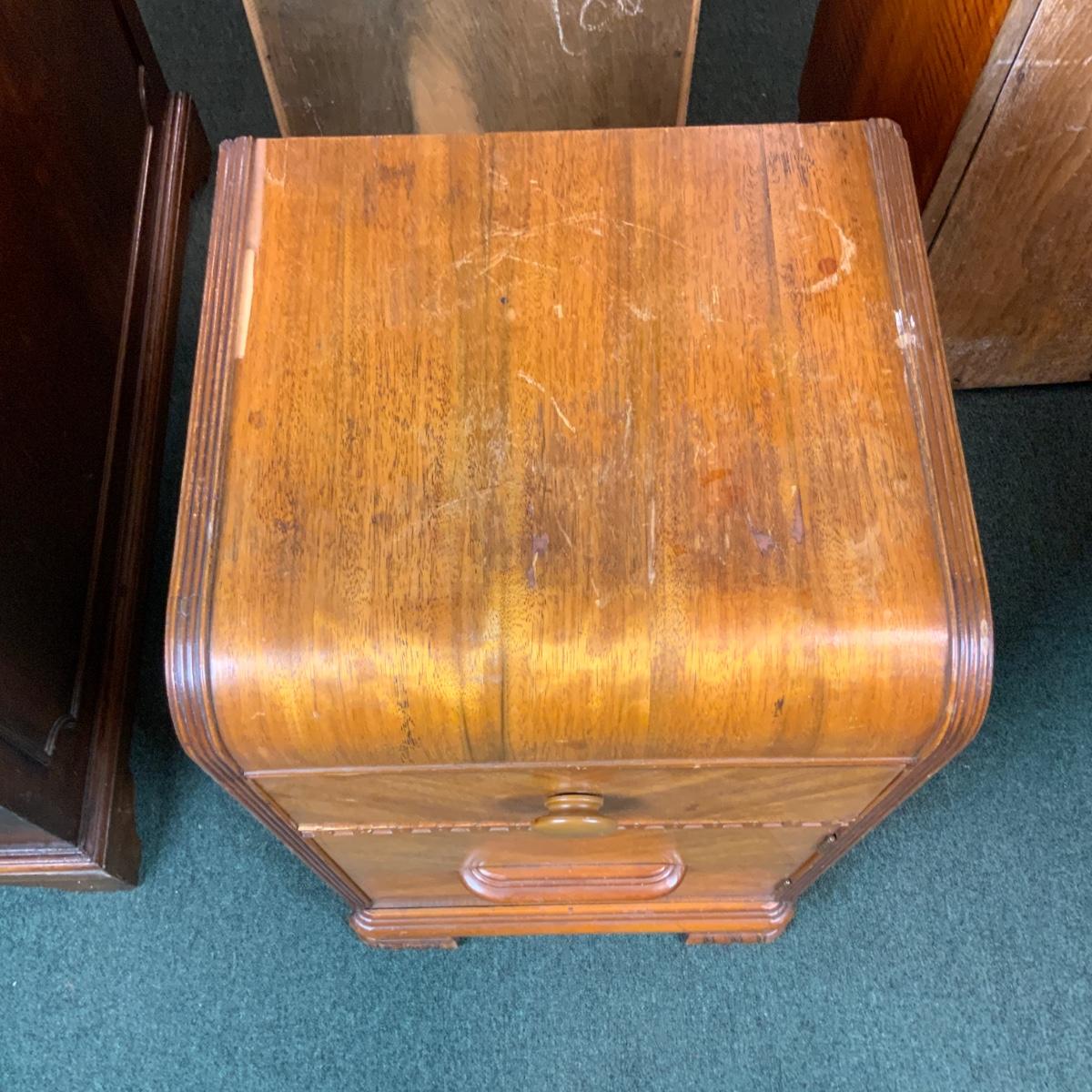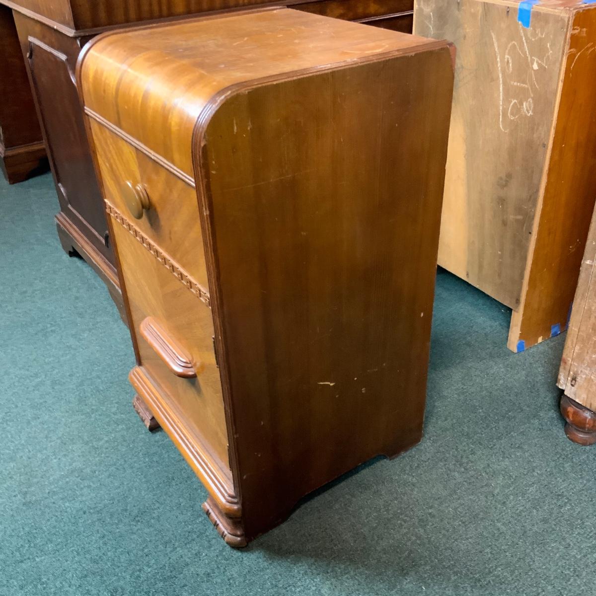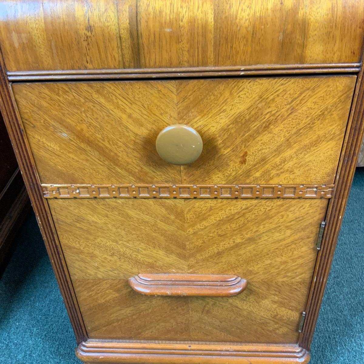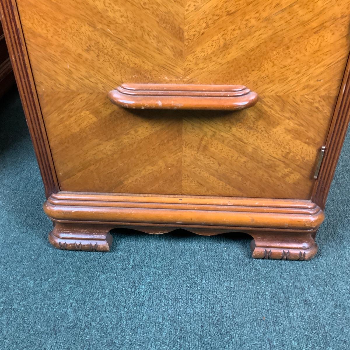 Art Deco Waterfall Nightstand Nice details and original hardware. //::\\ Please see photos for details and condition. No attempt has been made to hide any imperfections. All items listed in this auction are warehouse items, and need to be cleaned. A majority of the items need restoration as well. All items are sold AS IS and WITHOUT GUARANTEE. If you are uncertain about an item, DO NOT BID. Due to the nature of this online auction in-person inspection is HIGHLY recommended. All Sales are FINAL. Pick Up Times are FIRM. Please confirm with your own schedule that you can pick up in the scheduled times listed in the Terms and Conditions. Any questions please message the auctioneer. DO NOT Contact The Harp Gallery.