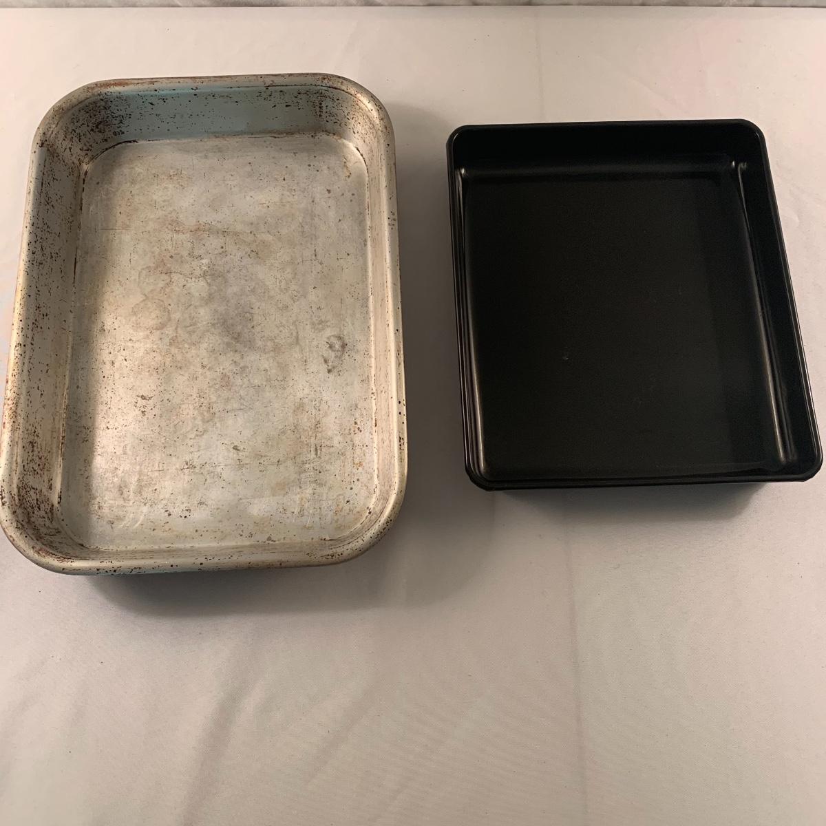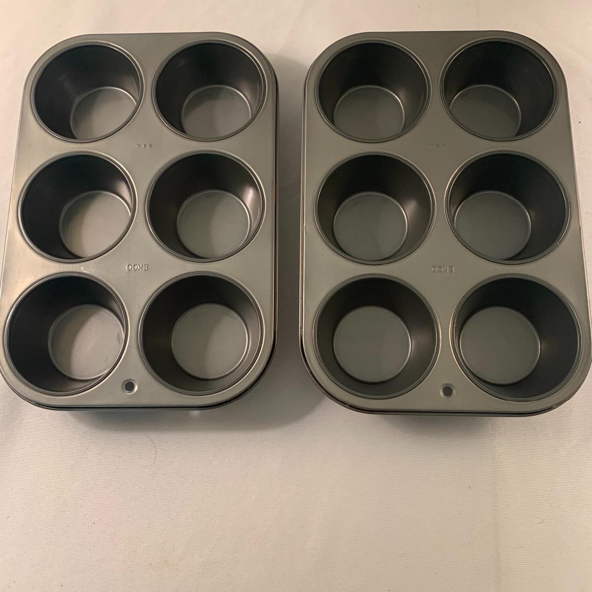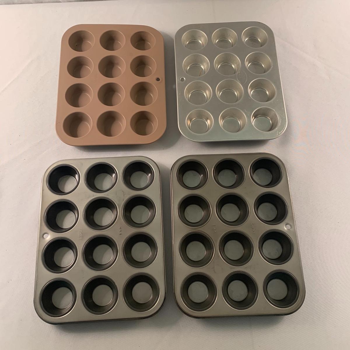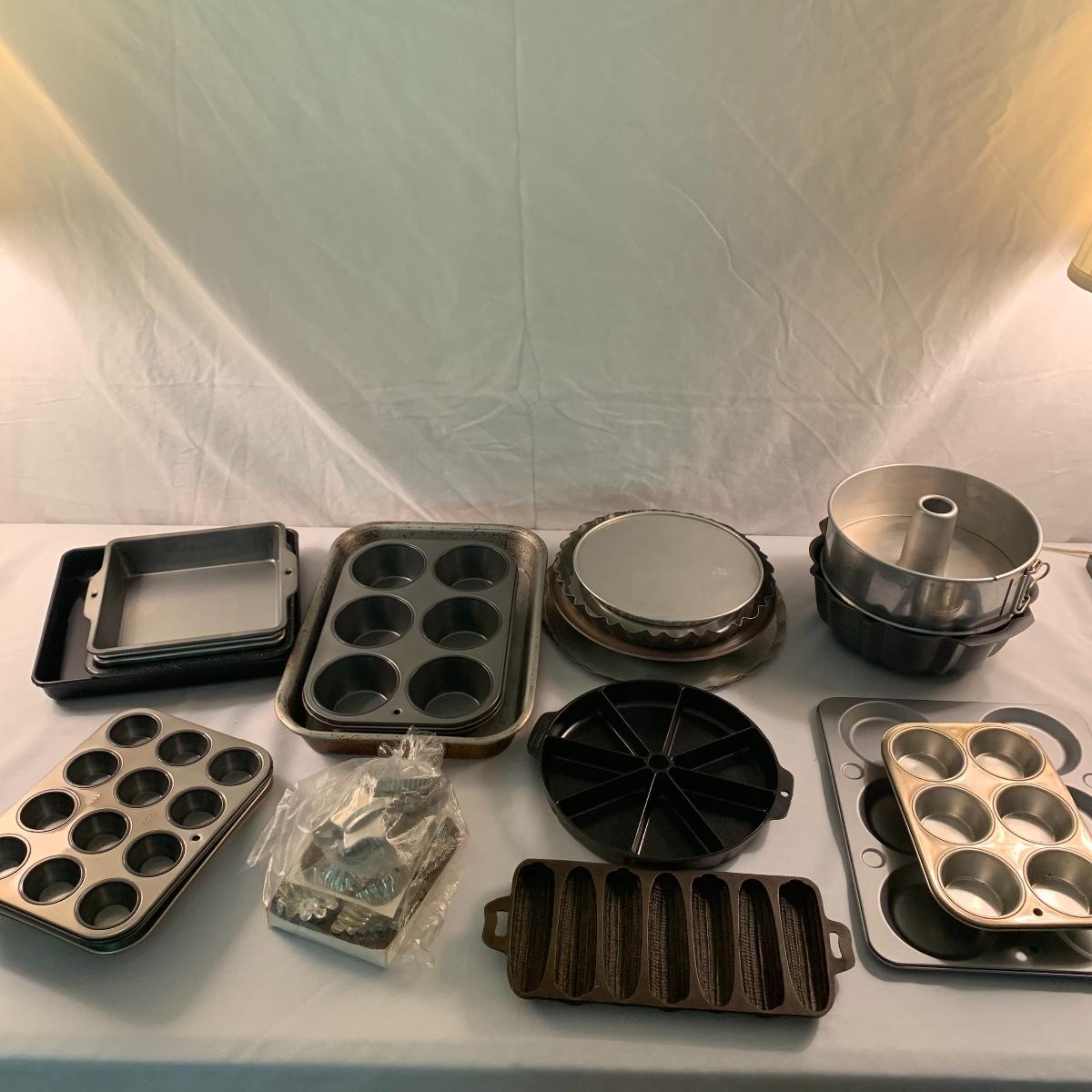 This lot has all sorts of pans for your baking needs! Some of these include bunt cakes pans, small and large cupcake pans, corn cooking pans, cake pans, and more. This look also includes small metal cookie cutters and molds. Some of the pans have nonstick coating and others are a lightweight metal material. Some pans have scratching (see photos). The largest pan measures about 15in x 11in.