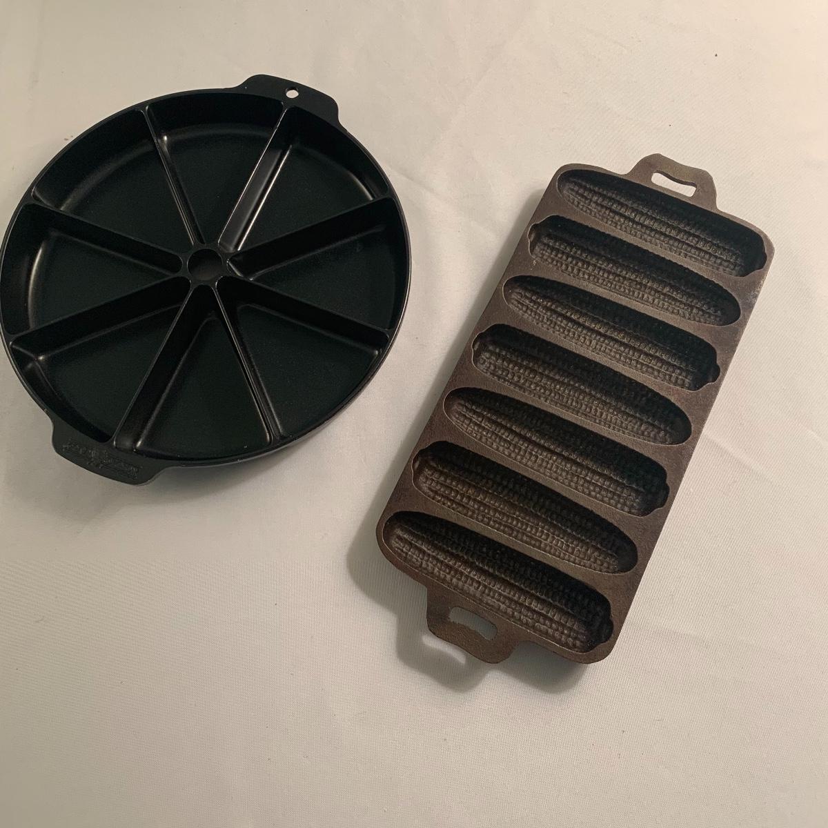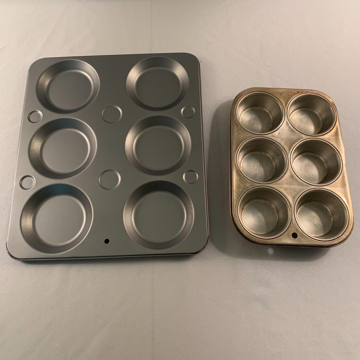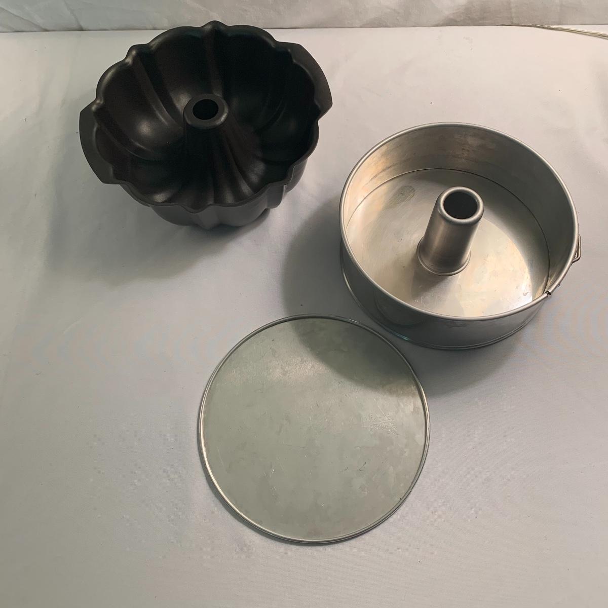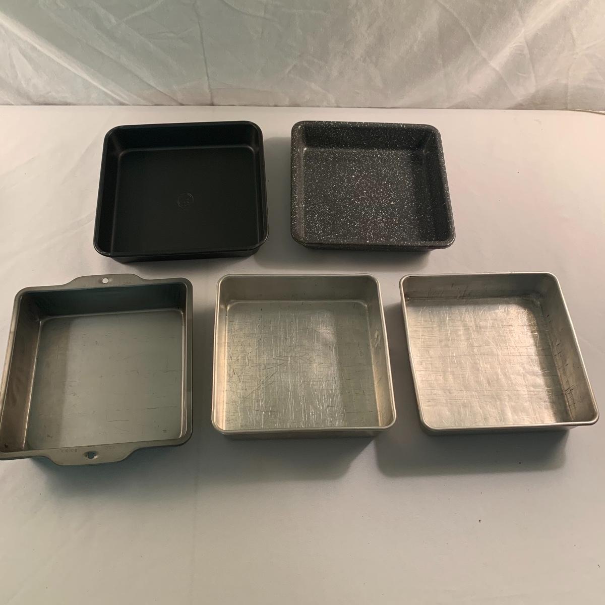 This lot has all sorts of pans for your baking needs! Some of these include bunt cakes pans, small and large cupcake pans, corn cooking pans, cake pans, and more. This look also includes small metal cookie cutters and molds. Some of the pans have nonstick coating and others are a lightweight metal material. Some pans have scratching (see photos). The largest pan measures about 15in x 11in.