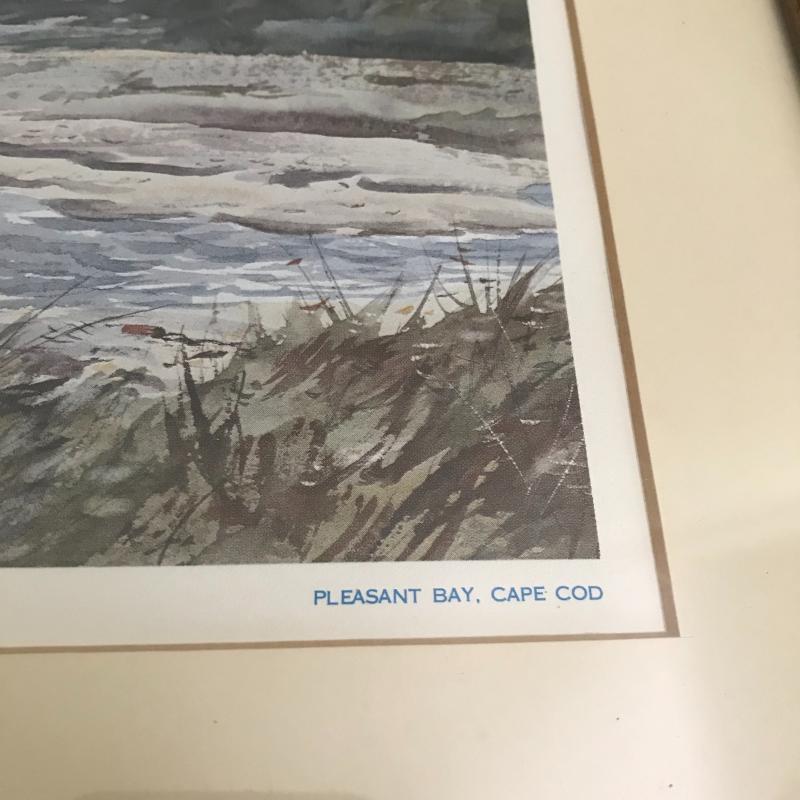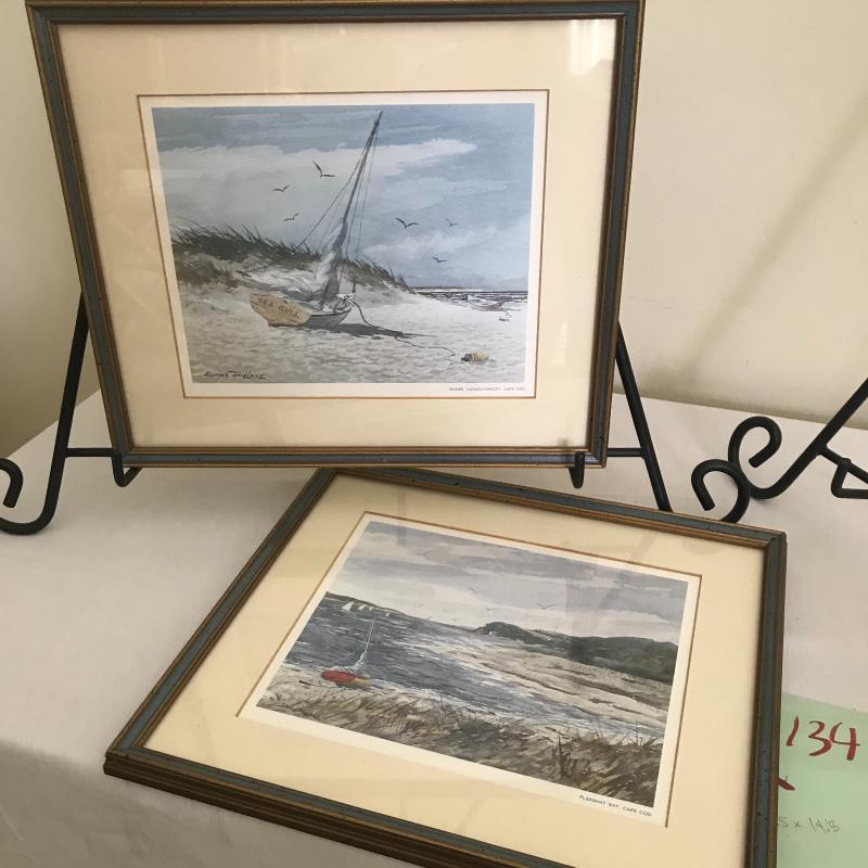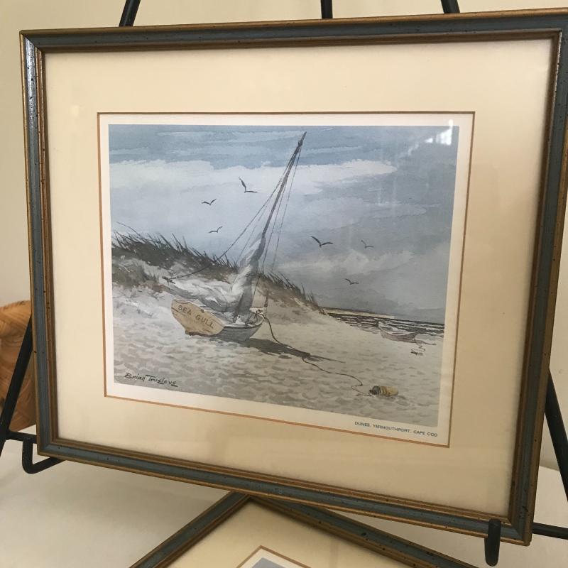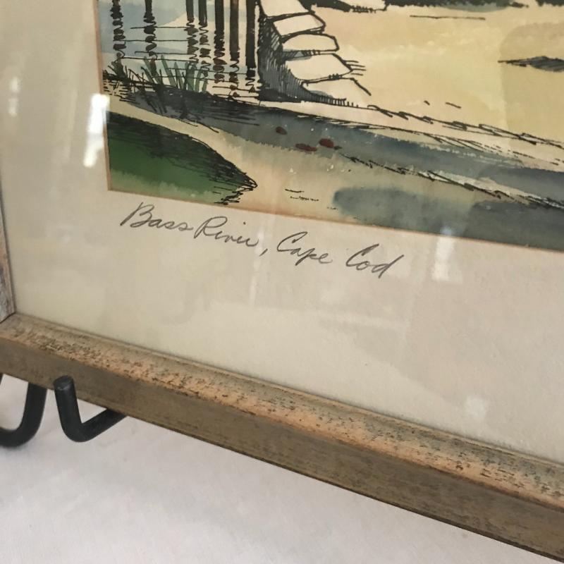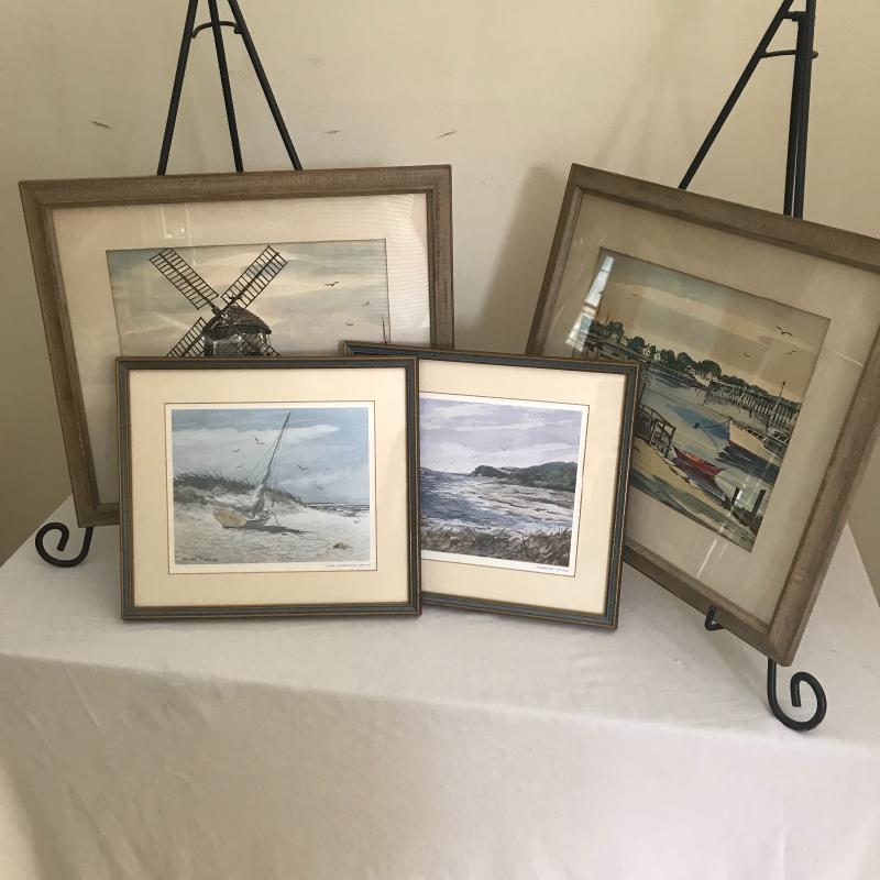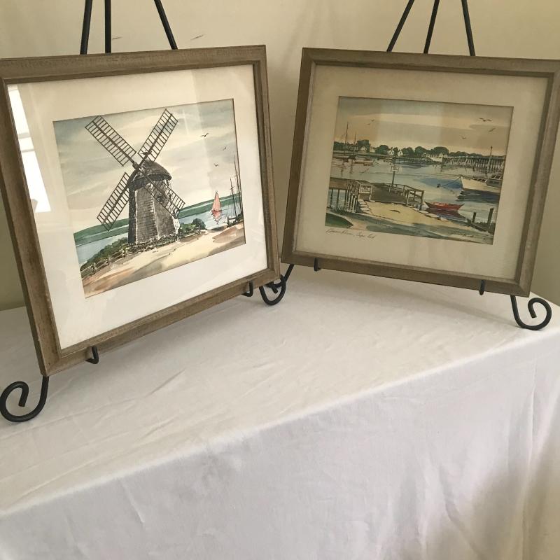 Pair of Brian Truelove framed water colors in Pleasant Bay and Yarmouth. Both matted and framed measuring 12” x10.5”. Also two larger water colors with one being signed by Robert Brooks. They appear to be similar but the windmill one cannot be verified. These framed and matted paintings measure 16.5” x14.5”. Shipping available but please be aware that shipping art can be pricey. Please call UPS Store to get an estimate with measurements of frames.