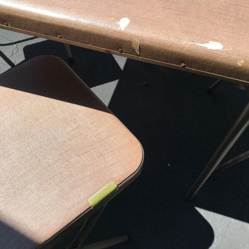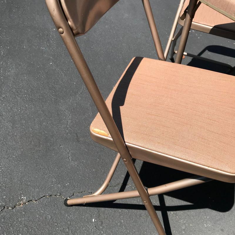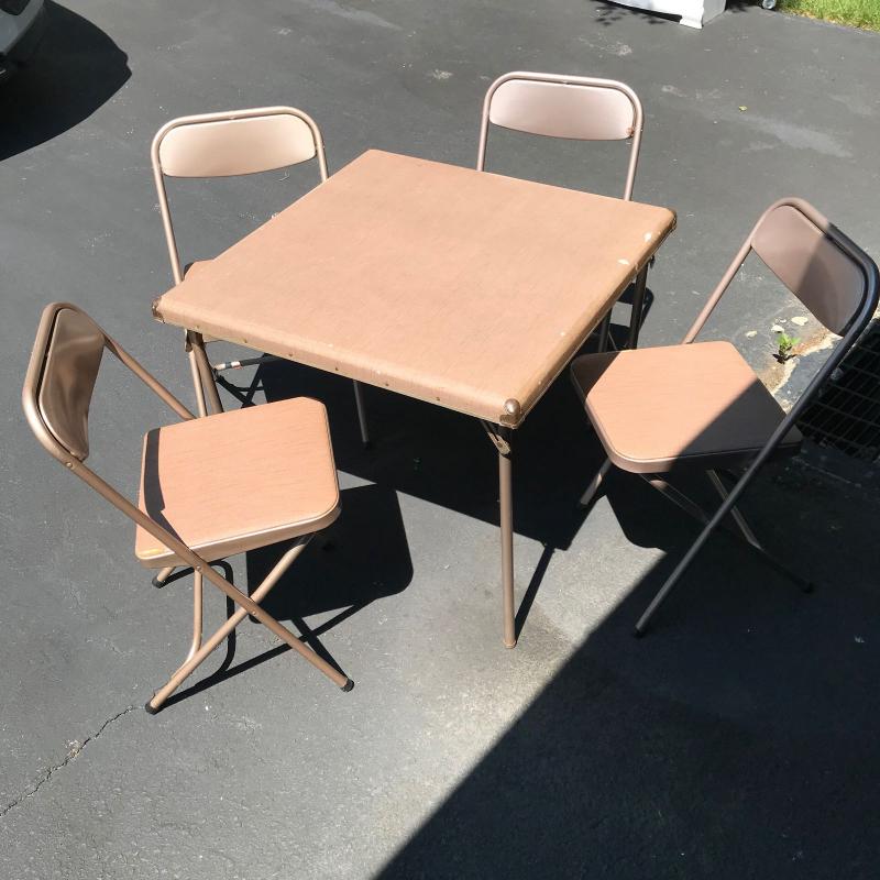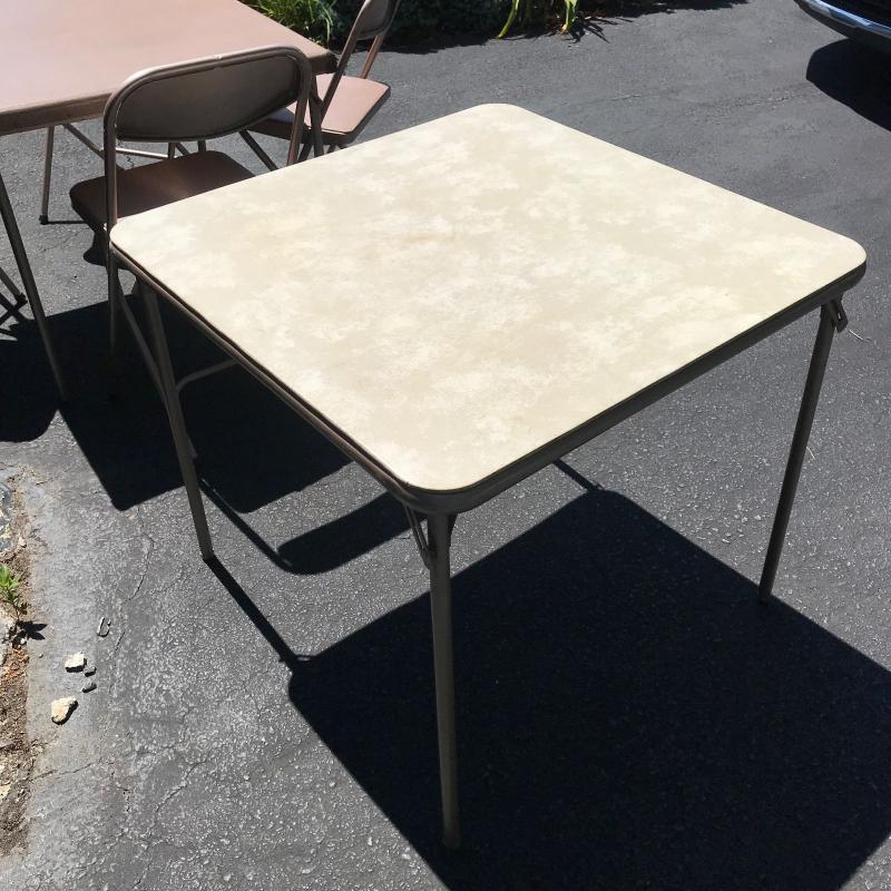 Two vintage card tables with four vintage Samsonite folding chairs. No shipping