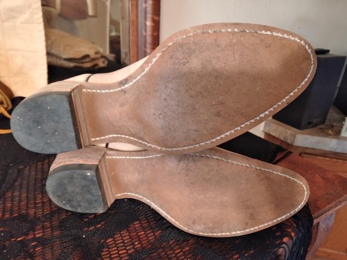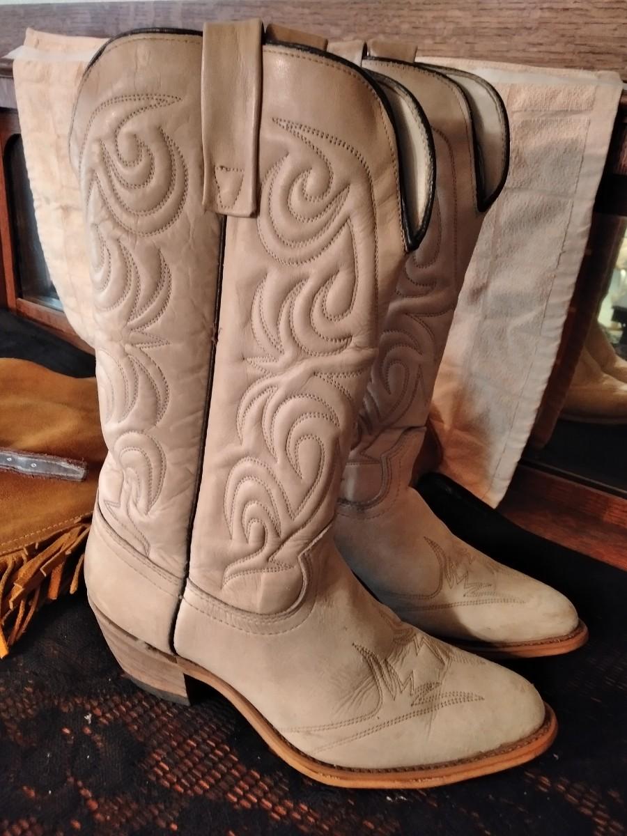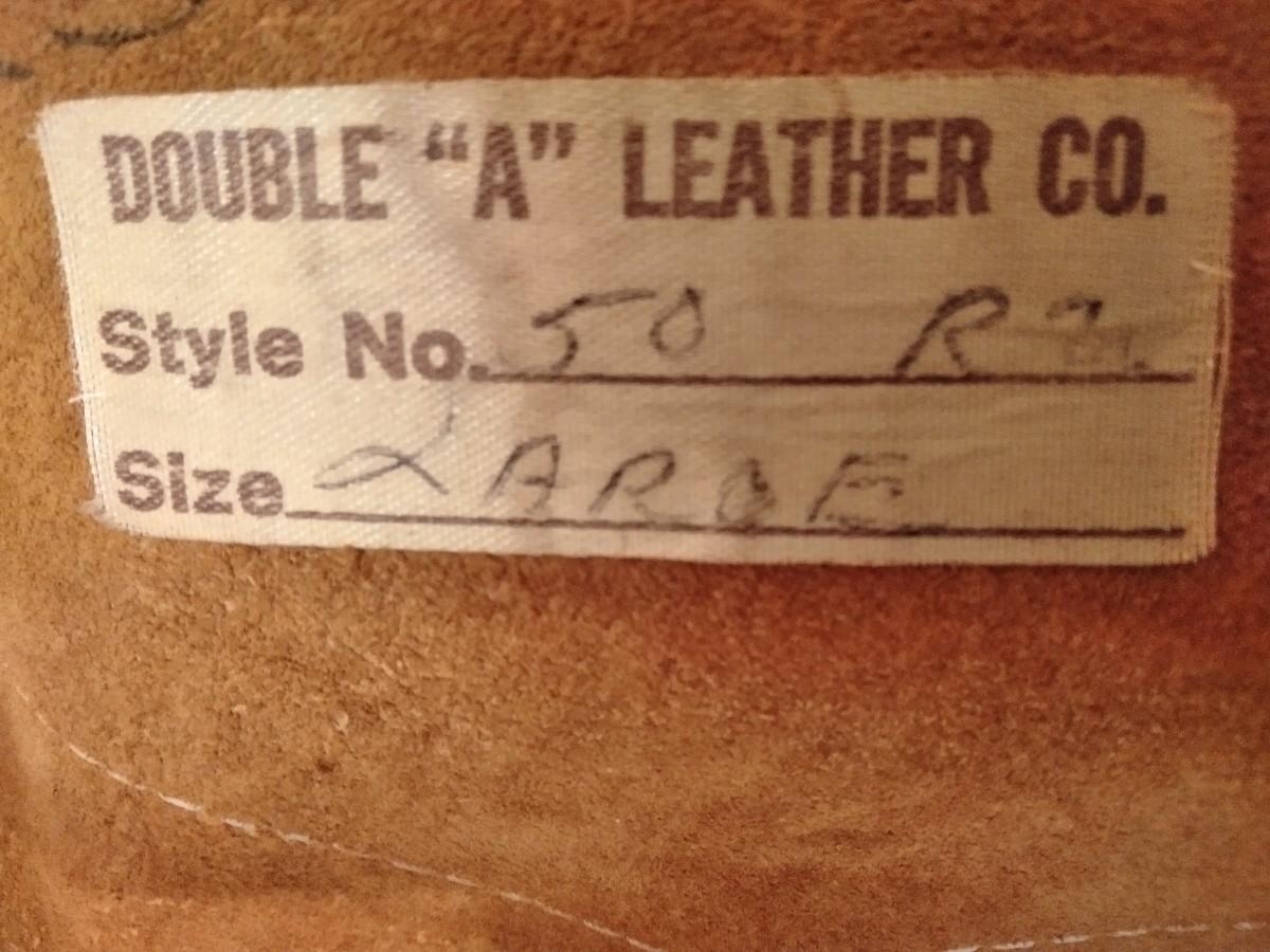 DOUBLE "A" LEATHER CO. LARGE SIZED LEATHER CHAPS IN GREAT CONDITION, MADE IN TEXAS COWBOY BOOTS, SIZE 8M, PAIR OF UNMARKED SPURS.