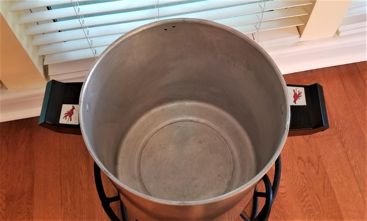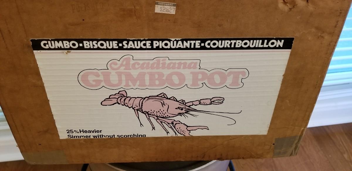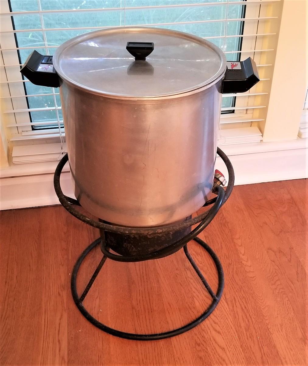 Good, gently used crawfish or gumbo rig - box calls the pot the "Acadiana Gumbo Pot". 24" tall, 17" across handle to handle.