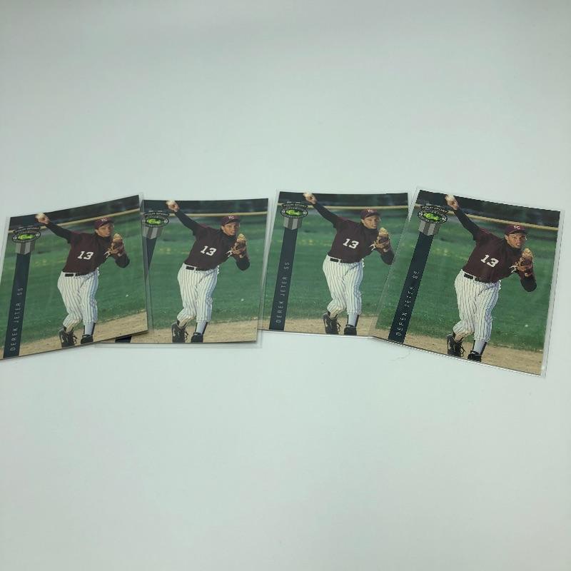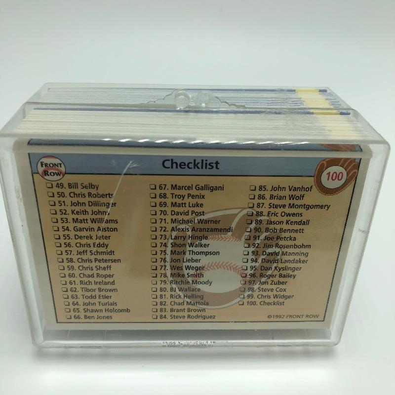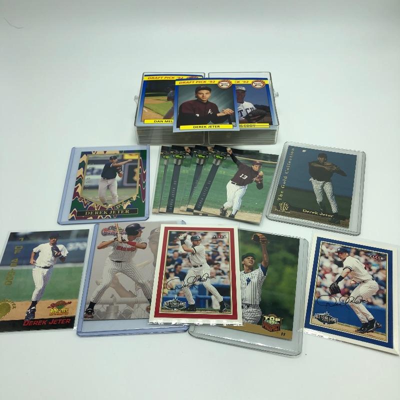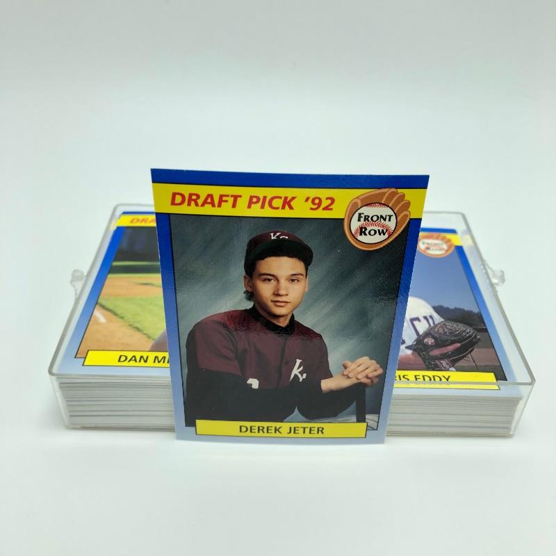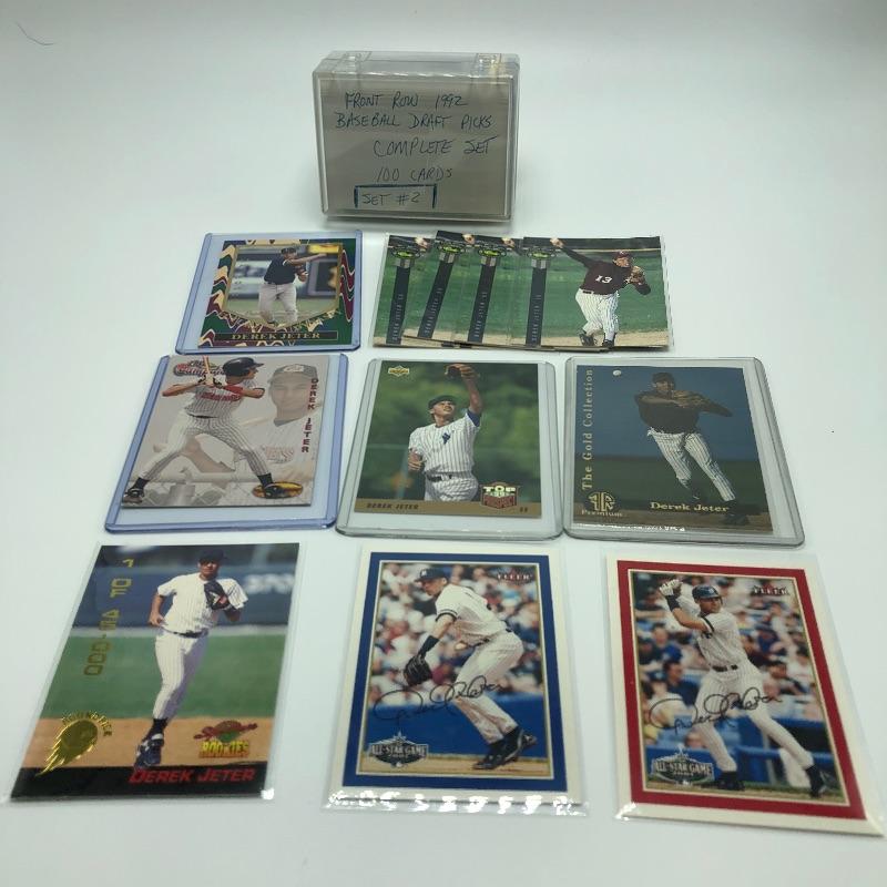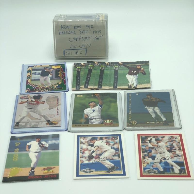 This is a collection of trading cards of Derek Jeter. It includes a 100 card set of front row 1992 baseball draft picks, with a very young Derek Jeter #55. And four 1992 Classic Derek Jeter Four Sport Draft Picks .