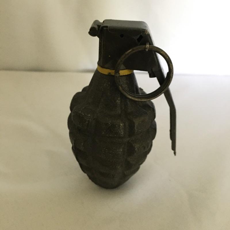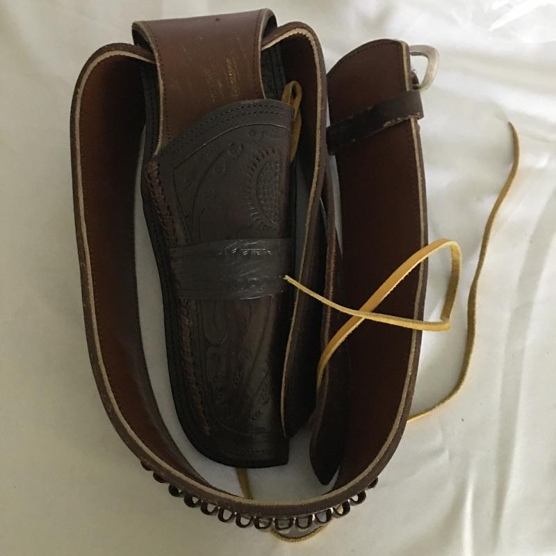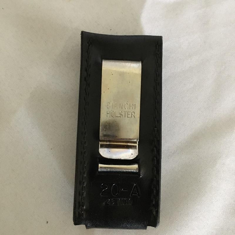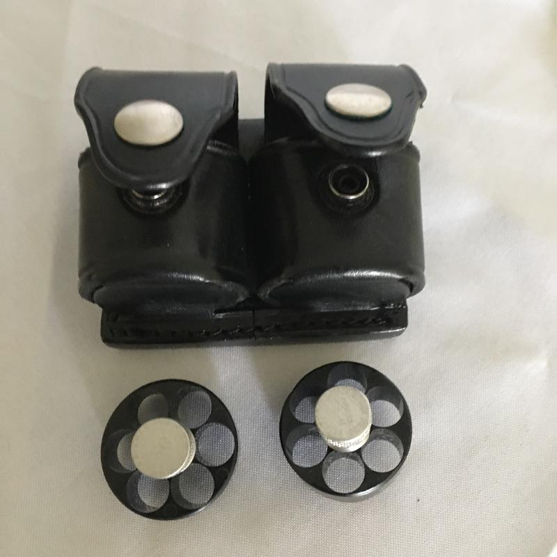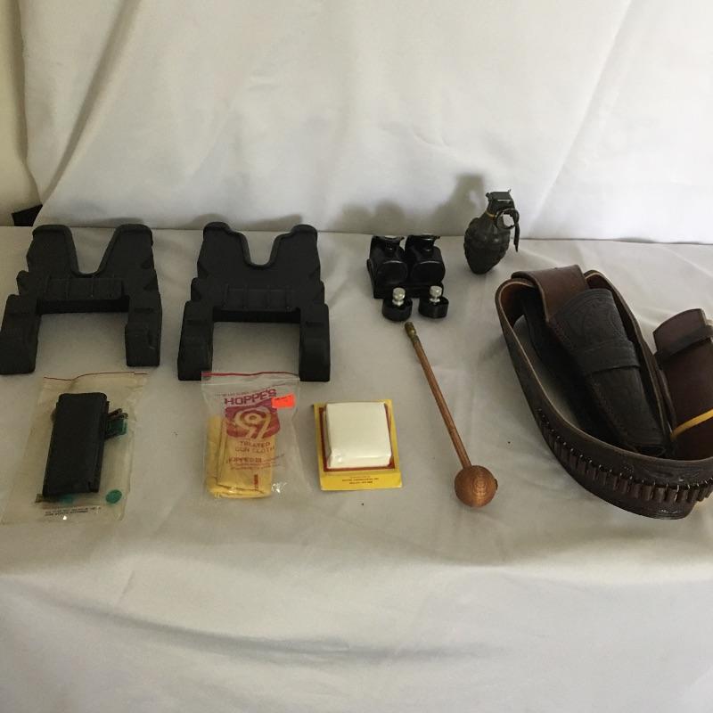 Firearm accessories and more. Lot includes western type leather holster, Bianchi ammo holster, six second reload holster and two speed loaders, inert MK 11 hand grenade, Thompson bullet starter, gun cleaning patches and two Model# 1816 Plano gun holders for a case. A little bit of everything for the firearm enthusiast.