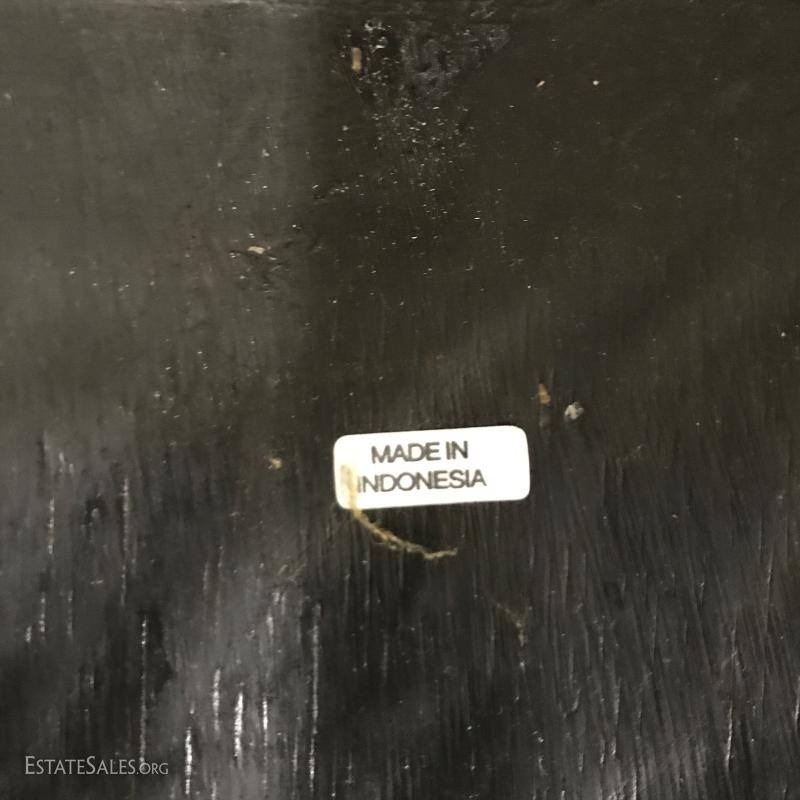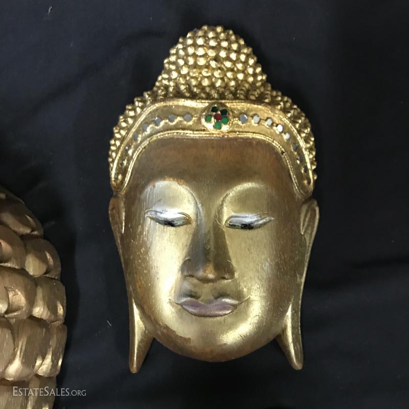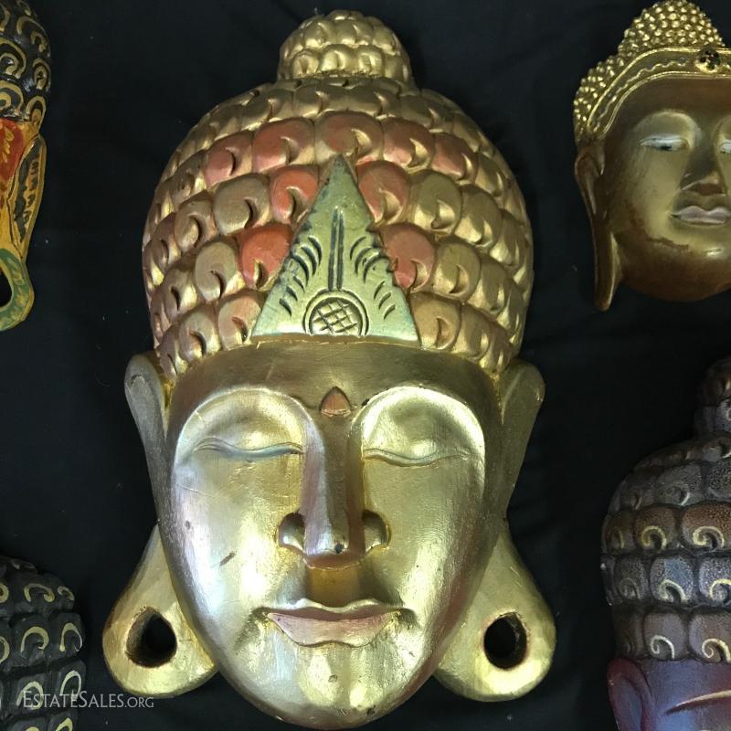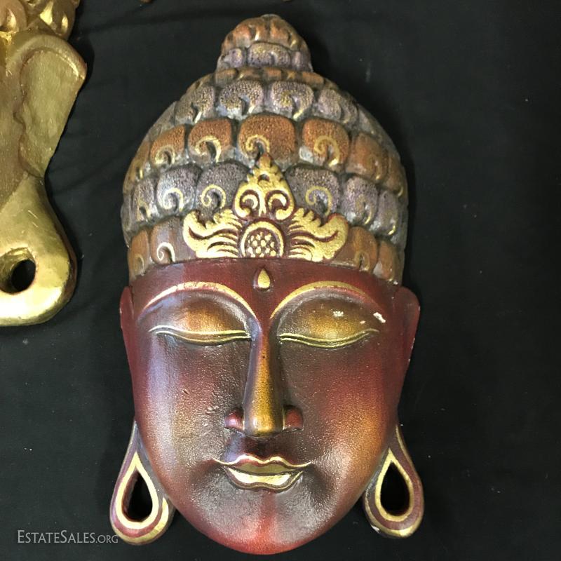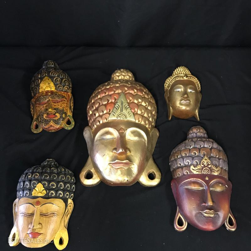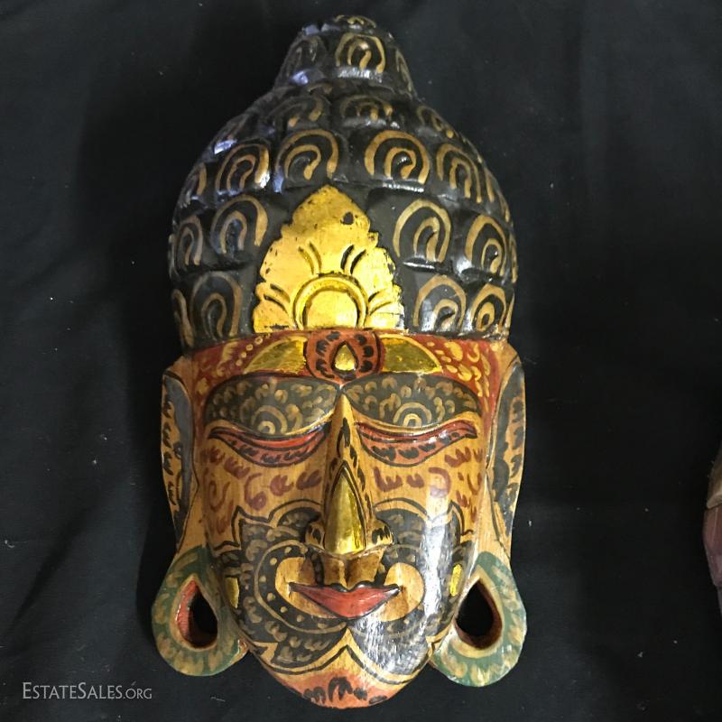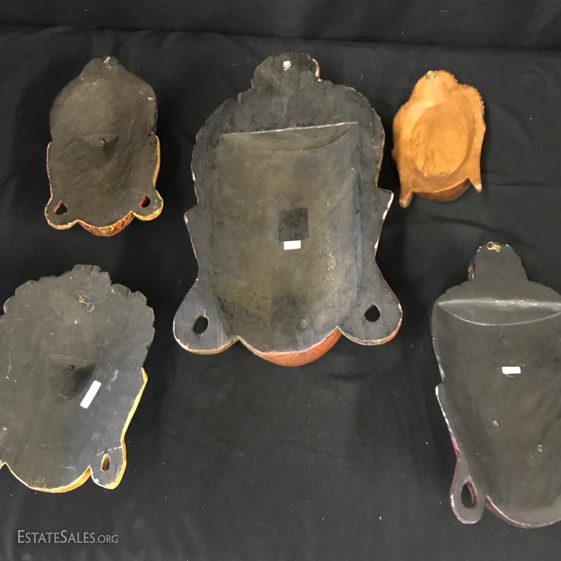 Five colorful wooden face carvings. Three have "Made in Indonesia" stickers. Largest one in middle is 17"l x 10"w. All have hooks for hanging. Shipping available or local pick up in Waynesville, NC.