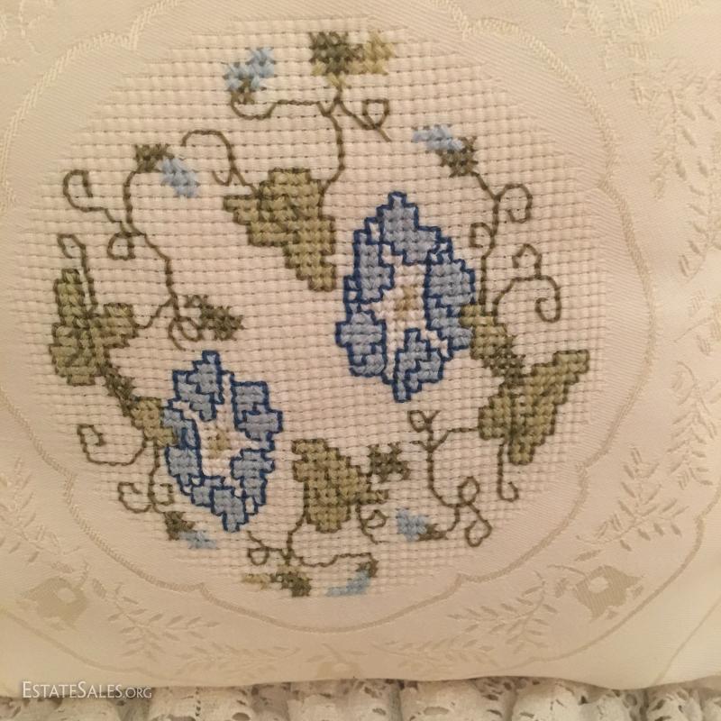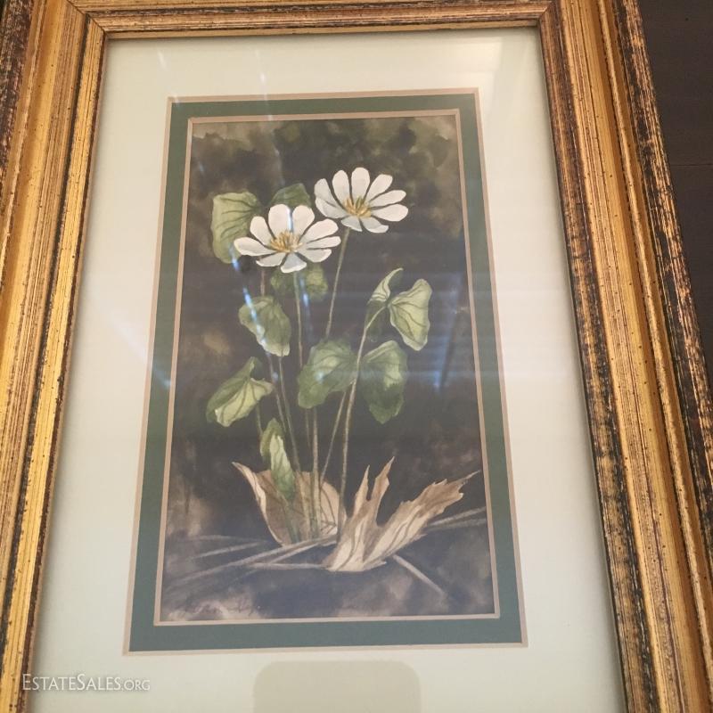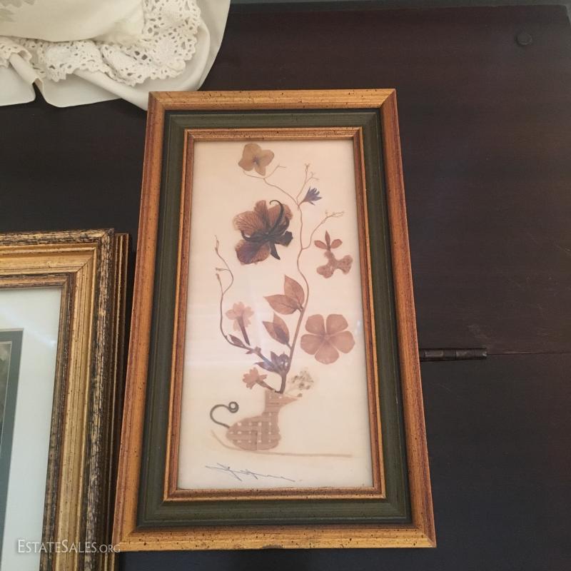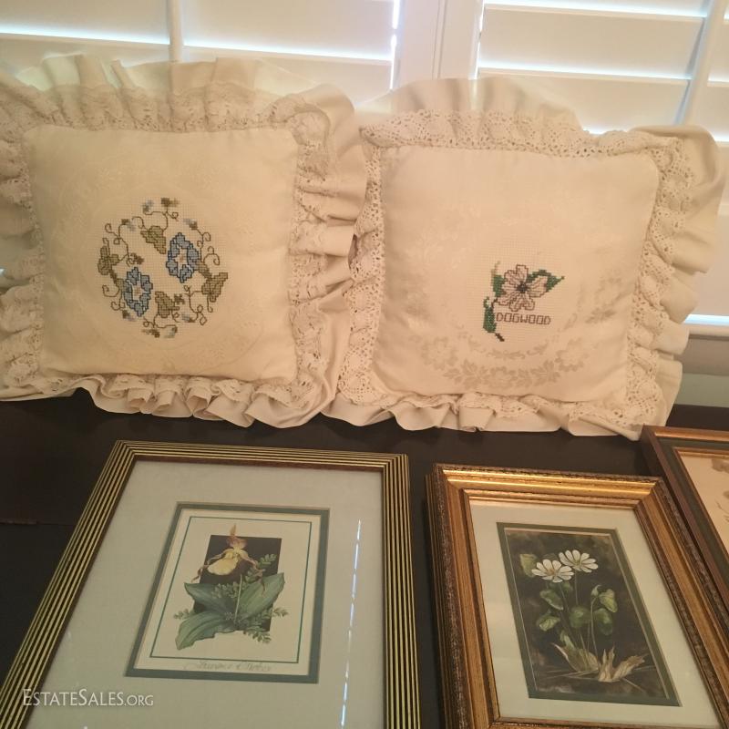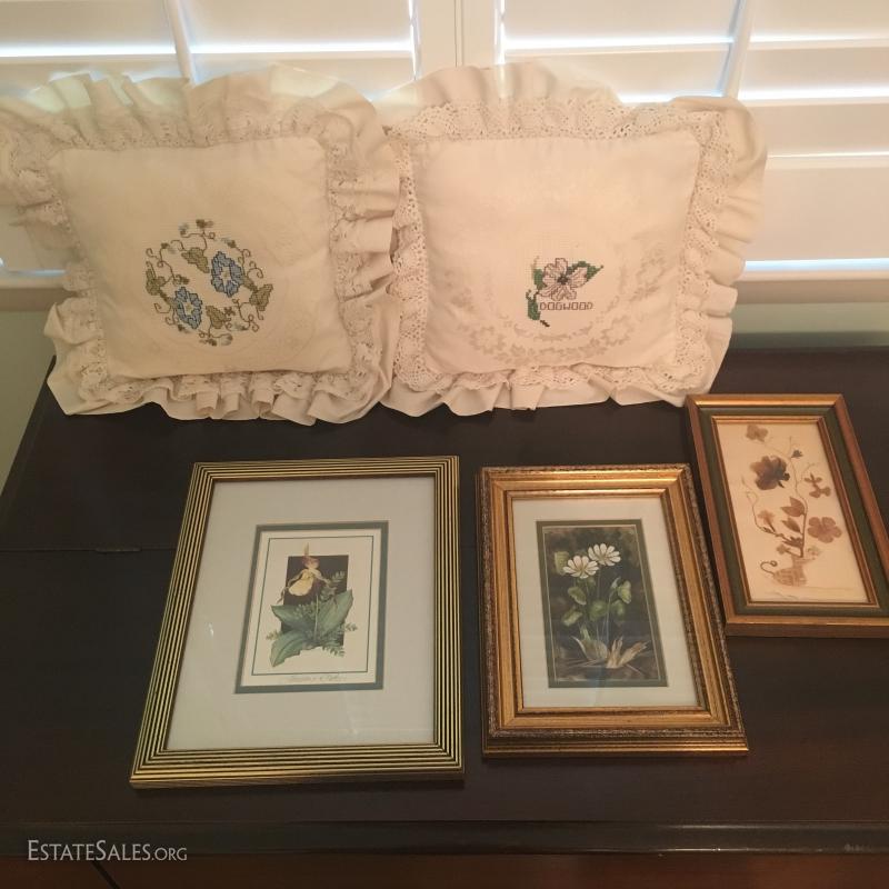 Two small cross stitch pillows with lace. Off white in color. Three framed art pieces. Smallest one is pressed floral bouquet. Unable to verify artist signature. Middle sized one is an original watercolor by Alabama artist Joan Heflin Rankin, and largest is watercolor by Oregon artist Larry R. McKee, measuring 11" x 9" This lot is available for shipping or local pick up in Asheville, NC.
