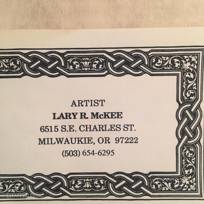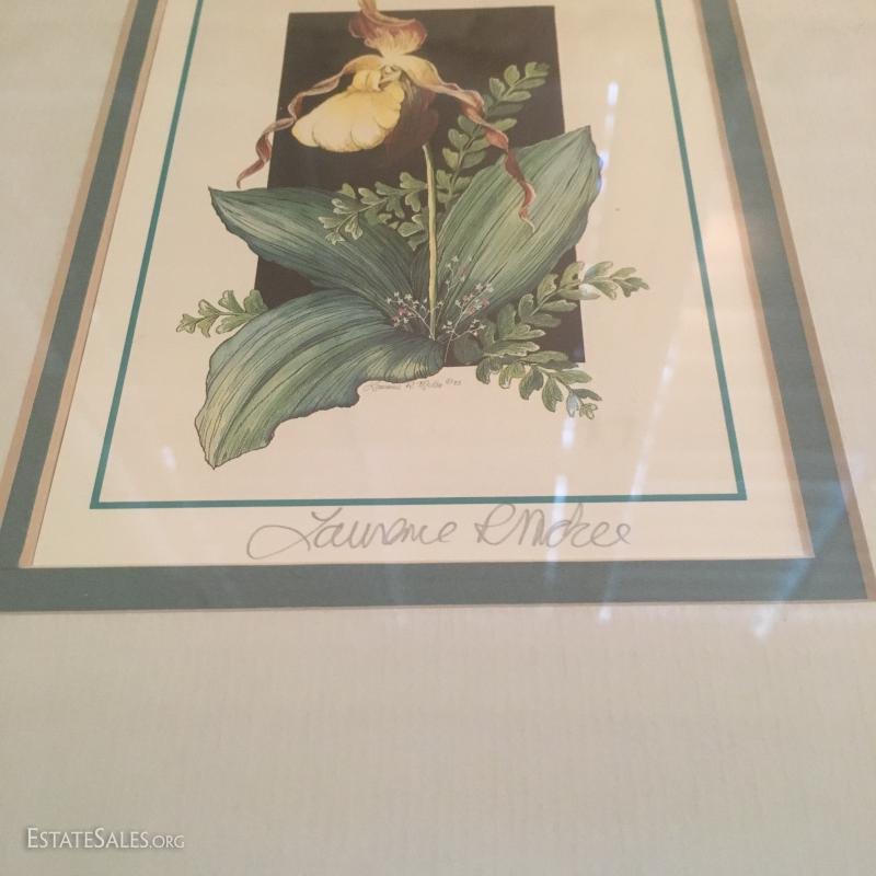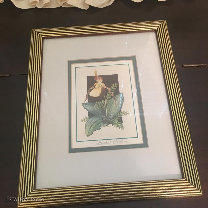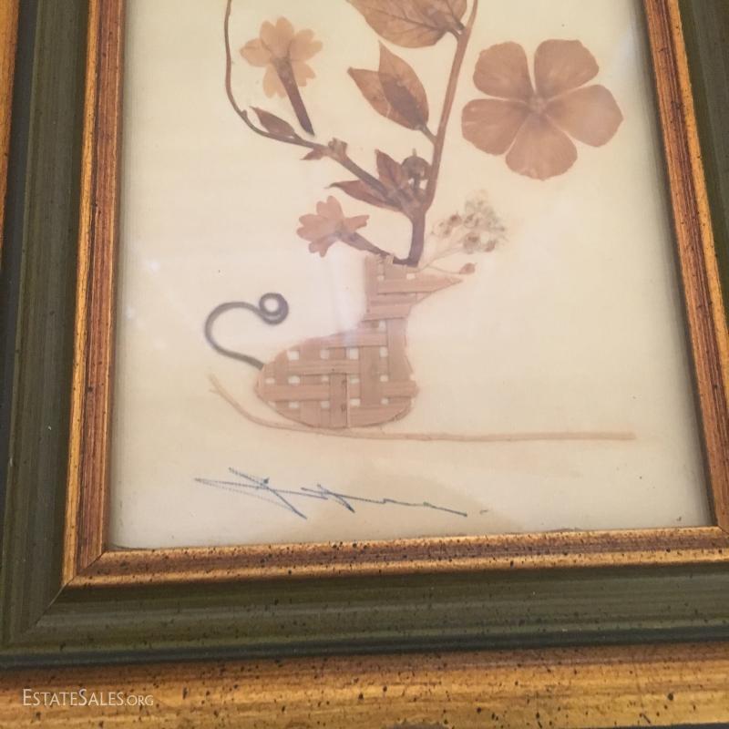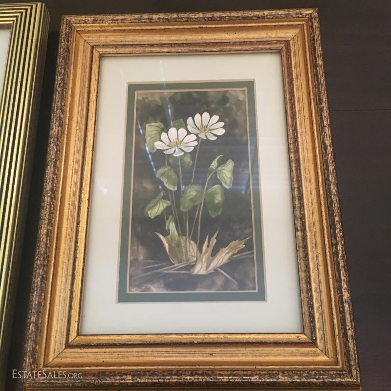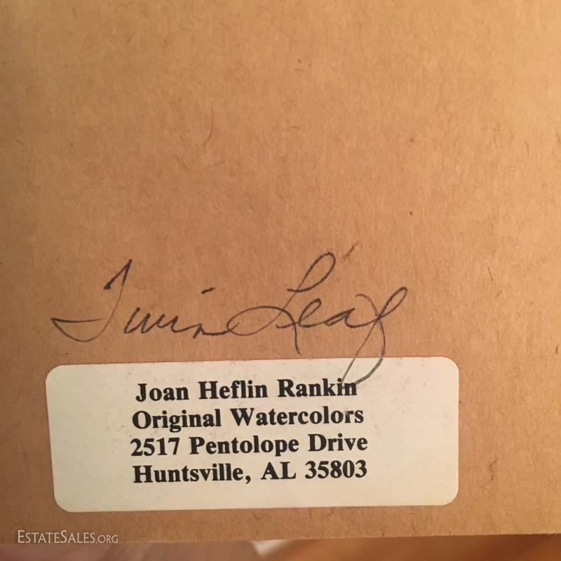 Two small cross stitch pillows with lace. Off white in color. Three framed art pieces. Smallest one is pressed floral bouquet. Unable to verify artist signature. Middle sized one is an original watercolor by Alabama artist Joan Heflin Rankin, and largest is watercolor by Oregon artist Larry R. McKee, measuring 11" x 9" This lot is available for shipping or local pick up in Asheville, NC.