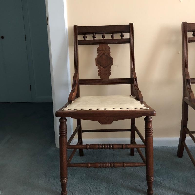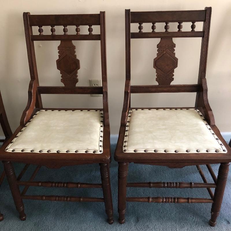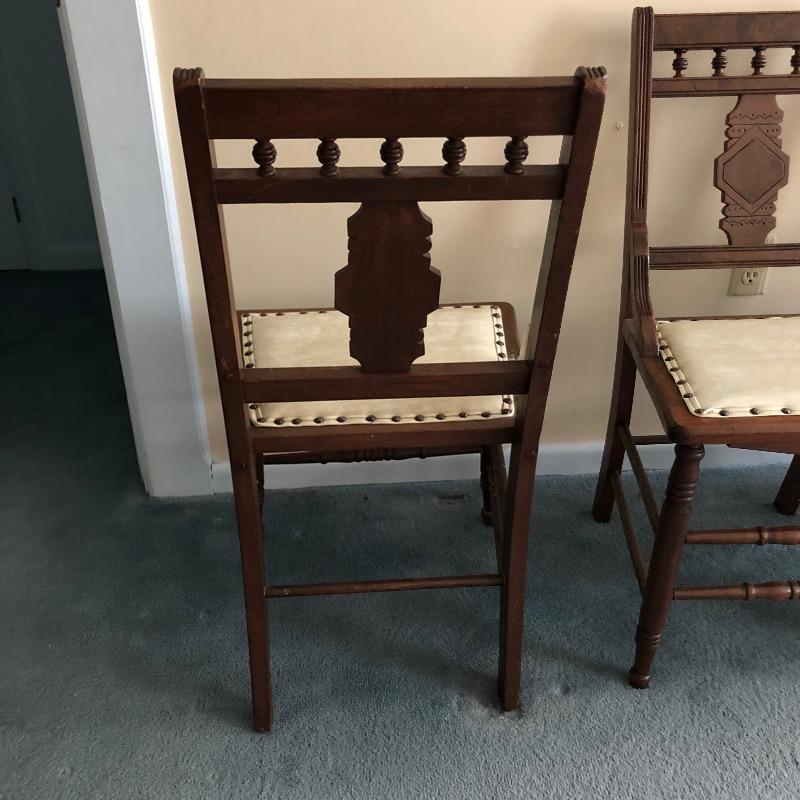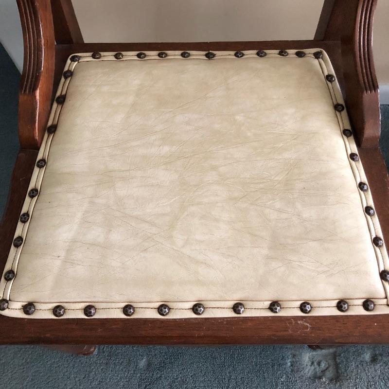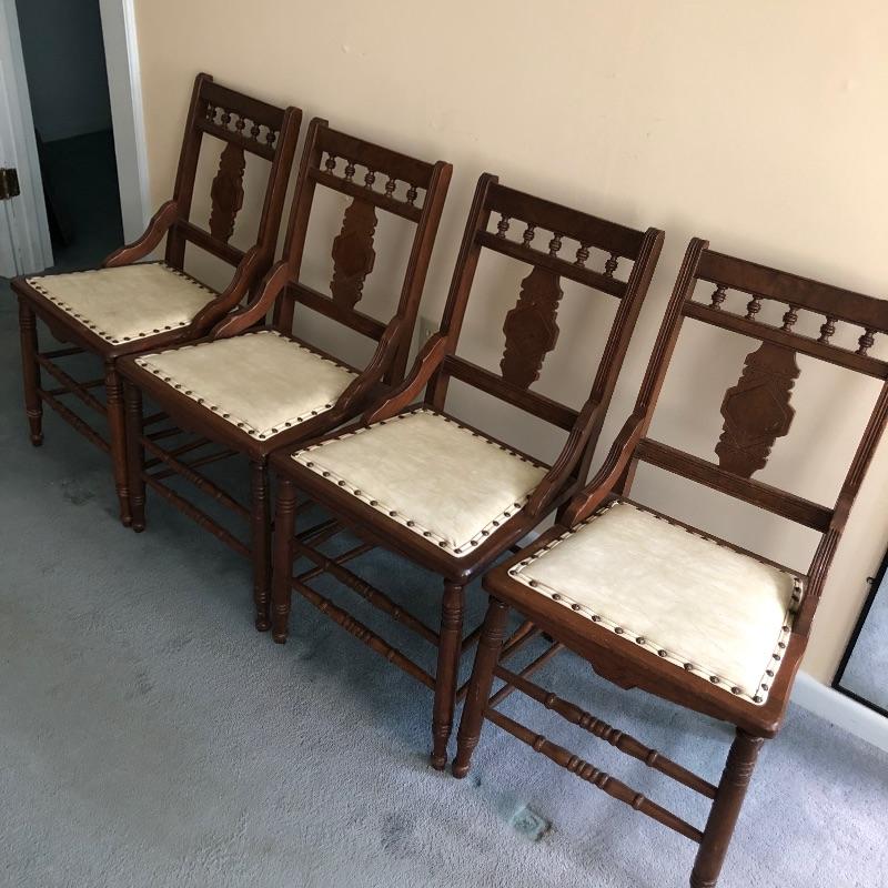 These four chairs are a wonderful vintage find! Beautifully carved dark wood with off white vinyl seats and metal studs. They are in well loved condition with just a few minor cracks in the vinyl and typical scuff marks on the legs that are shown in the latter images.