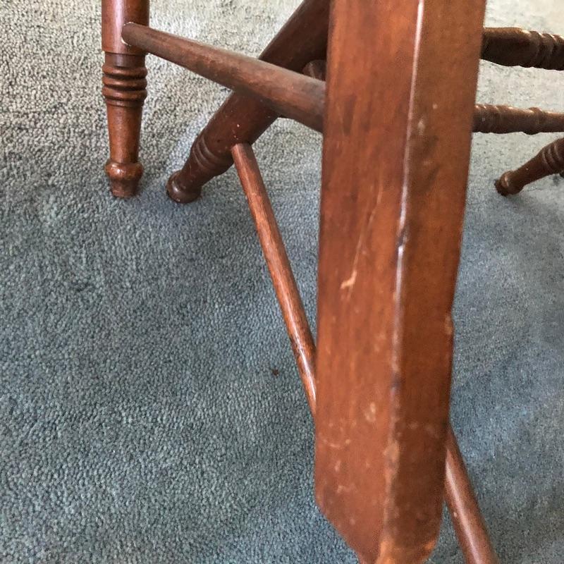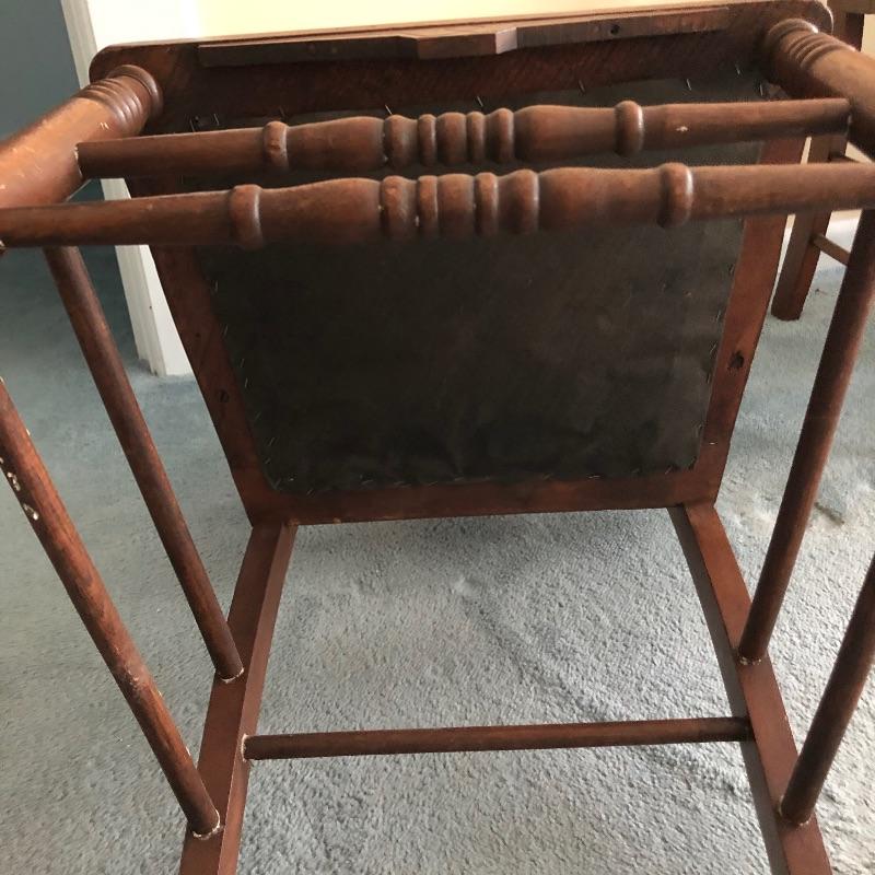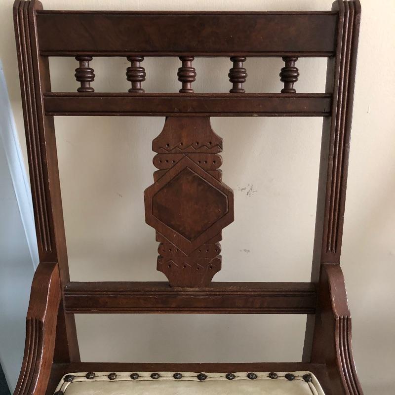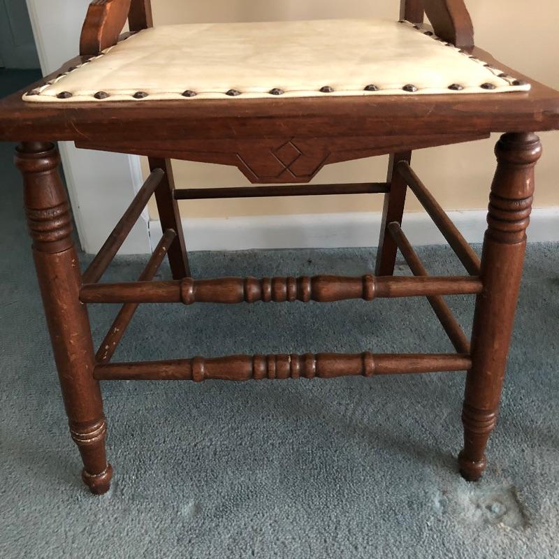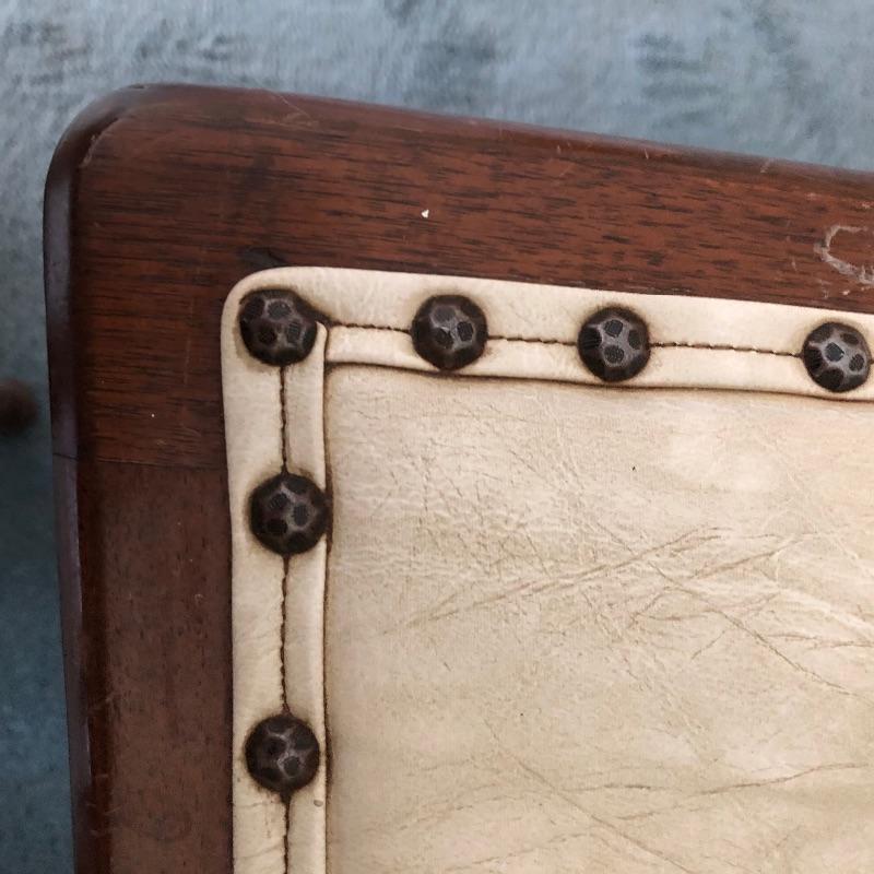 These four chairs are a wonderful vintage find! Beautifully carved dark wood with off white vinyl seats and metal studs. They are in well loved condition with just a few minor cracks in the vinyl and typical scuff marks on the legs that are shown in the latter images.