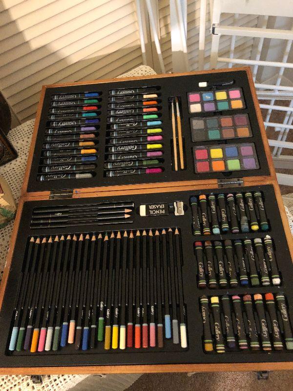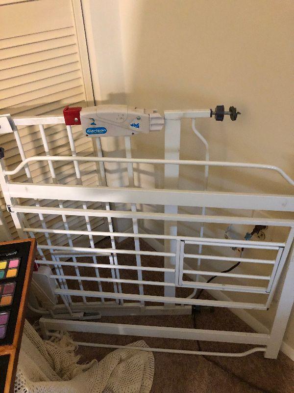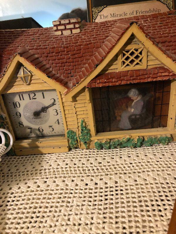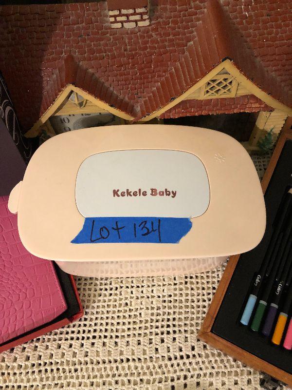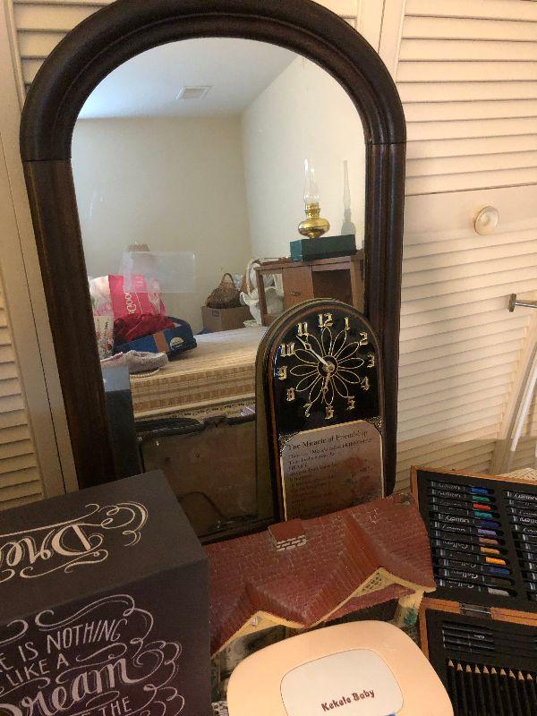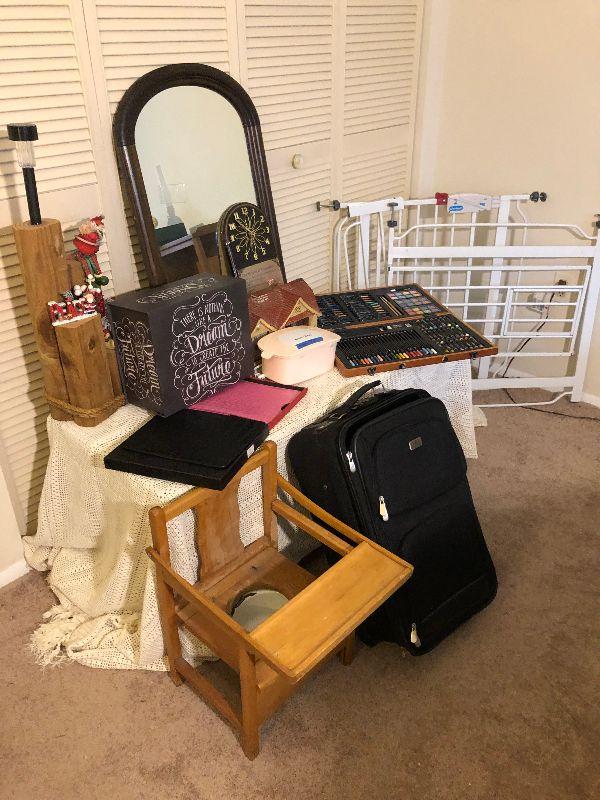 Vintage clock, baby gate, potty, kiddie wipe warmer, artist set in wooden box, Christmas lamp and other miscellaneous items.