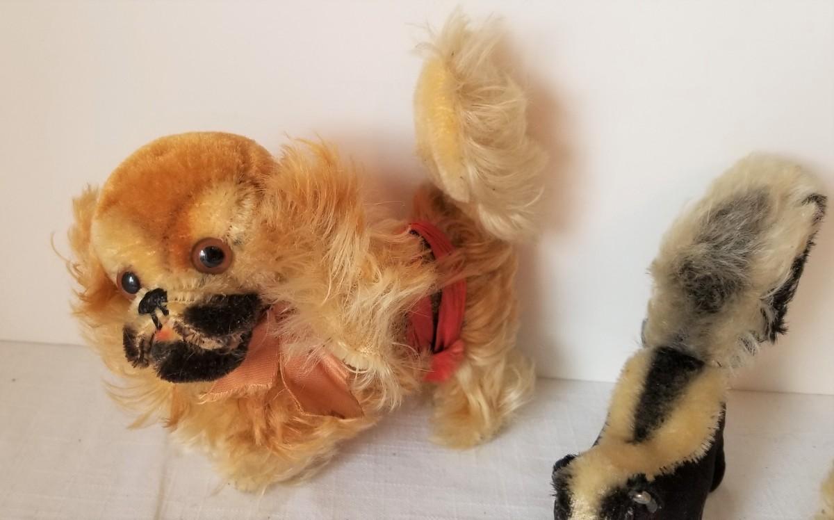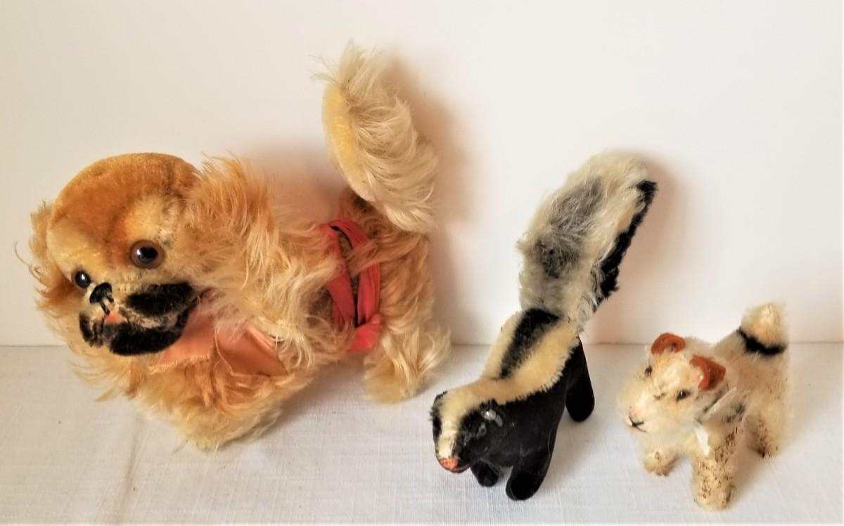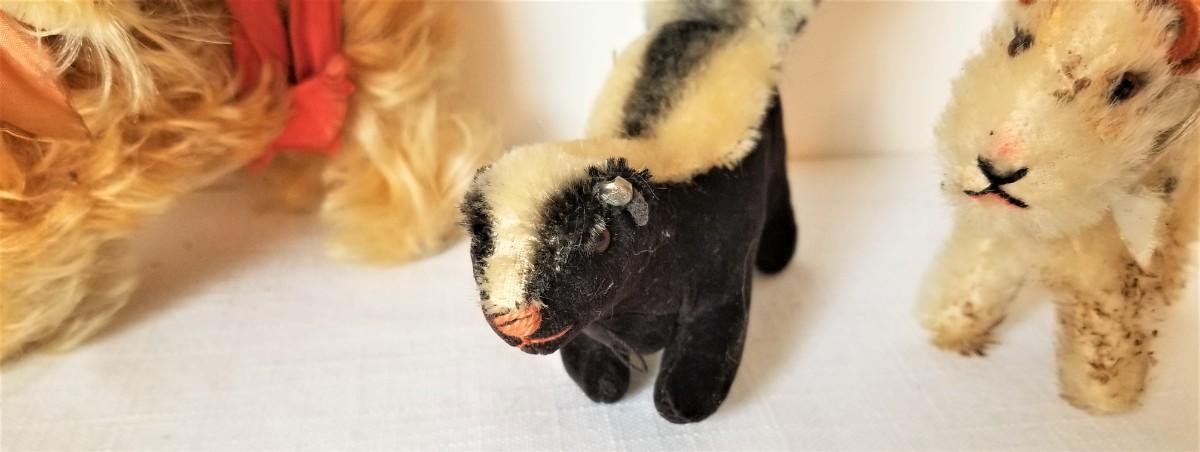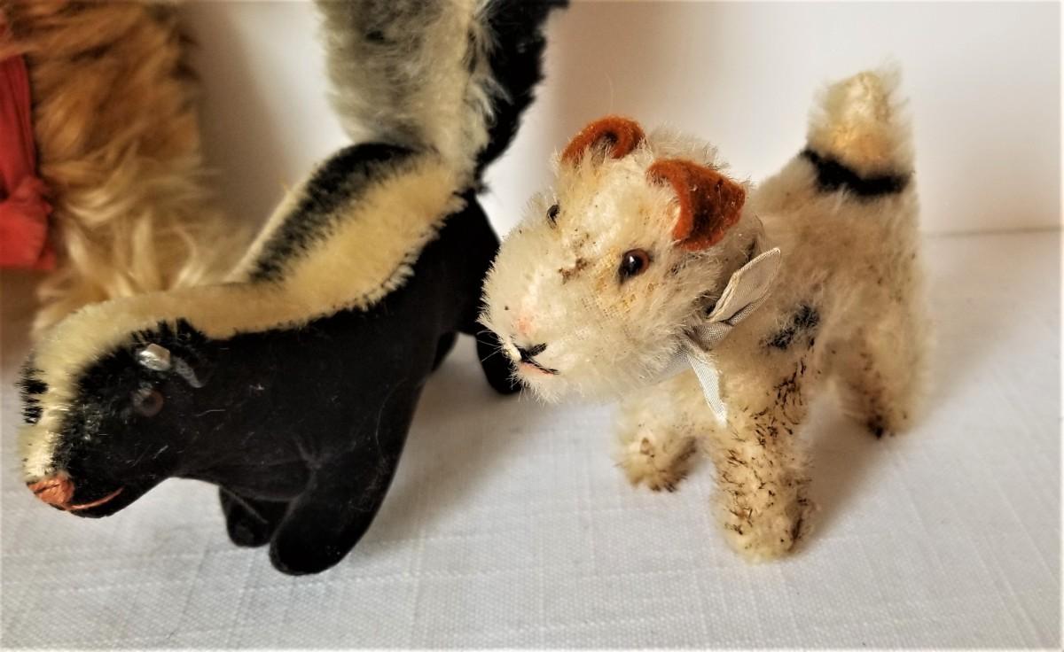 Sweet lot of vintage STEIFF stuffed animals - 2 dogs and a skunk. Skunk has ear button. Small airedale is 3.5" long and could use a bit of a clean (as found - not too bad). Large dog is 7" across, skunk is very cute and is 6.25" (includes tail). Gently used, no weird odors, etc. You don't see too many vintage Steiffs in this market.