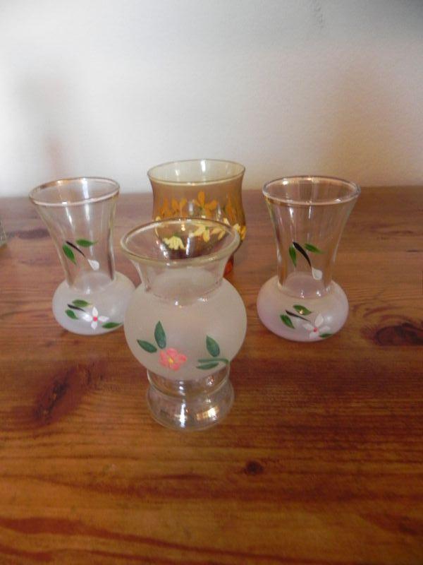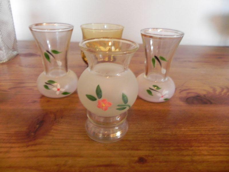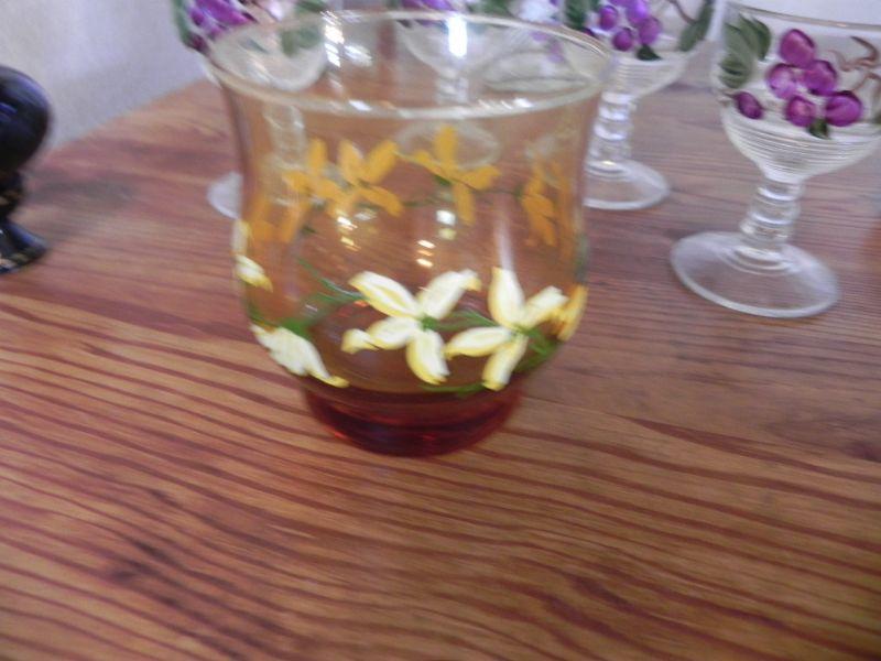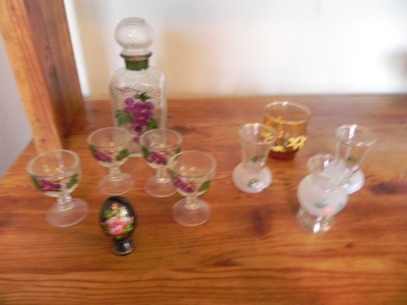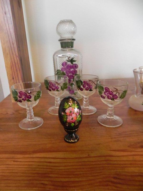 DECANTER AND 4 MATCHING STEMMED GLASSES, PAINTED EGG, BUD VASES AND MORE