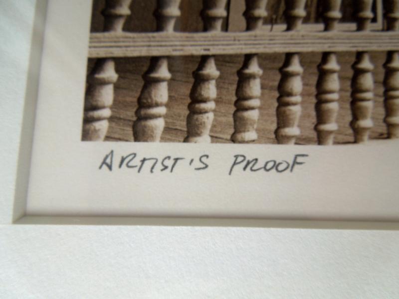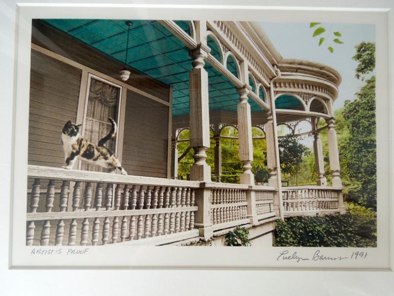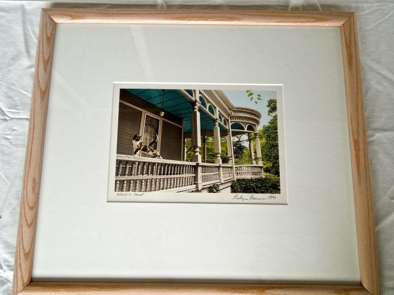 Handtinted photograph by Evelyn Barnes. Signed. Dated 1991 Artist proof of a cat on a front porch of a coastal old home. 20 x 16" to outside of frame.
