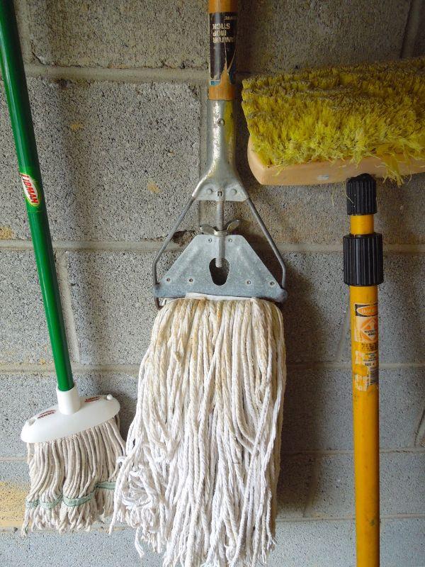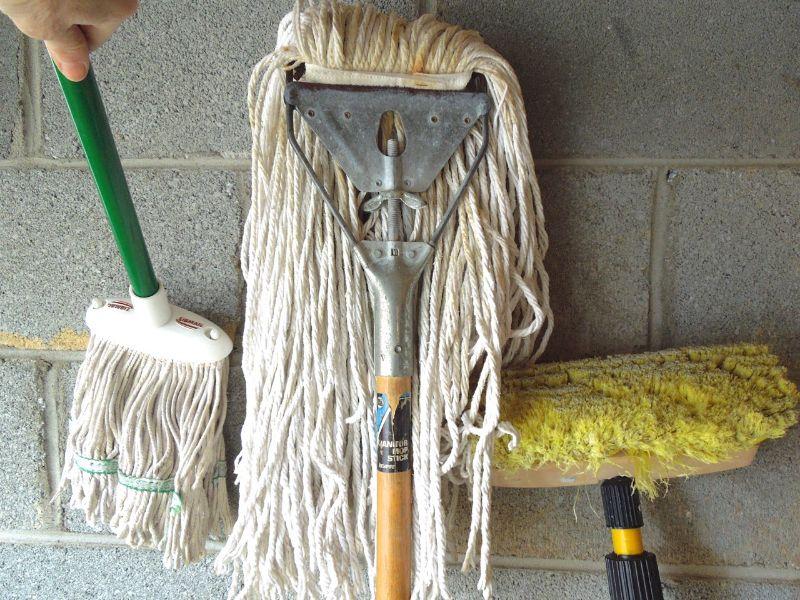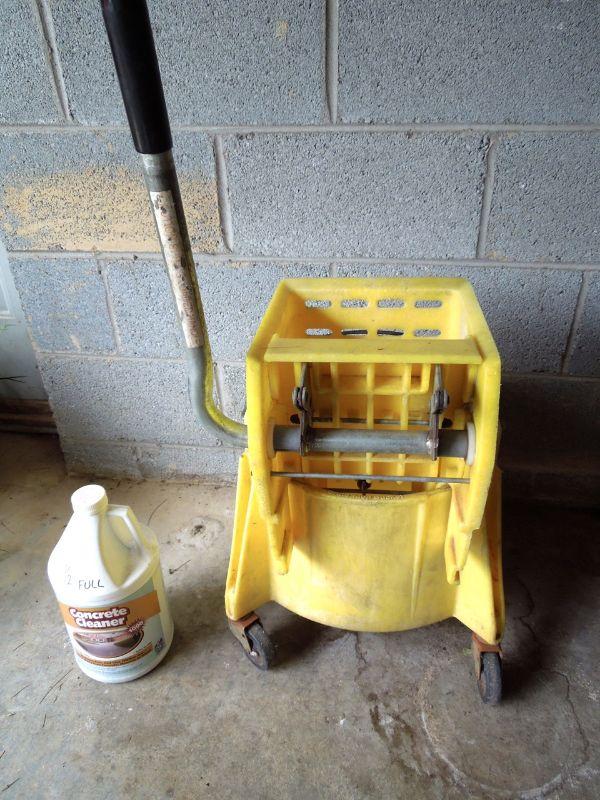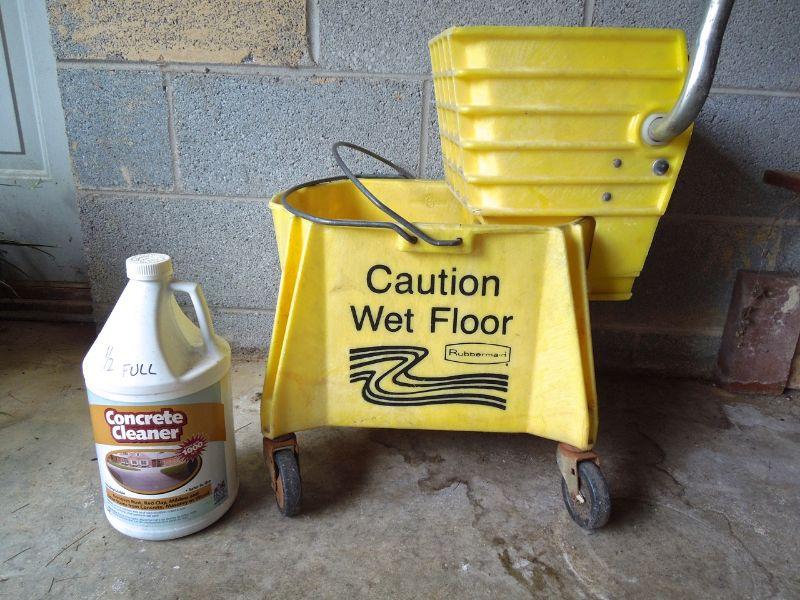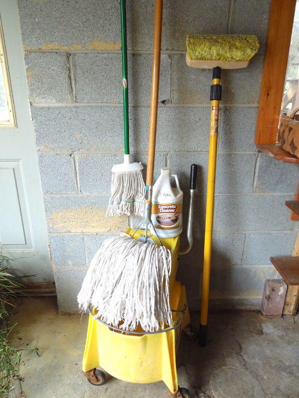 Nice yellow industrail commercial wringing mop bucket, string mop with wood handle, smaller string mop with extra mophead, long handled bristle brush and 1/2 full jug of concrete cleaner.