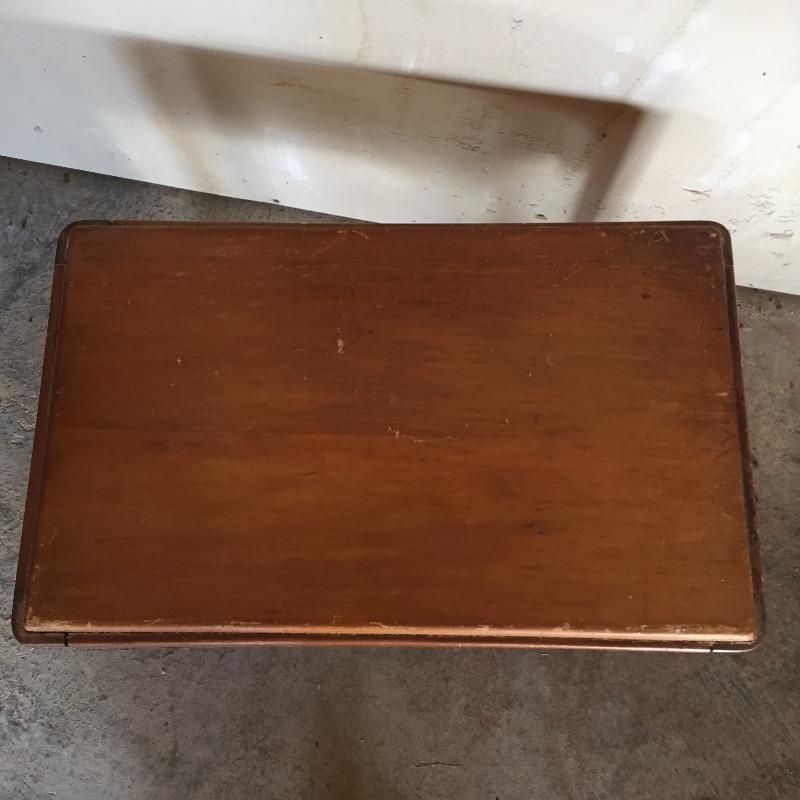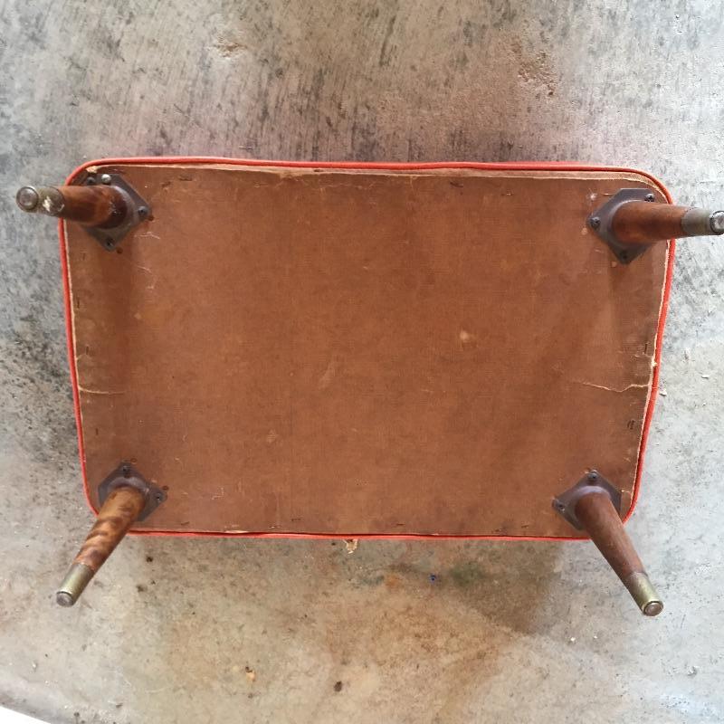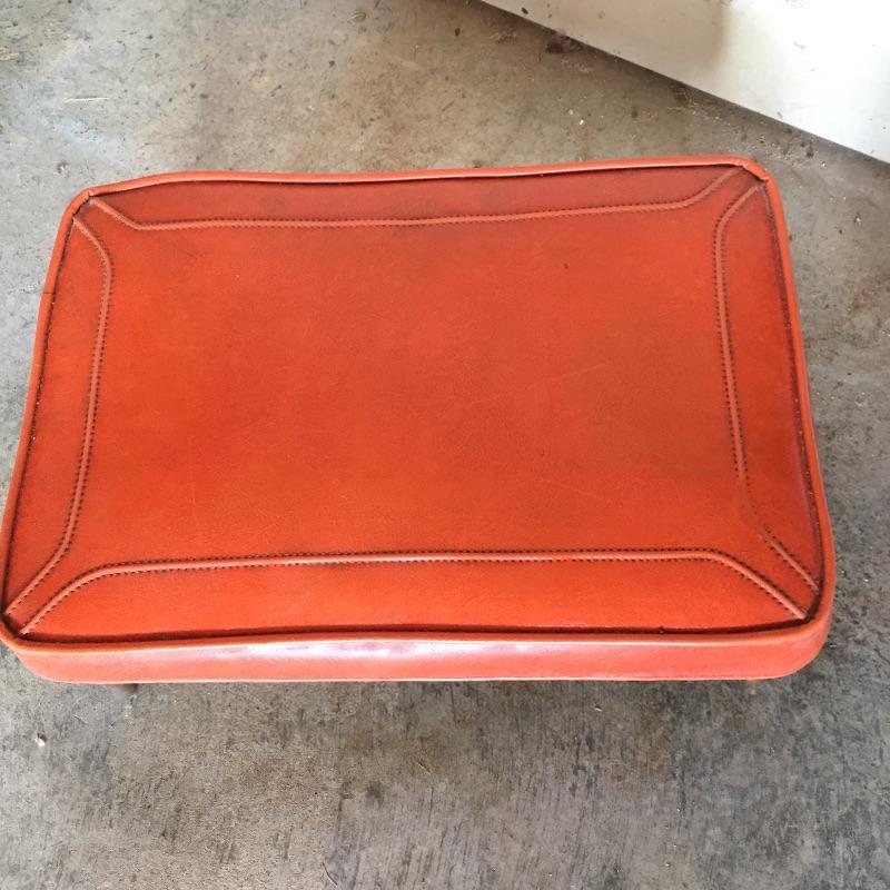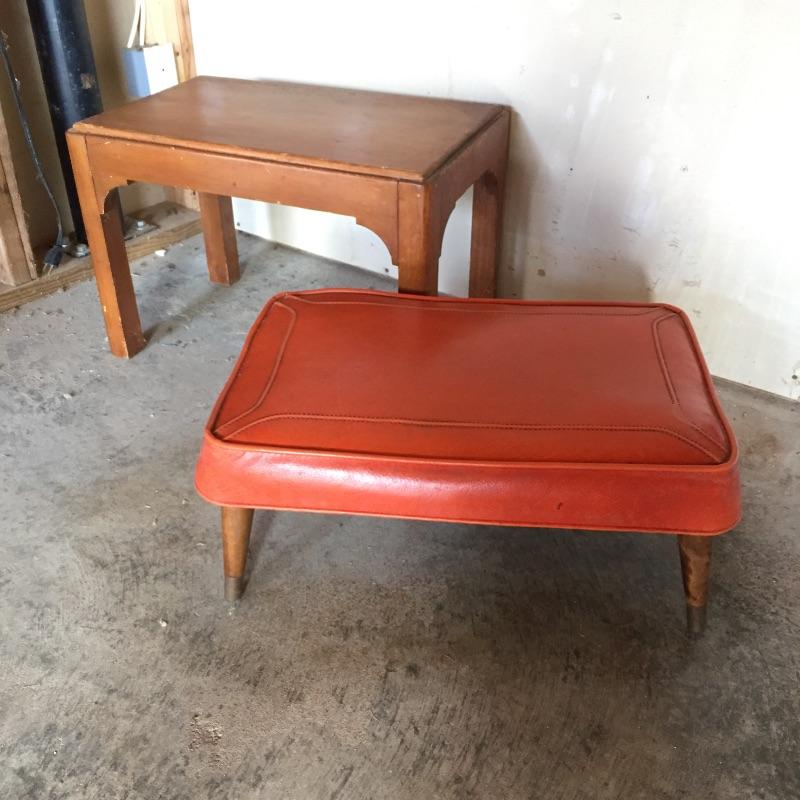 It’s hard to find a Mid Century modern foot stool in this good of a condition. Orange with wooden legs and no tears, fading or scuffs, it’s a vintage gem and most likely made of orange vinyl. Included with the foot stool is a small wooden table that measures 14” x 23” x 15”.