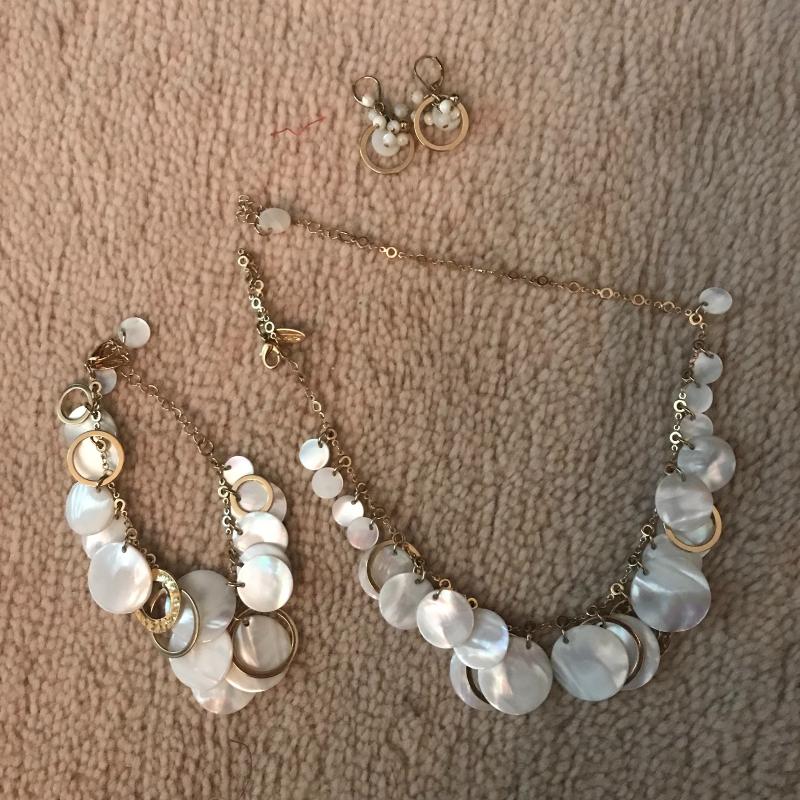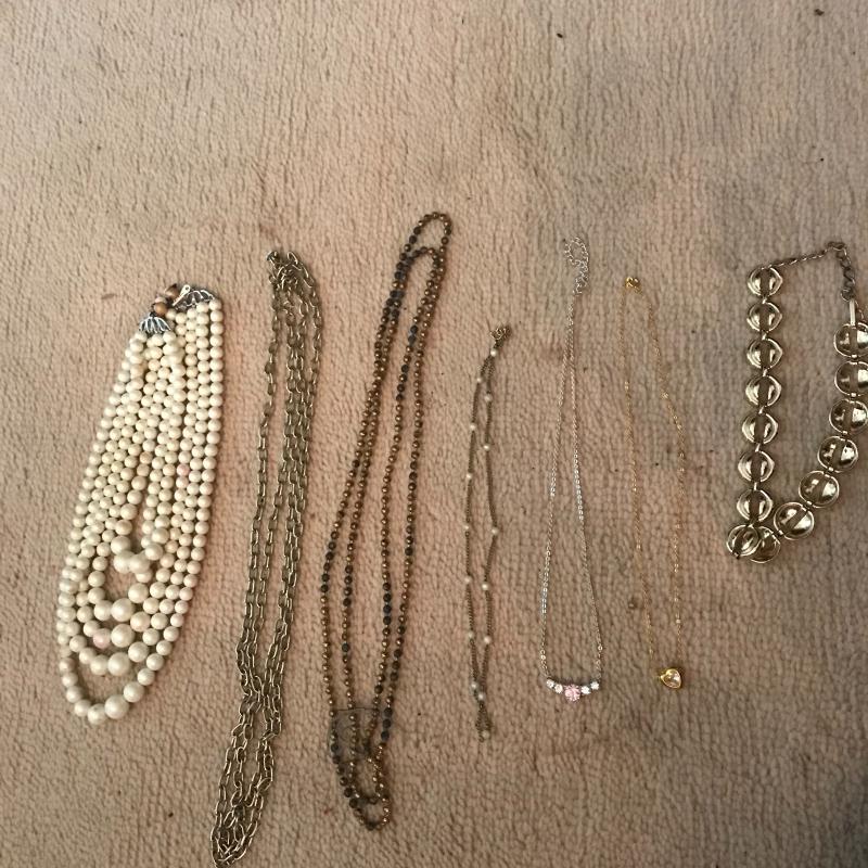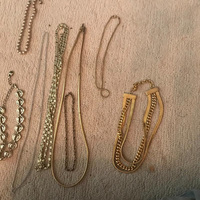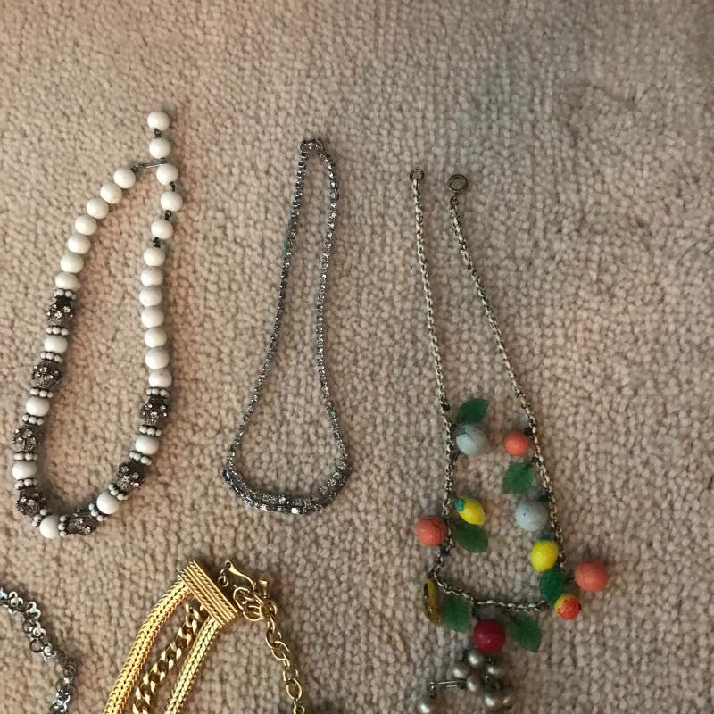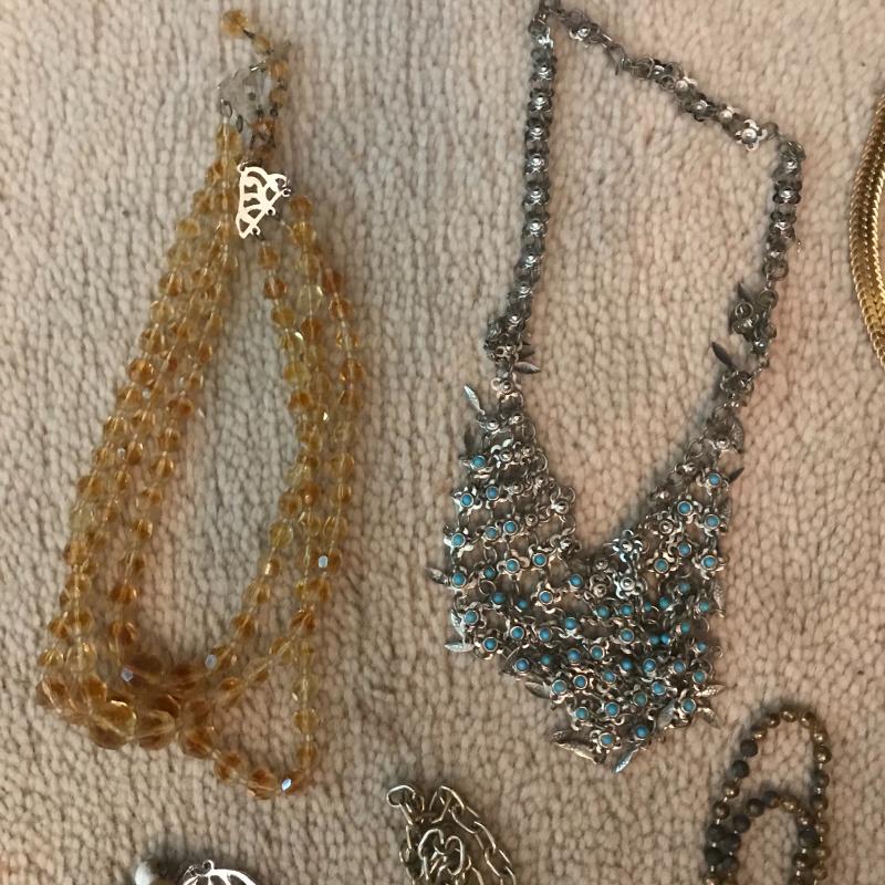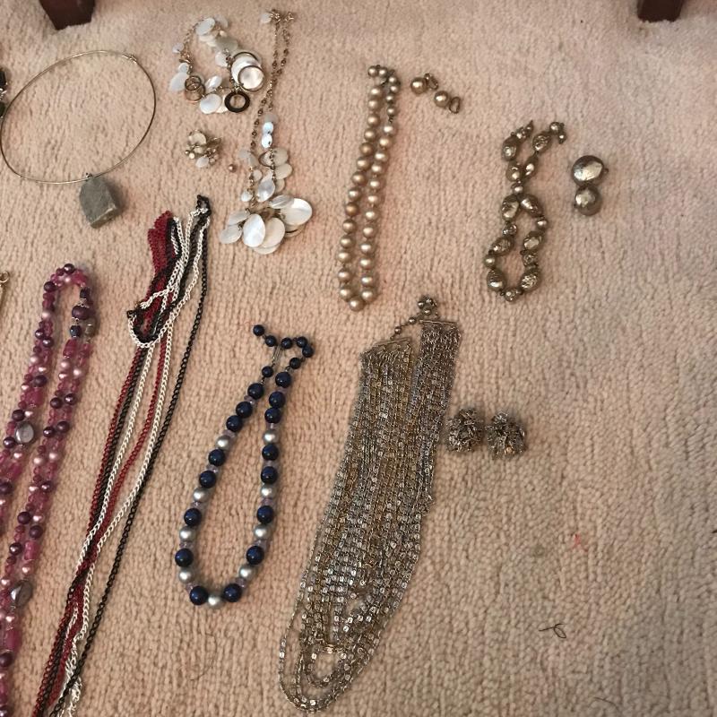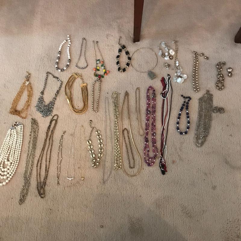 Lot of varying styles and era necklaces. 4 as sets with earrings and or bracelets. Most are costume but some are sterling. A few are unique vintage styles. Lot also includes a thin gold belt. Available for shipping or local pick up.