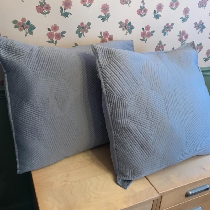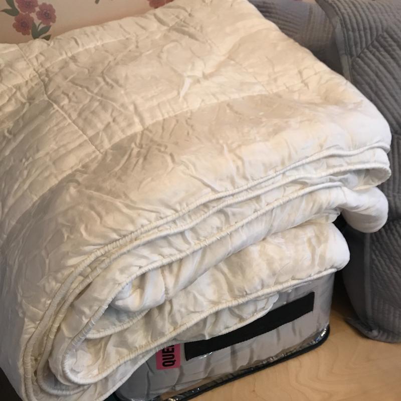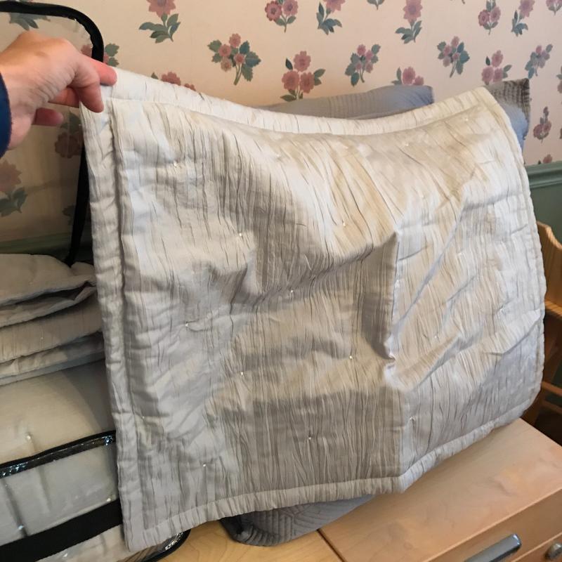 Nice light grey queen comforter with two matching standard shams. Two 24” square decorative pillows in darker grey. One silk comforter with recent dry cleaning bill attached. Small yellow stain on silk comforter. Shipping or local pick up in Flat Rock, NC.