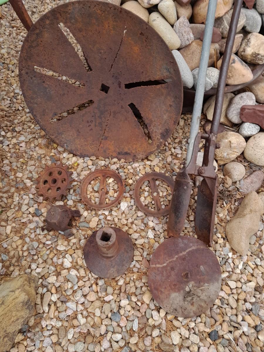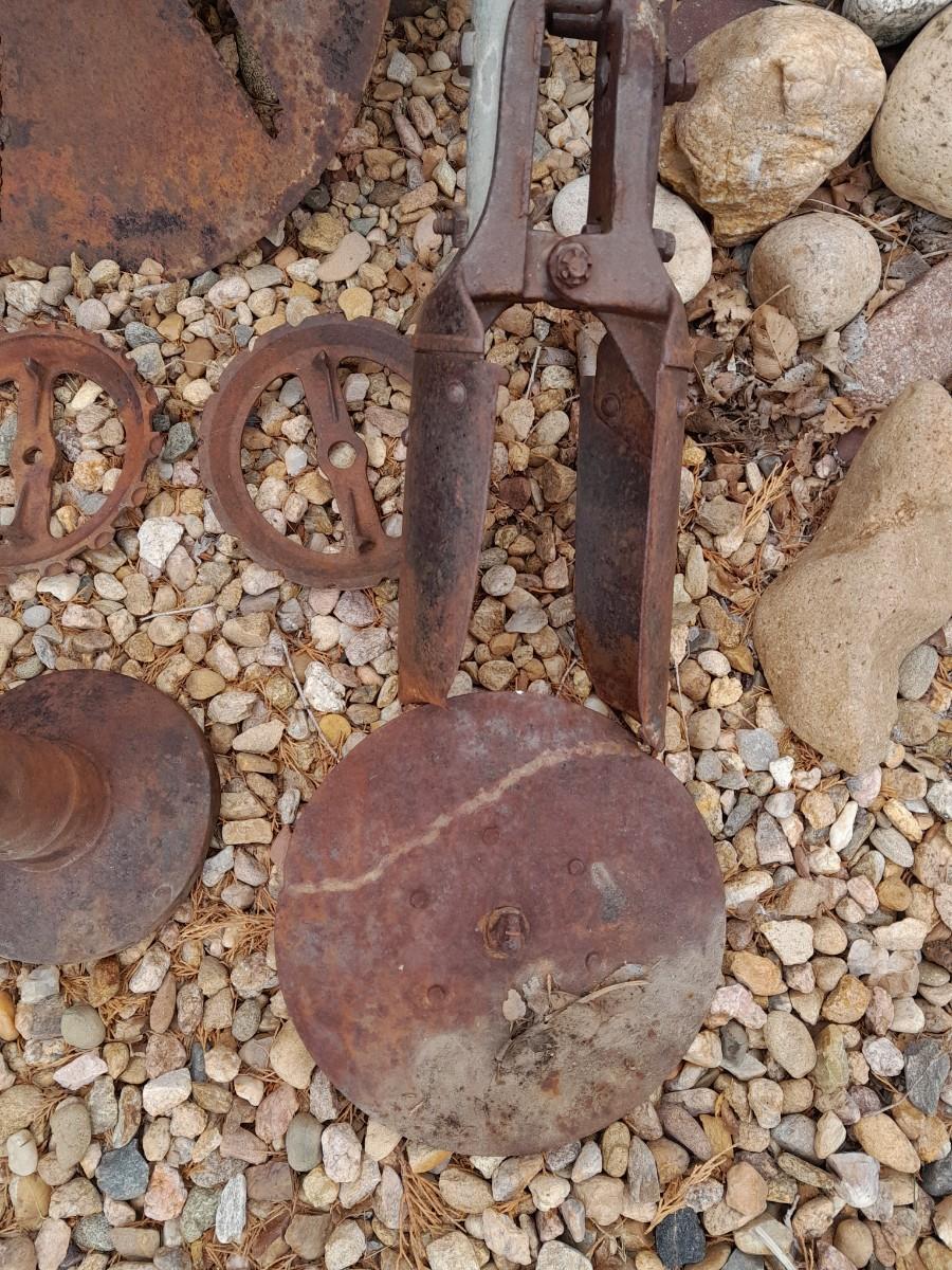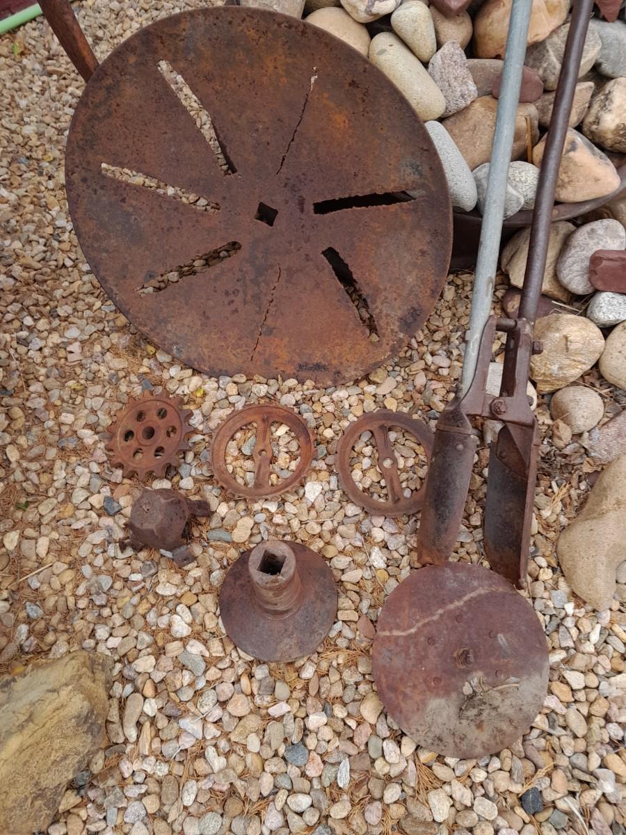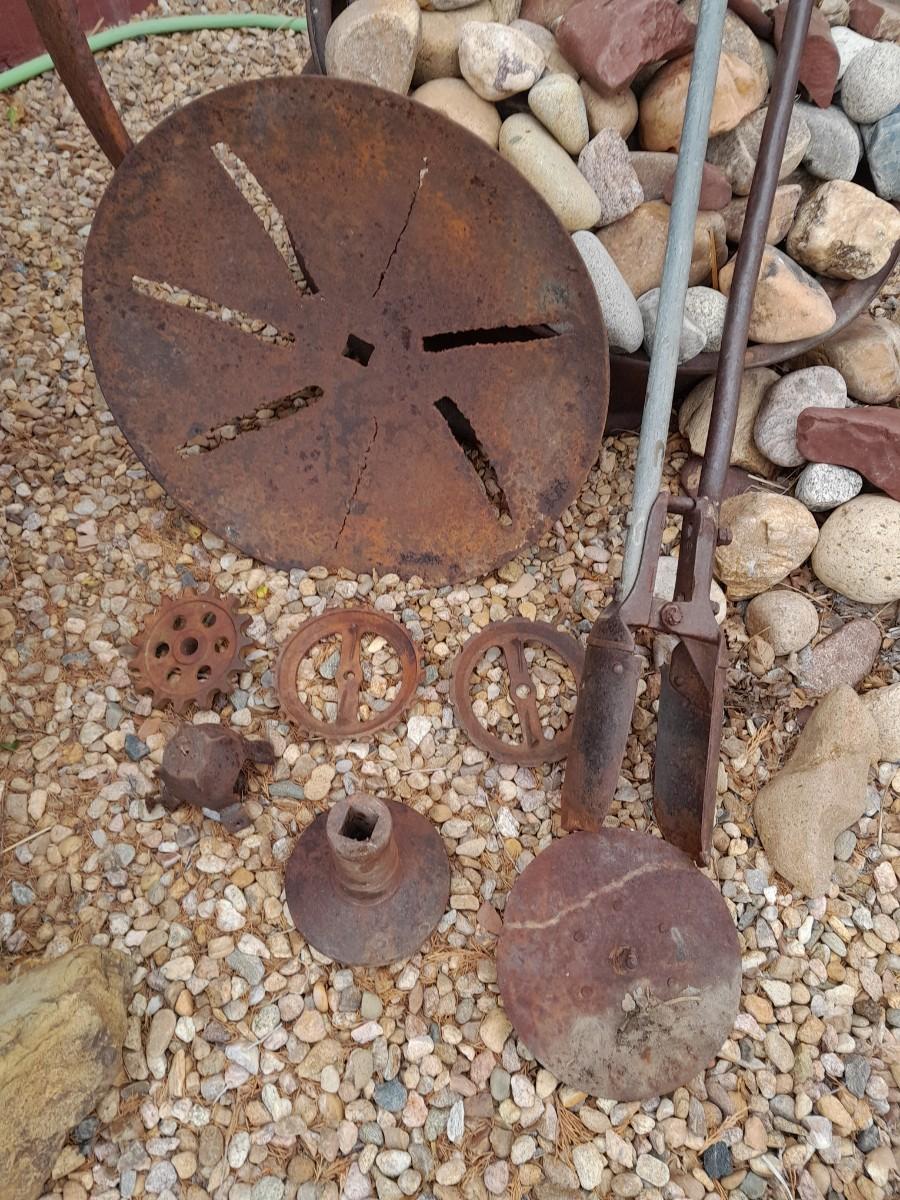 RUSTY FARM GEARS AND TOOLS FOR YARD / GARDEN ART