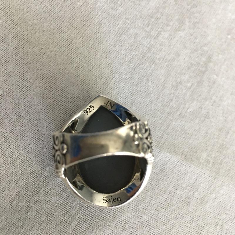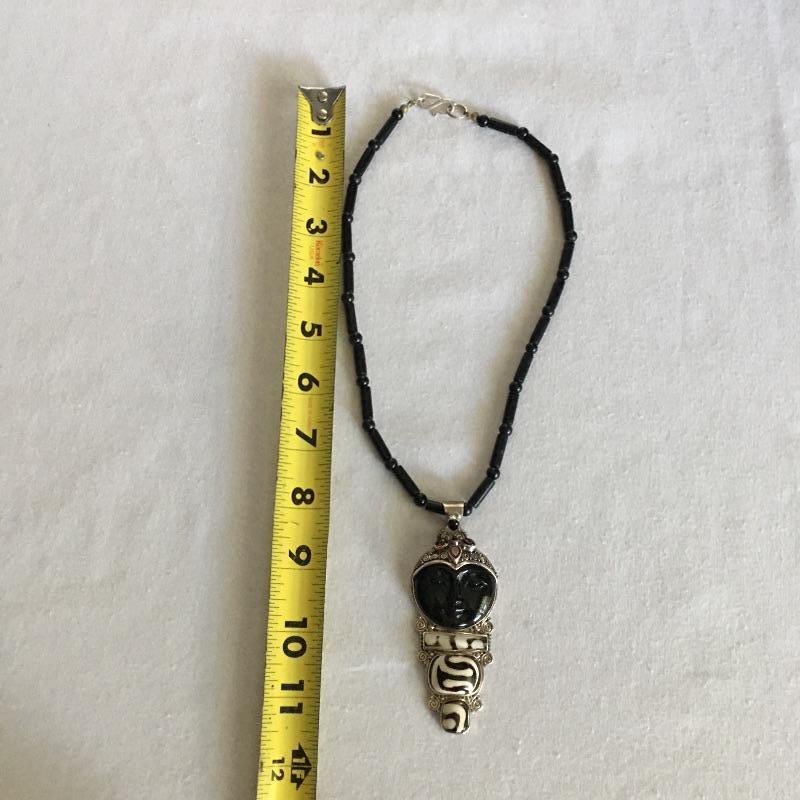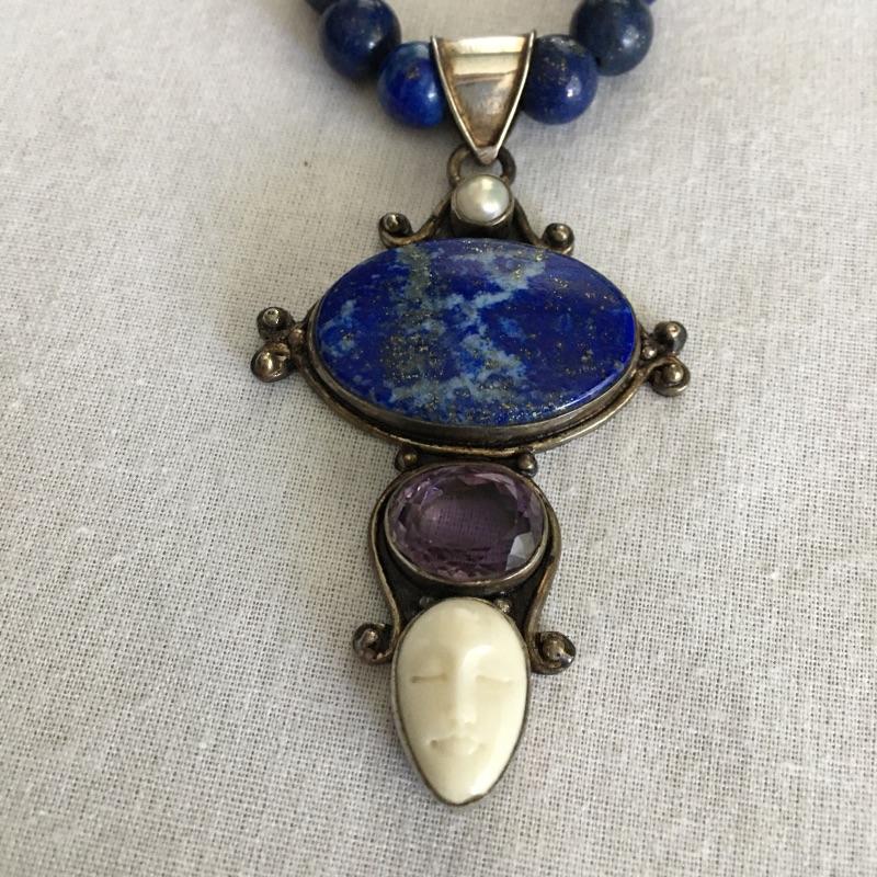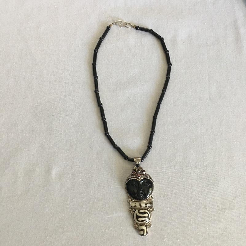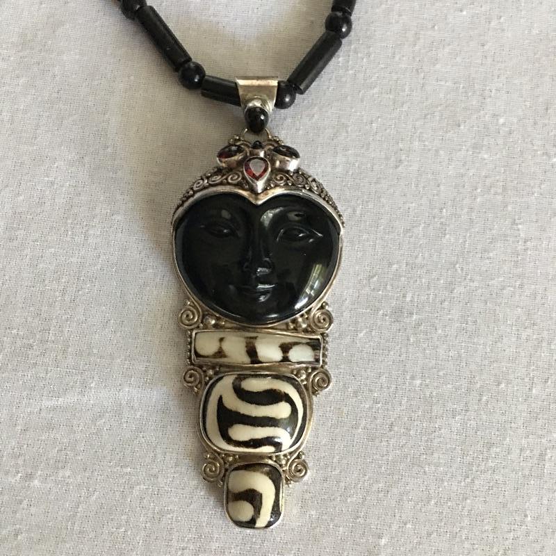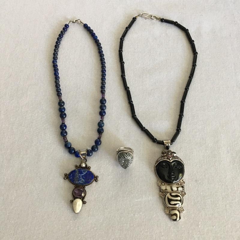 Sajen jewelry is silver with semi=precious stones that are proposed to be healing stones all put together to produce gorgeous contemporary pieces. Many of these pieces include the classic Sajen Goddess face. Included is a ring with a teardrop druzy stone with a zebra print set in sterling silver, Sajen necklace set in sterling silver with natural stones and necklace with a face and stones set in sterling silver. All three pieces are marked 925.