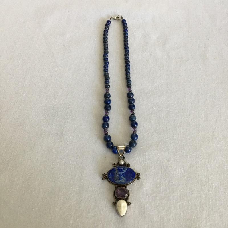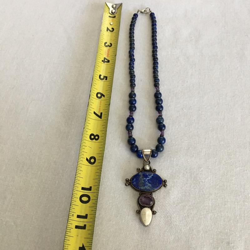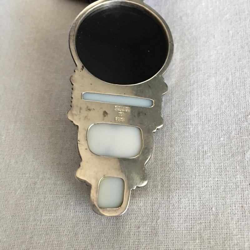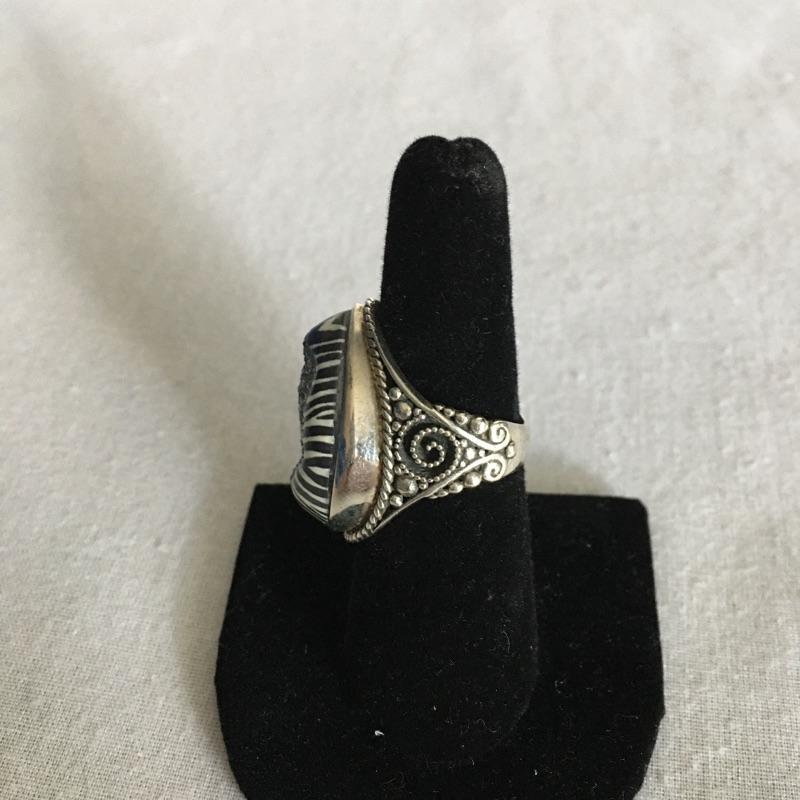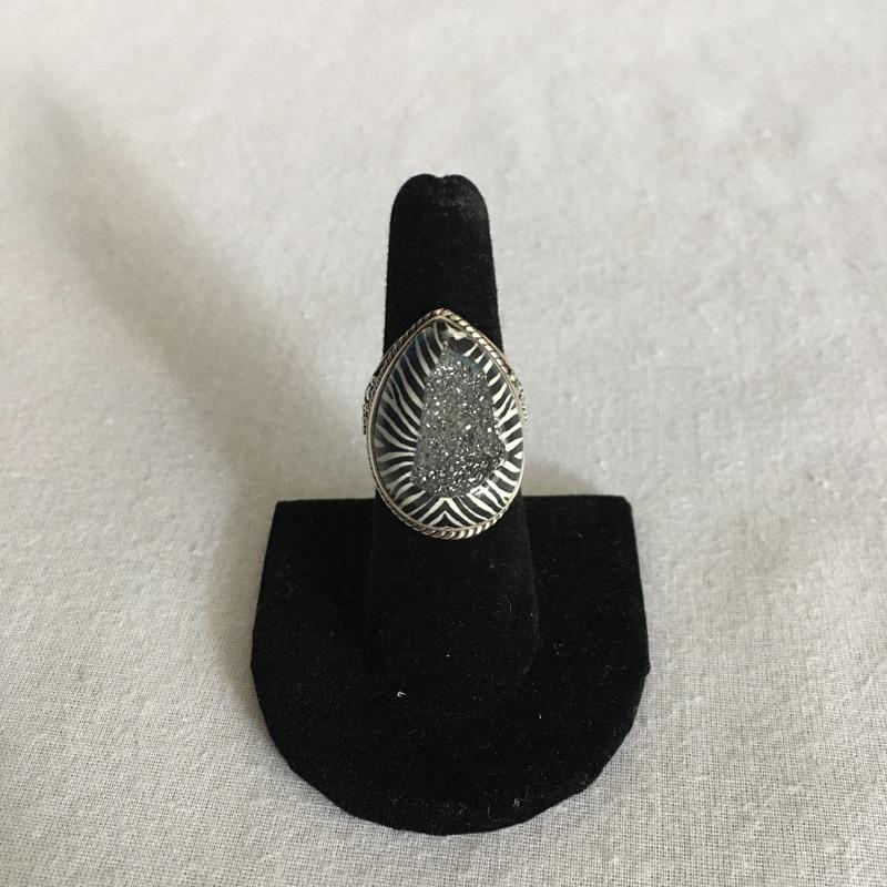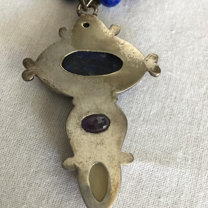 Sajen jewelry is silver with semi=precious stones that are proposed to be healing stones all put together to produce gorgeous contemporary pieces. Many of these pieces include the classic Sajen Goddess face. Included is a ring with a teardrop druzy stone with a zebra print set in sterling silver, Sajen necklace set in sterling silver with natural stones and necklace with a face and stones set in sterling silver. All three pieces are marked 925.