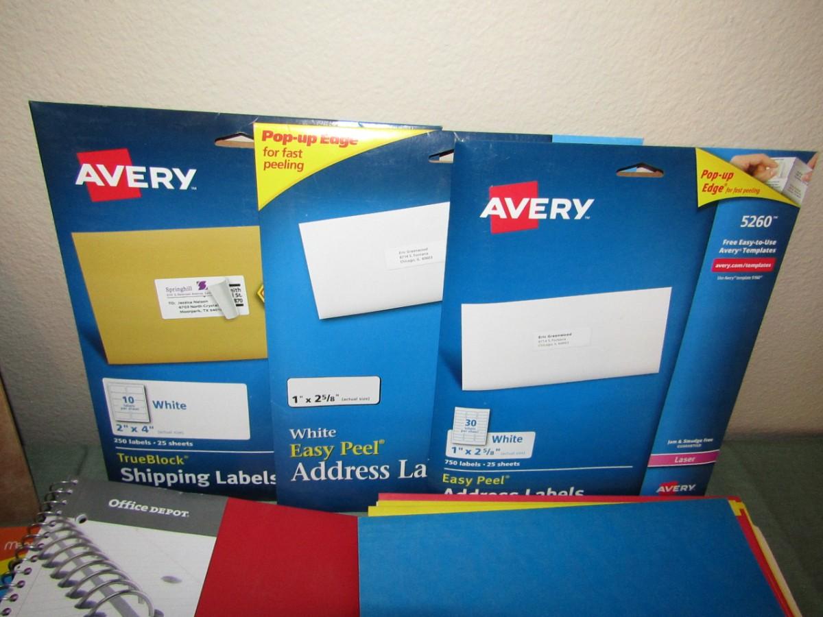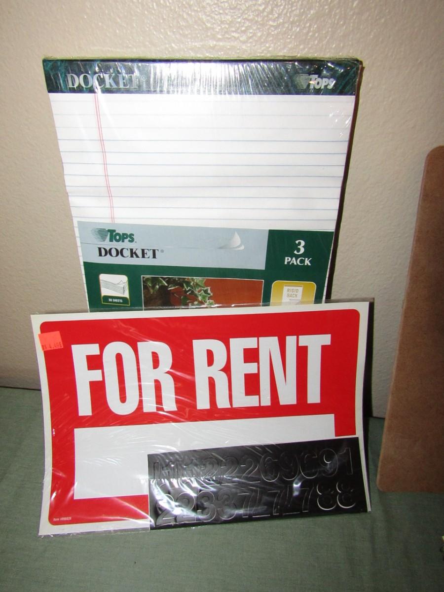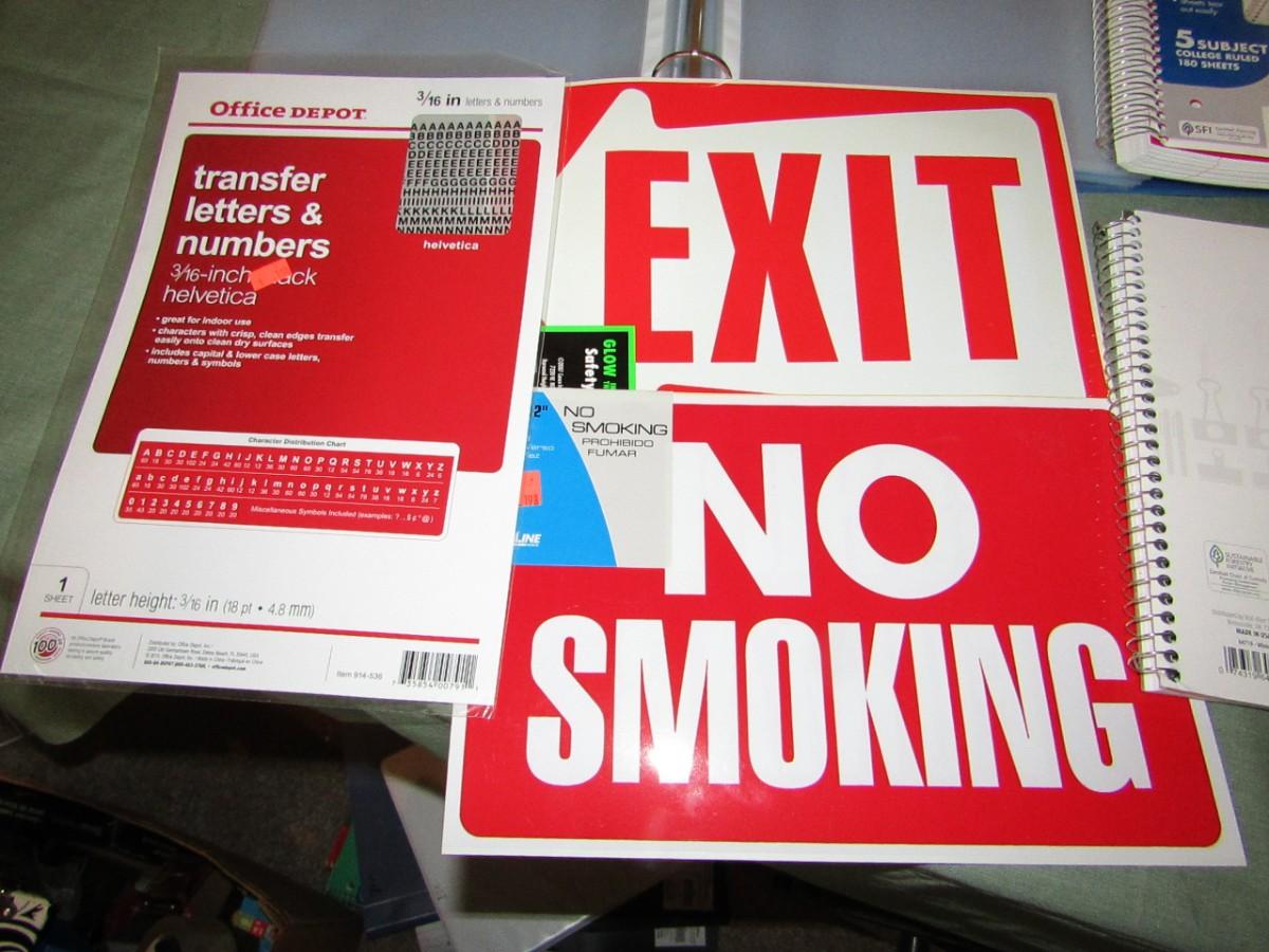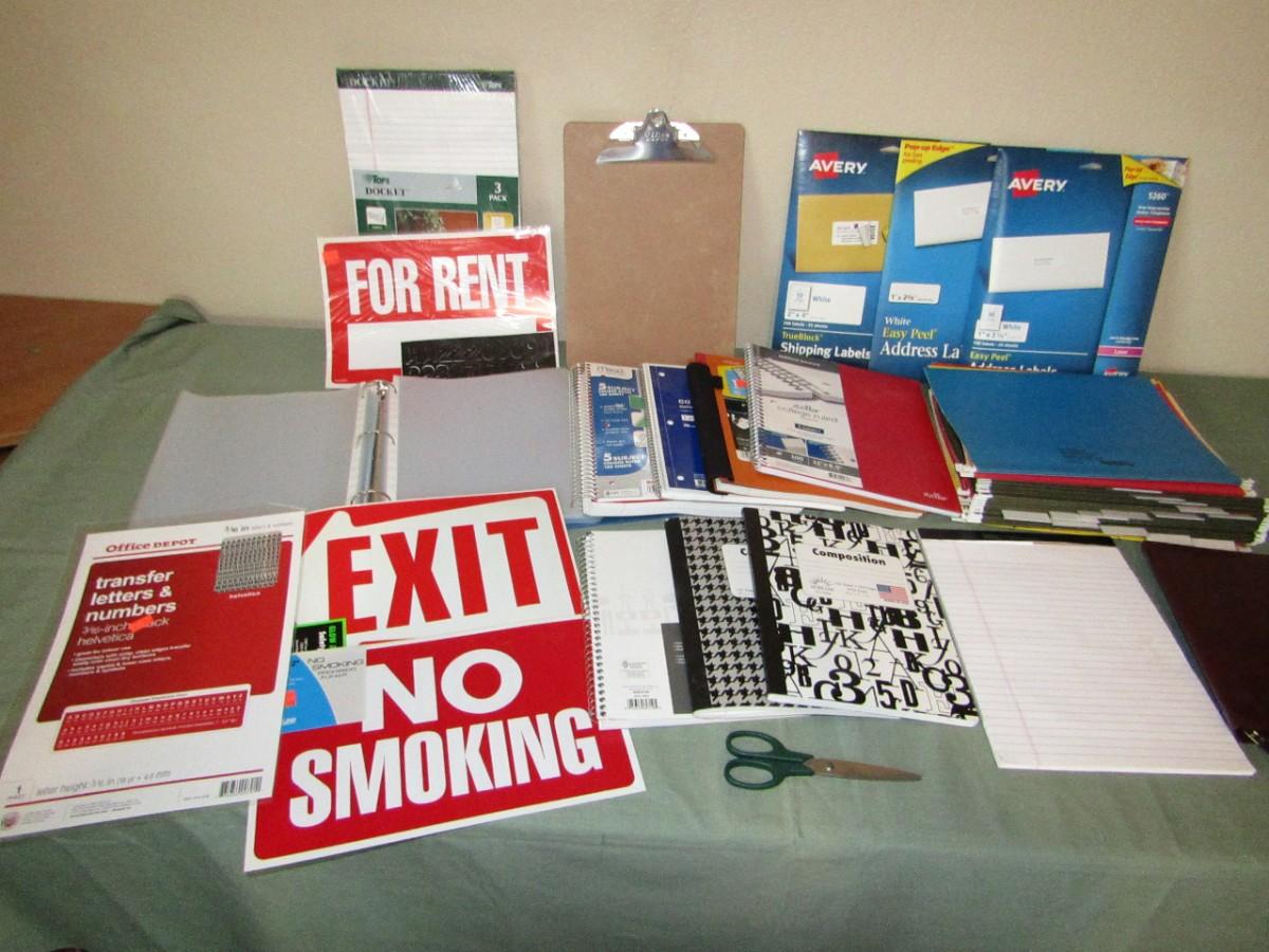 SIGNS: FOR RENT, NO SMOKING, AND EXIT, NOTEBOOKS, TRANSFER NUMBERS AND LETTERS, CLIP BOARD, PAGE PROTECTORS, DROP FOLDERS, AND SHIPPING LABELS