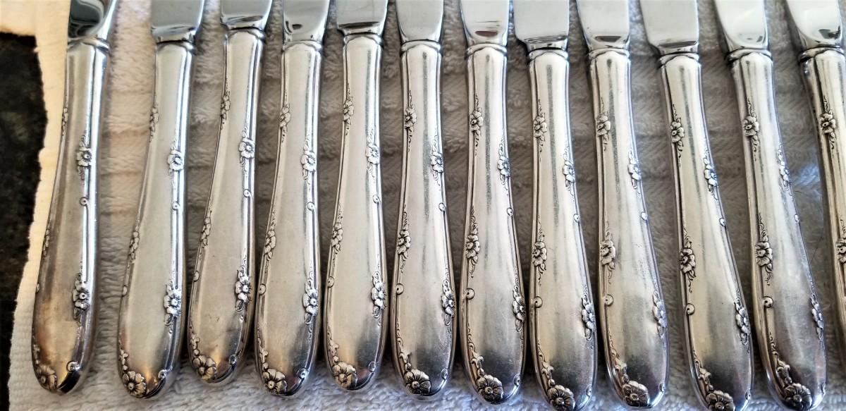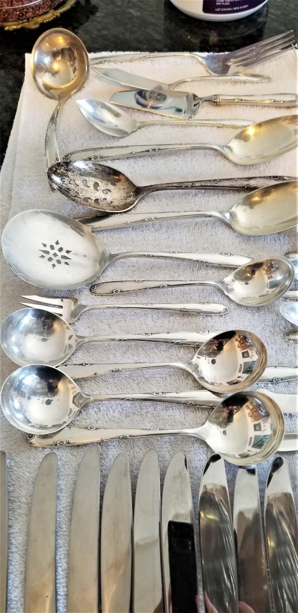 Large set of vintage Sterling Silver flatware in the "Madeira" pattern. You get all you see here: 10 salad forks, 11 dinner forks, 12 knives, 12 teaspoons, 6 spreaders, 12 seafood forks, 12 Iced tea spoons, 12 ice cream forks, 6 demitasse spoons, 4 cream soups, Lemon fork, 2 ladles, 13 assorted serving pieces. Entire set weighs approximately 104.75 Troy Ounces. The starting bid is just a little about the current scrap price.