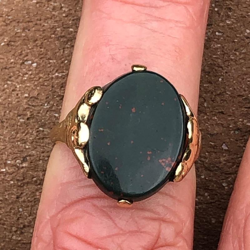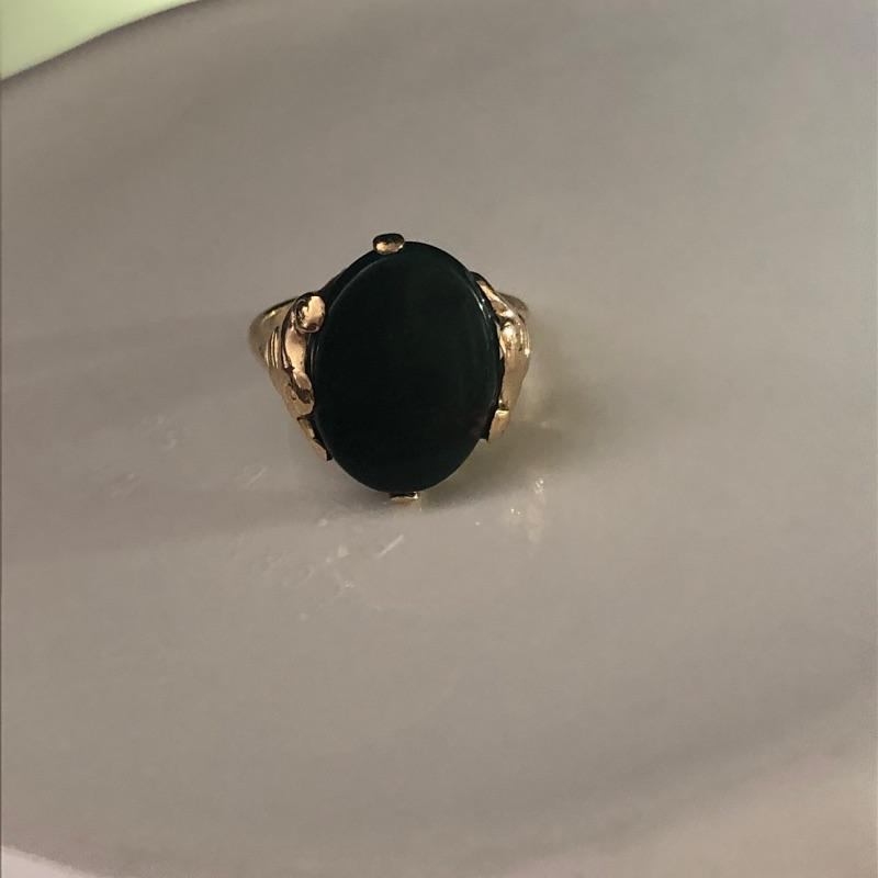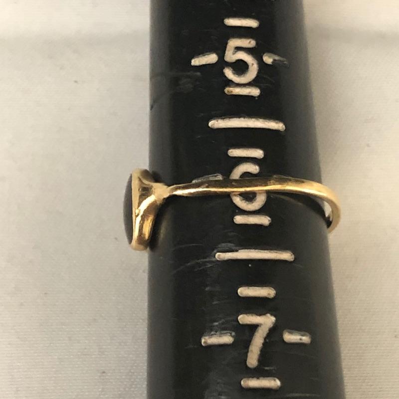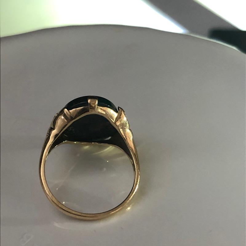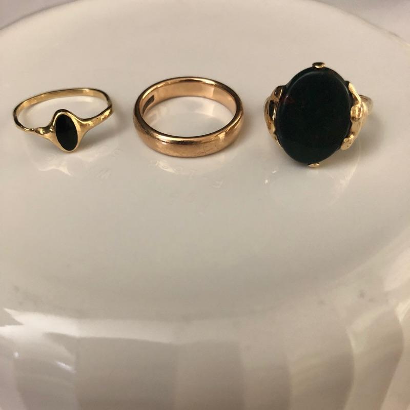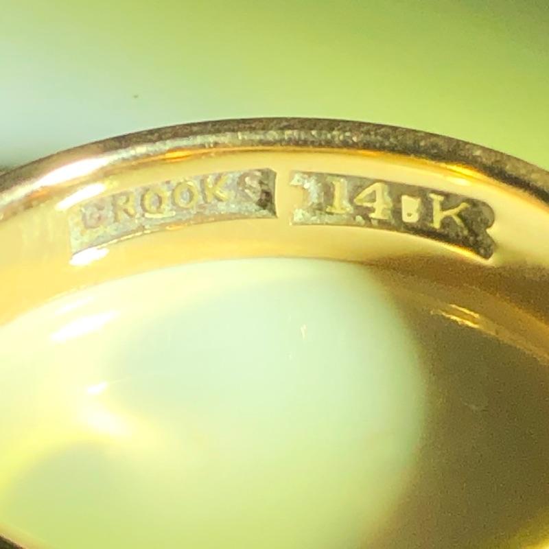 This Crooks 14K gold wedding band is accompanied by two stone rings also in 14K. The larger stone is a very attractive piece that looks black indoors but when in bright light it shows that it’s actually a green stone with red flecks. The smallest of the three rings has a square shaped band and a small black stone centerpiece. See images for markings and sizes.